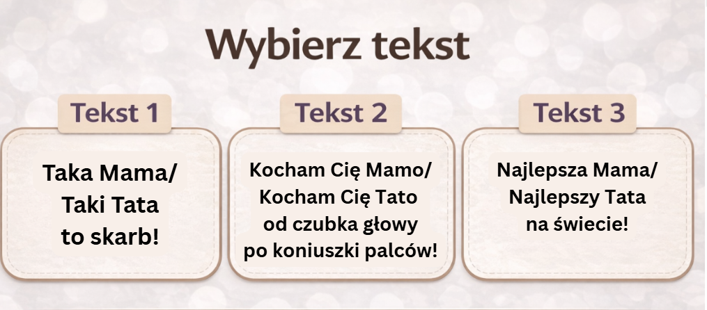 Możliwość umieszczenia personalizowanego, którego tekstu na produkcie - jeśli wybierasz tą opcję tekst wpisz w polu tekstowym.