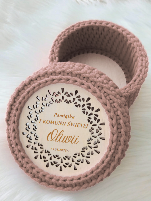 Pamiątkowy koszyczek pleciony ze sznurka to nie tylko stylowy organizer na dziecięce skarby – to wyjątkowa, ręcznie wykonana pamiątka I Komunii Świętej.