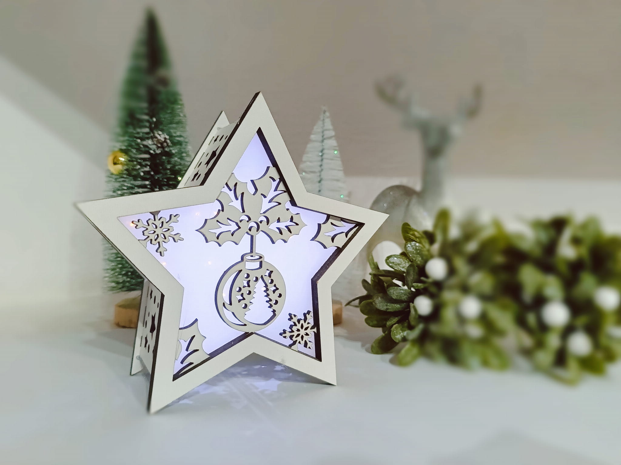 Piękna dekoracja podświetlana w kształcie gwiazdy z motywem bombki to wyjątkowy dodatek do Twojego wnętrza na Święta Bożego Narodzenia. Produkt ma wymiary 15x15 cm, a jego grubość wynosi 6 cm, dzięki czemu idealnie nadaje się na półkę, parapet lub do ustawienia w świątecznej aranżacji stołu.