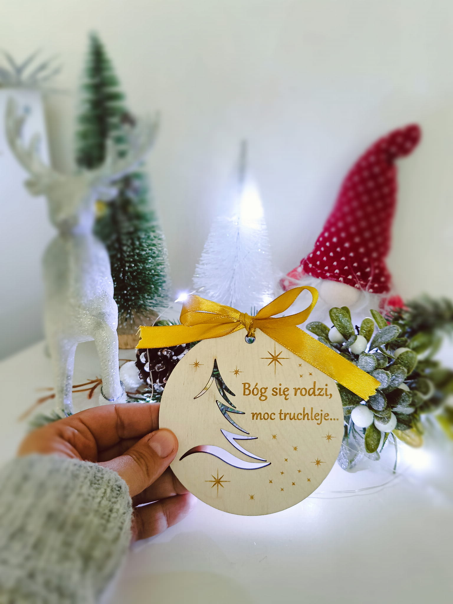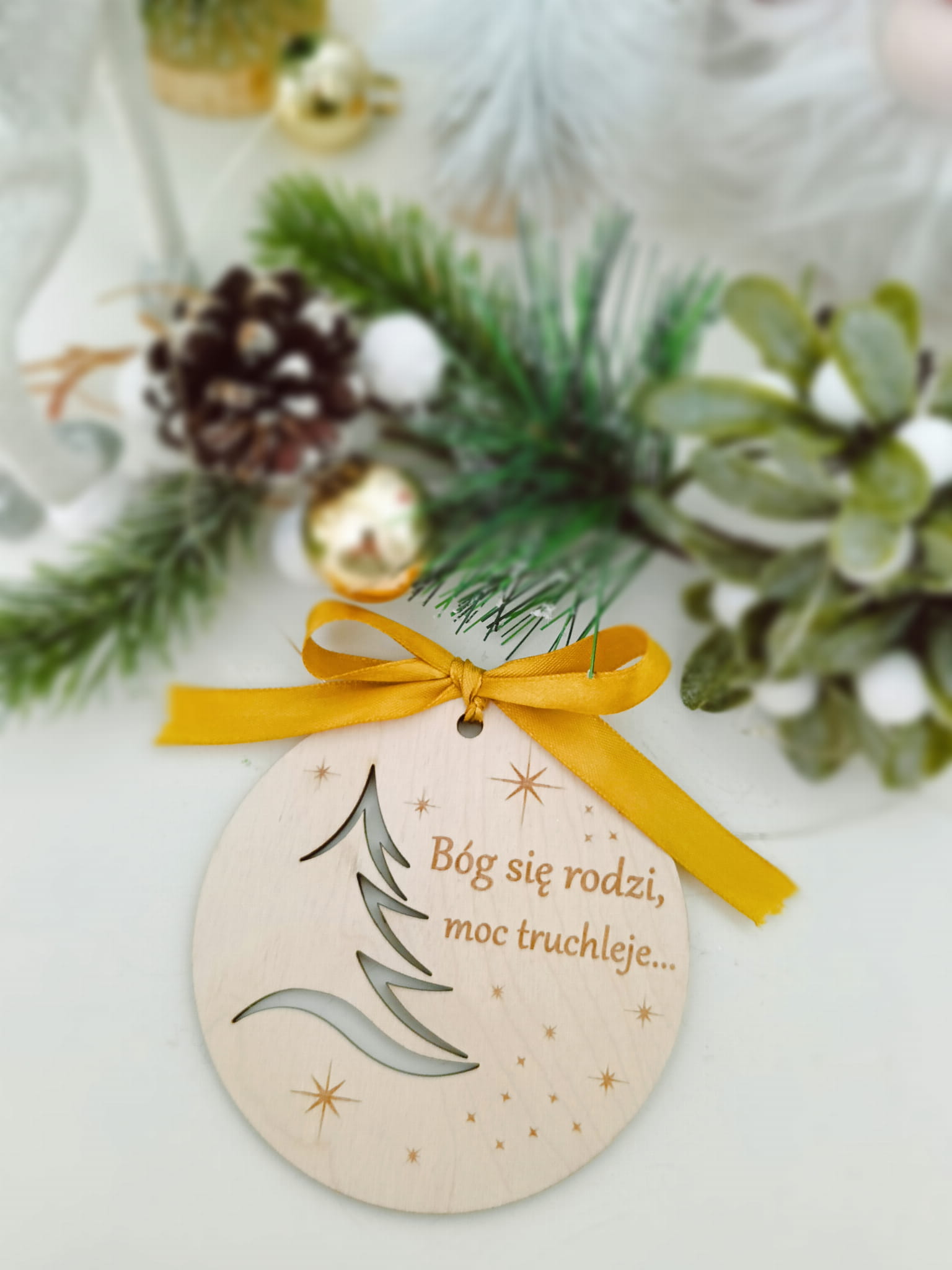Wprowadź świąteczną atmosferę do swojego domu dzięki eleganckiej, drewnianej bombce z ażurowym wzorem choinki. Ręcznie wykonana z precyzyjnym grawerem, ozdobiona dowolnym napisem, idealnie komponuje się z klasycznymi dekoracjami świątecznymi. Bombka wykonana jest z naturalnej sklejki, co nadaje jej wyjątkowej trwałości i estetyki.