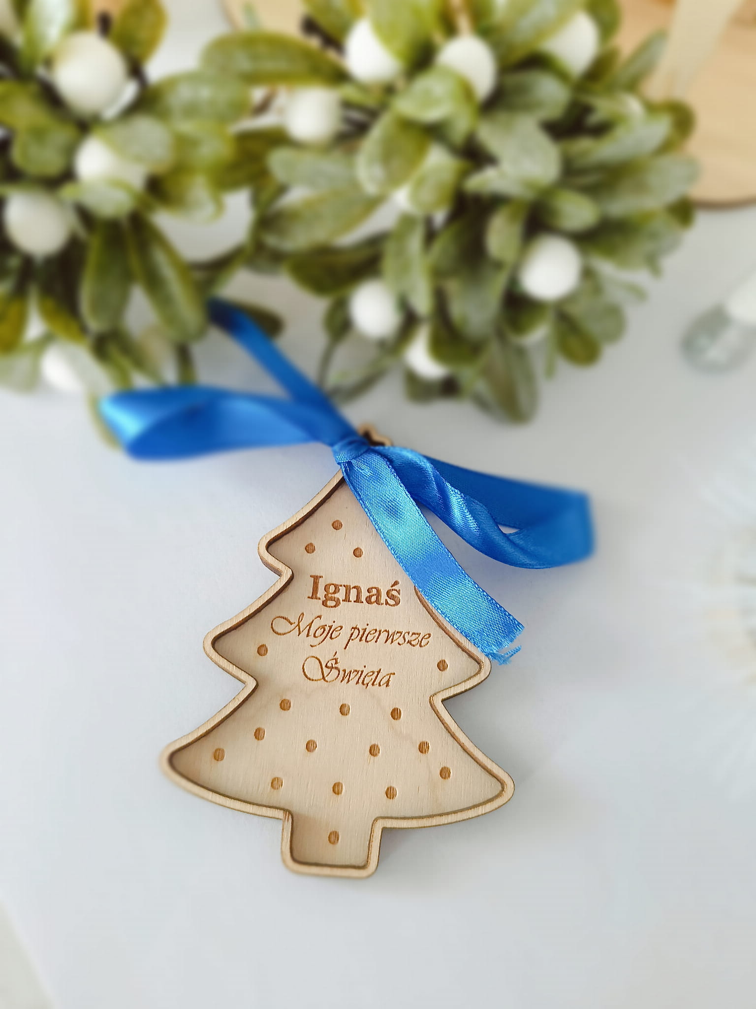 Choinka z kropeczkami 3D- personalizowana bombka choinkowa drewniana