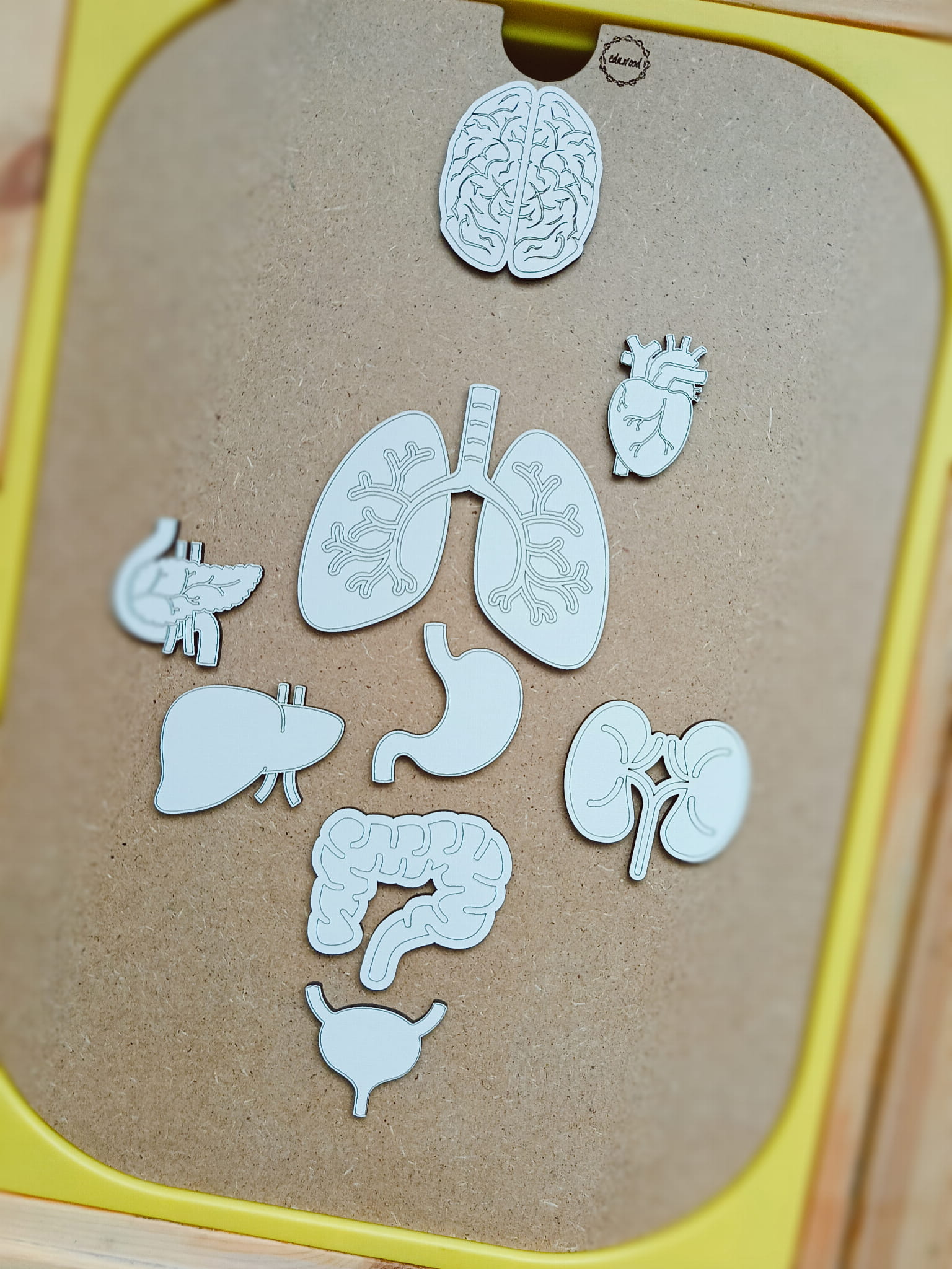 - ruchome elementy z narządami - serce, płuca, nerki, mózg, wątroba, trzustka, żołądek, jelito grube, pęcherz. Elementy można samodzielnie pokolorować.