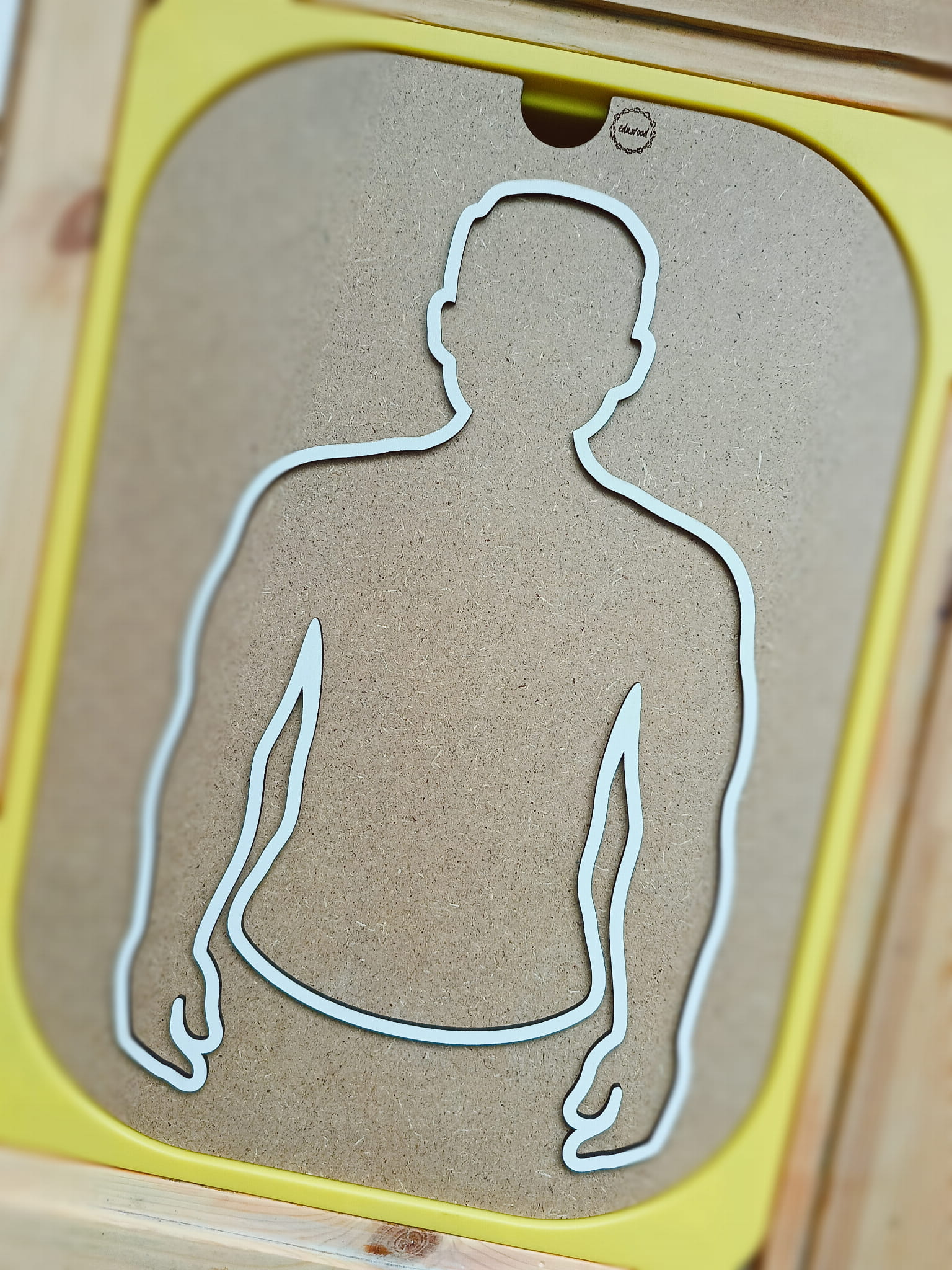 - drewnianą podstawę z konturem torsu człowieka, która rozmiarem pasuje do dużego pojemnika Ikea Trofast (posiadanie pojemnika nie jest konieczne do użytkowania produktu - wystarczy płaska, stabilna powierzchnia np. stół czy podłoga).