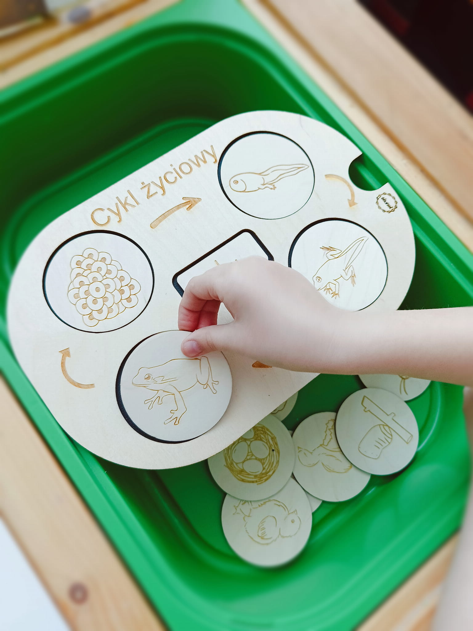 Drewniana układanka "Cykle Życiowe" z ruchomymi elementami (żetonami) jest doskonałym narzędziem do połączenia zabawy z nauką, inspirując dzieci do odkrywania fascynującego świata przyrody w sposób interaktywny i angażujący.