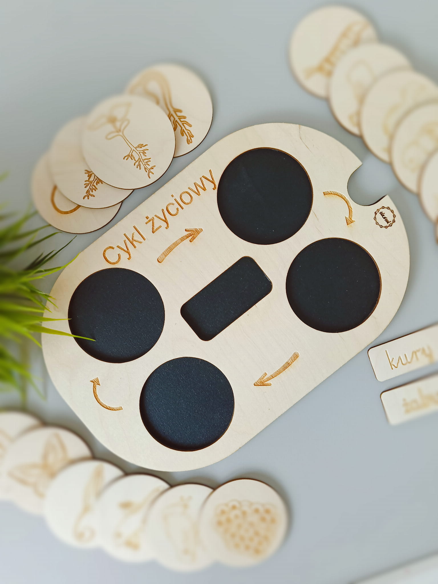 Wariant 2: nakładka z możliwością pisania i rysownia na niej kredą + zestaw 16 żetonów z grafikami przedstawiającymi cykl życiowy kury, motyla, żaby, fasoli (po 4 żetony do każdego cyklu) oraz 4 elementy z napisami. Średnica żetonów 68mm, grubość: 3mm.