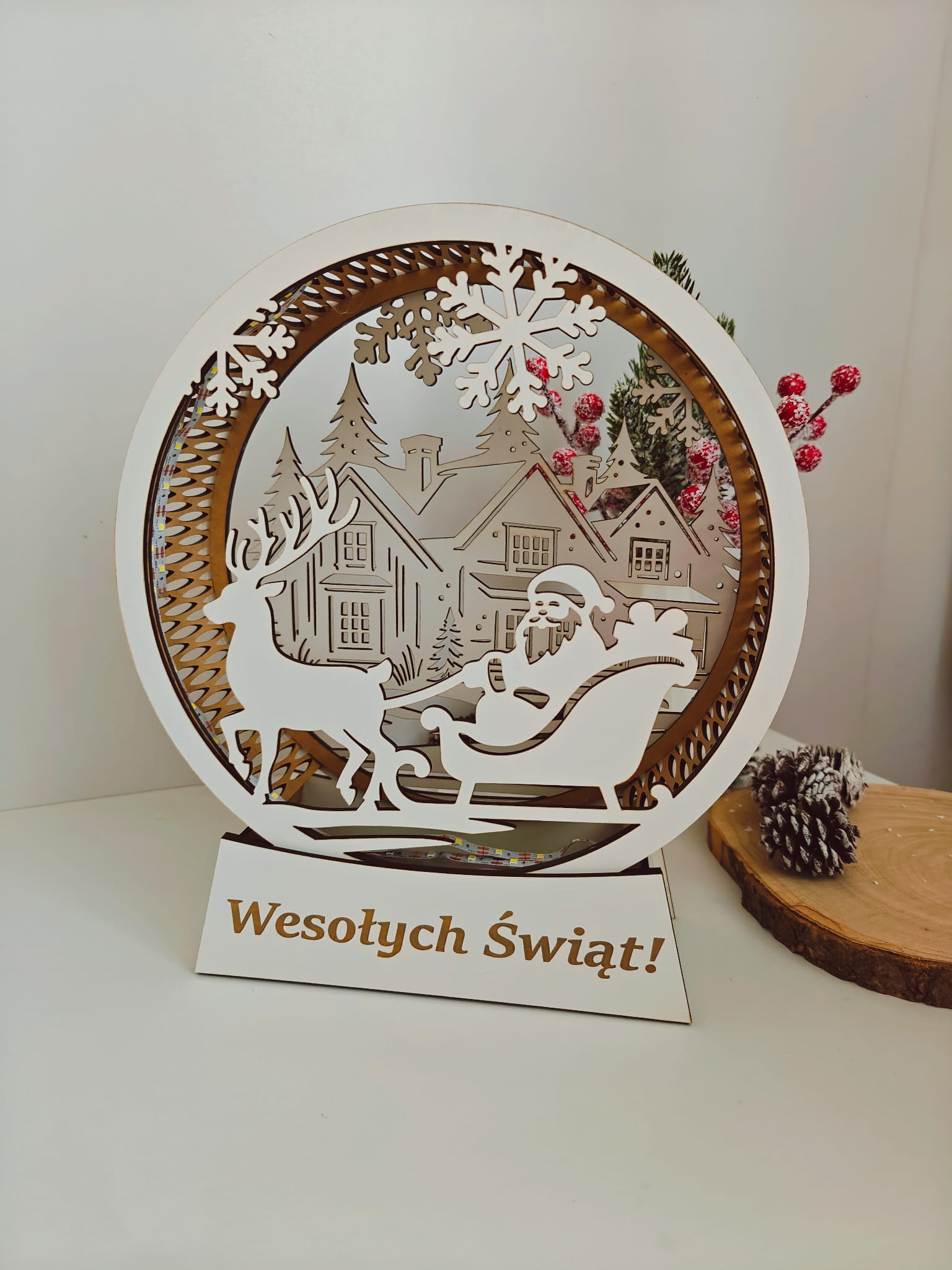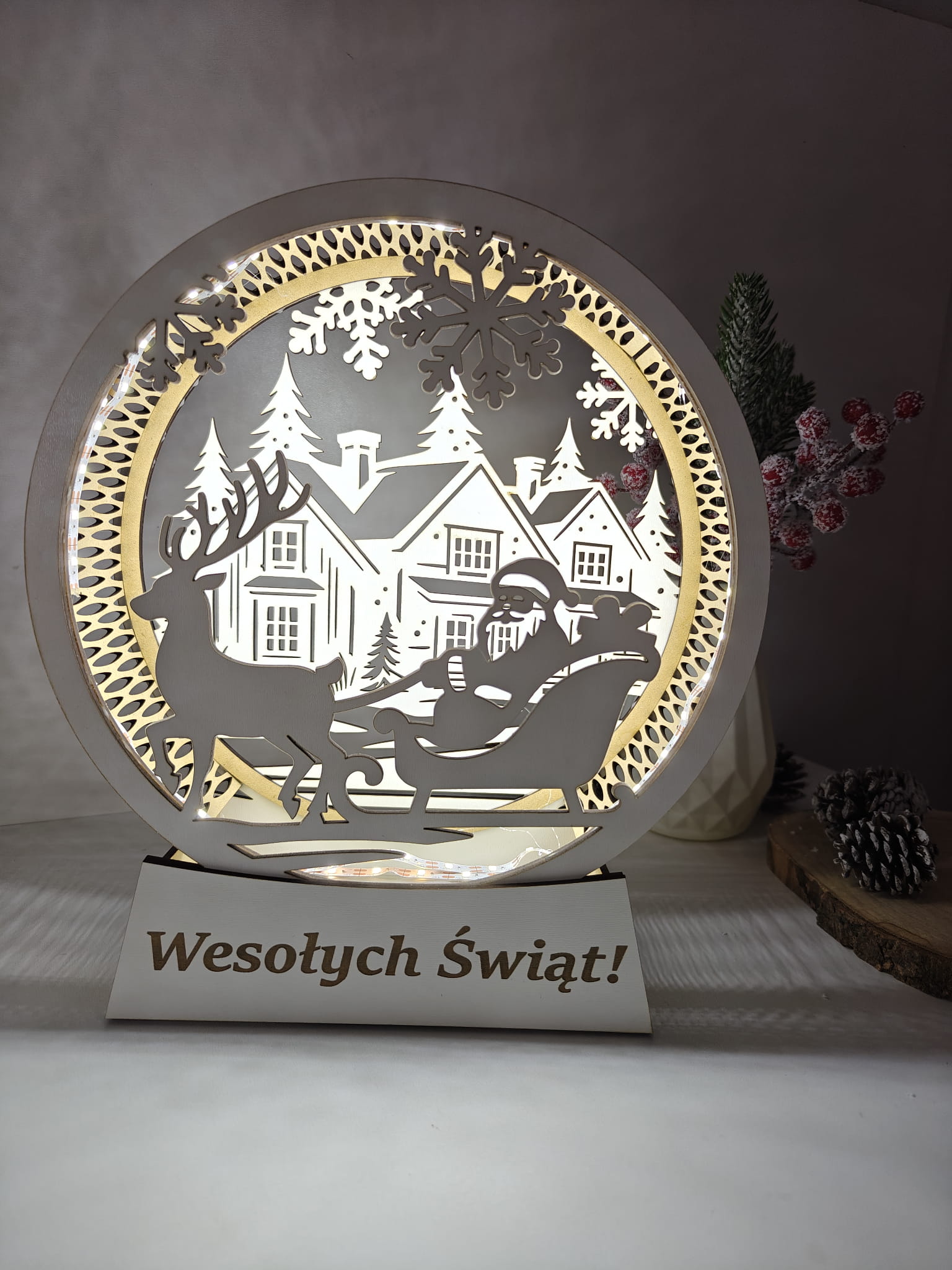 Elegancka, podświetlana dekoracja LED wykonana to wyjątkowy element świątecznego wystroju, który wprowadza ciepłą i magiczną atmosferę do wnętrza. Starannie wycinany wzór w połączeniu z podświetleniem LED tworzy efektowną ozdobę, idealną do postawienia na komodzie, parapecie, półce lub stole.