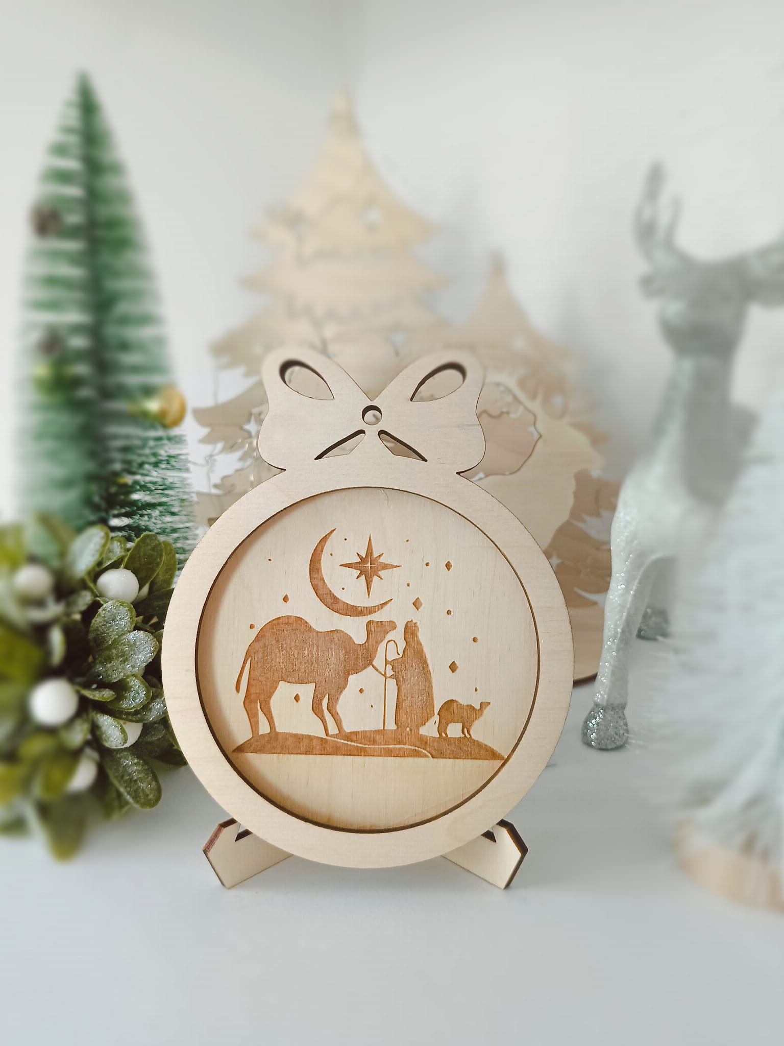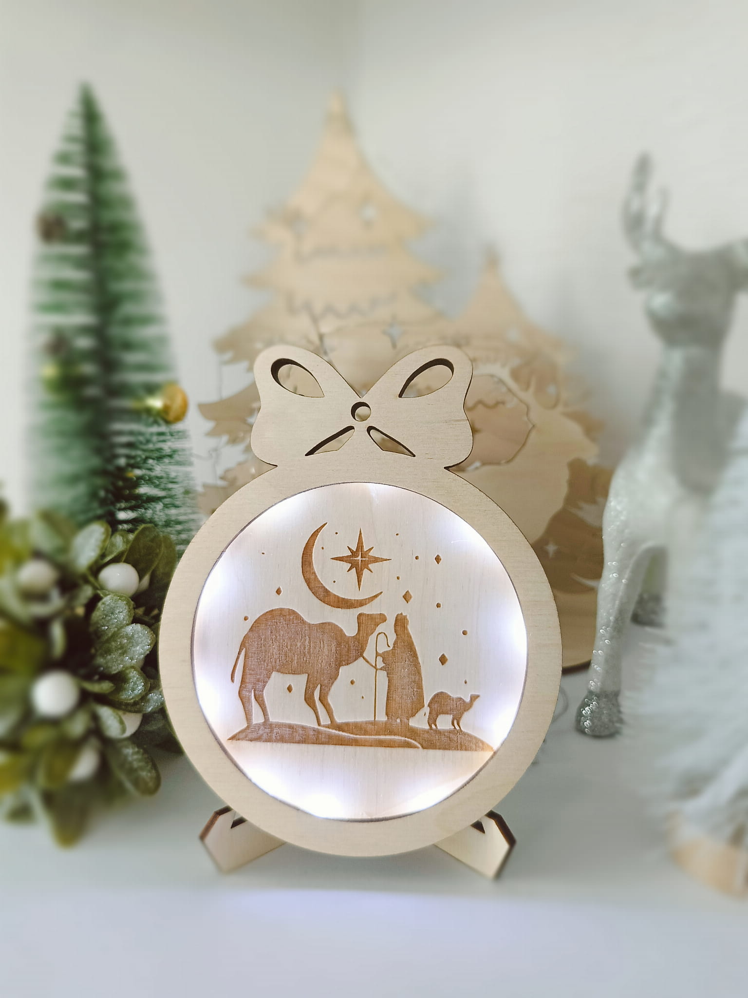 Ta wyjątkowa drewniana bombka 3D z grawerem nawiązującym do narodzenia Jezusa to idealna ozdoba na Boże Narodzenie. Dzięki delikatnemu podświetleniu LED, cała scena zyskuje ciepły blask, który doskonale komponuje się z każdym świątecznym wnętrzem. Bombka dostępna jest w dwóch kolorach: klasyczna biel oraz naturalny odcień drewna, co pozwala na dopasowanie do różnych stylów dekoracji.
