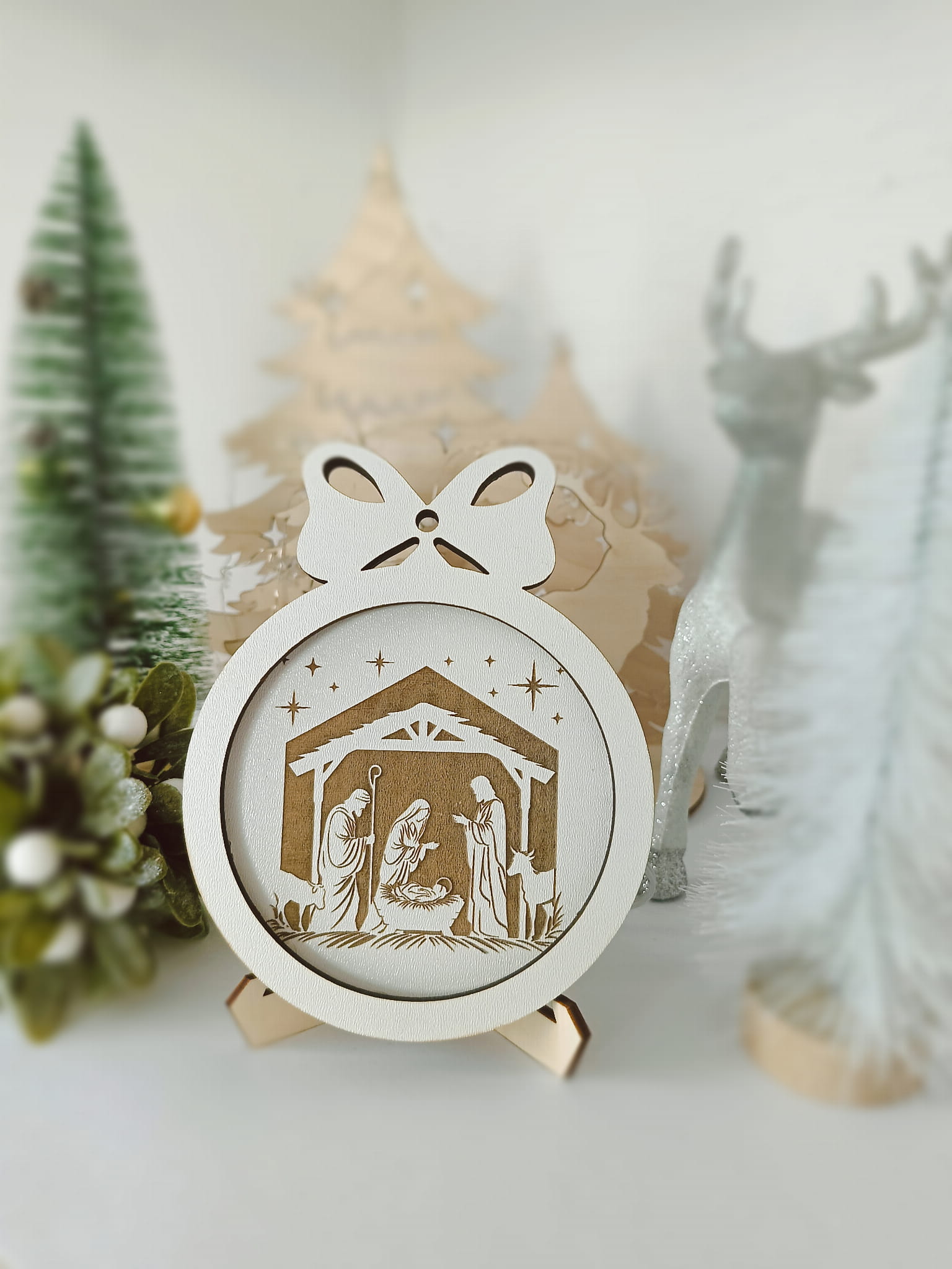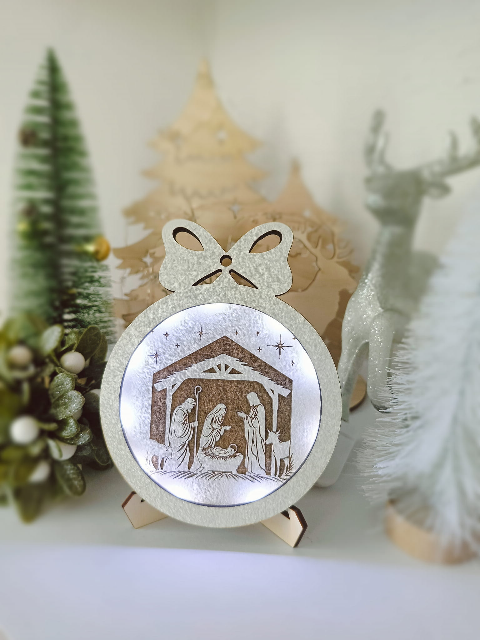 Drewniana grawerowana bombka 3D podświetlana LED z motywem szopki betlejemskiej