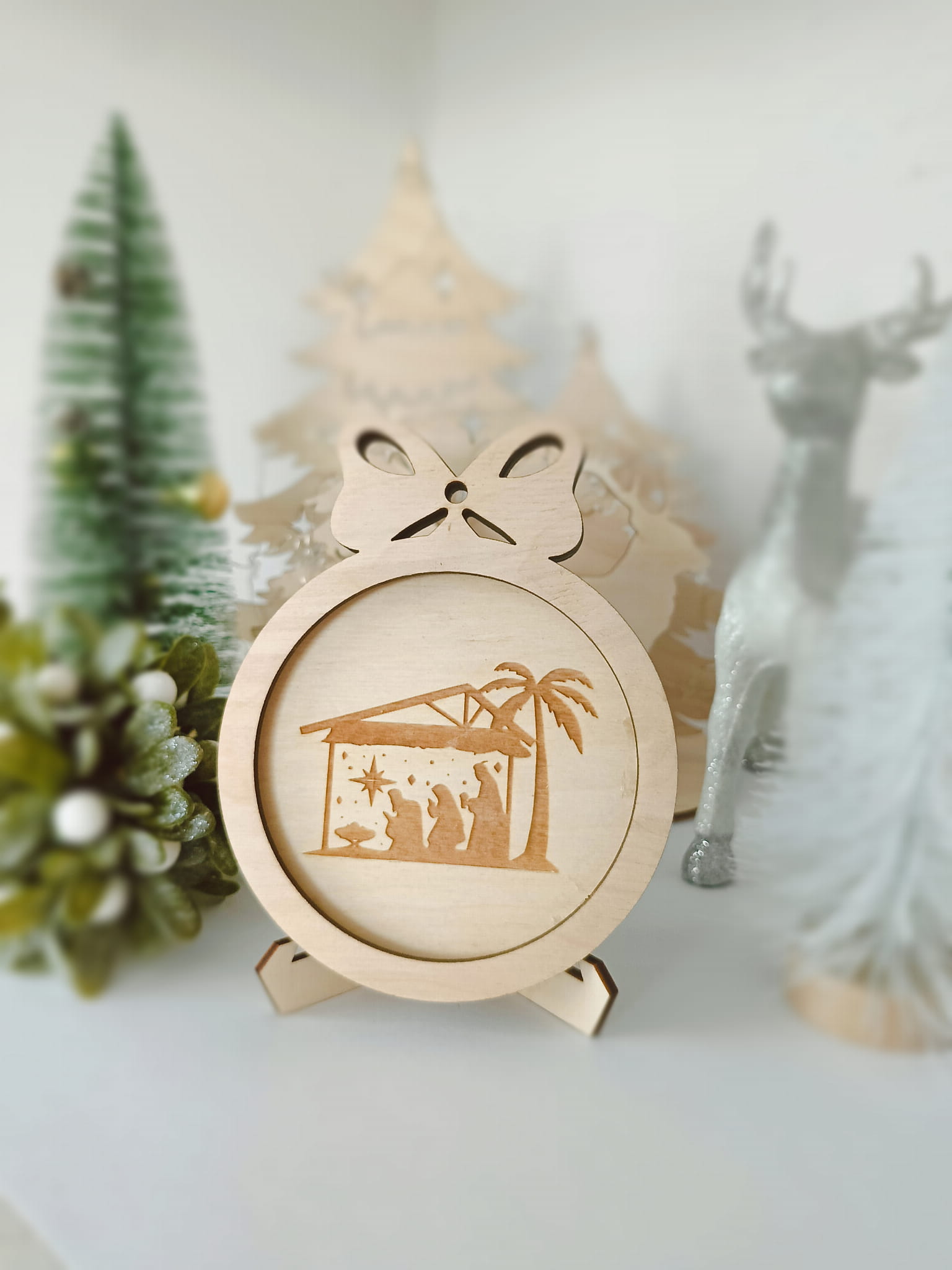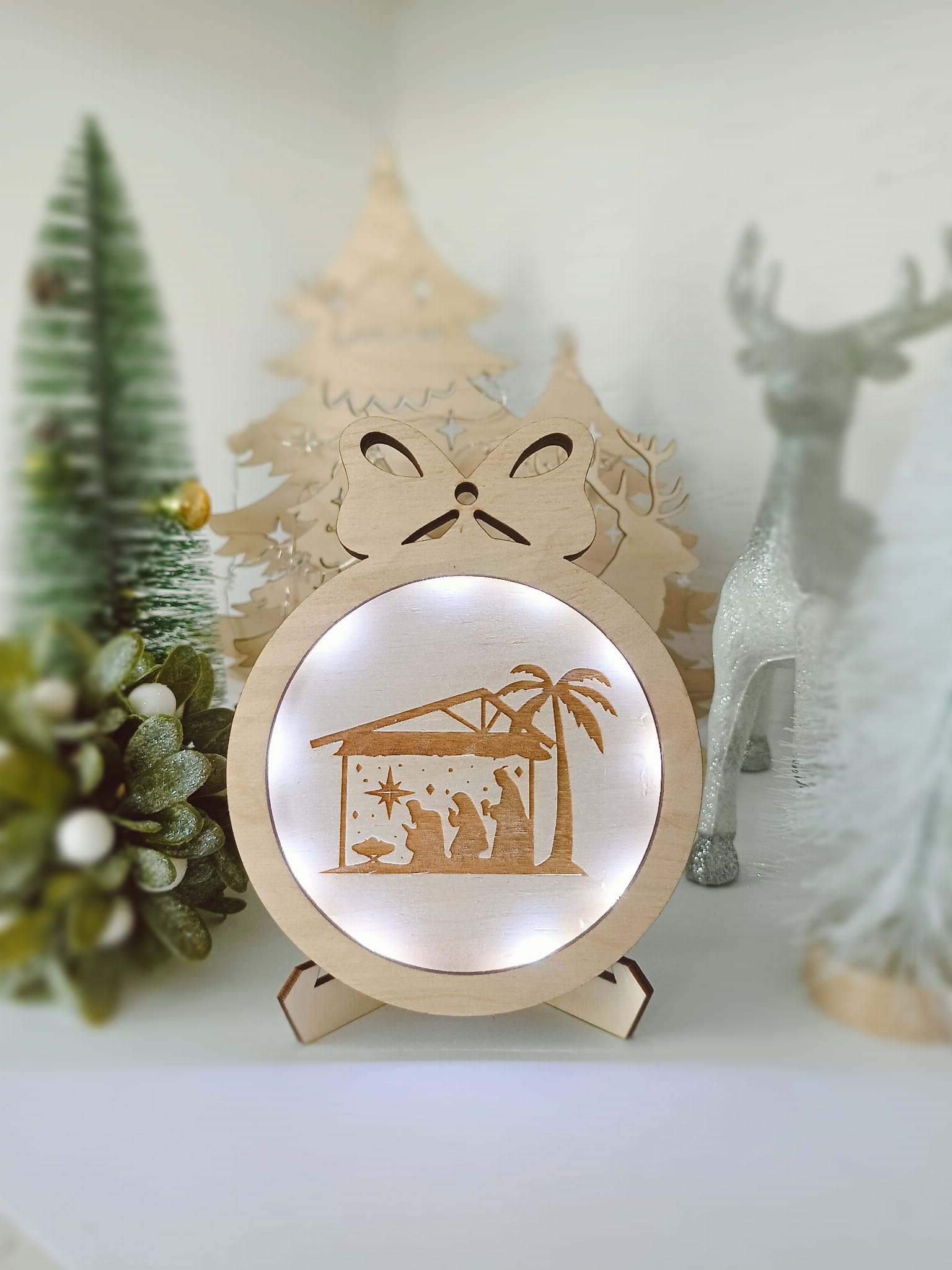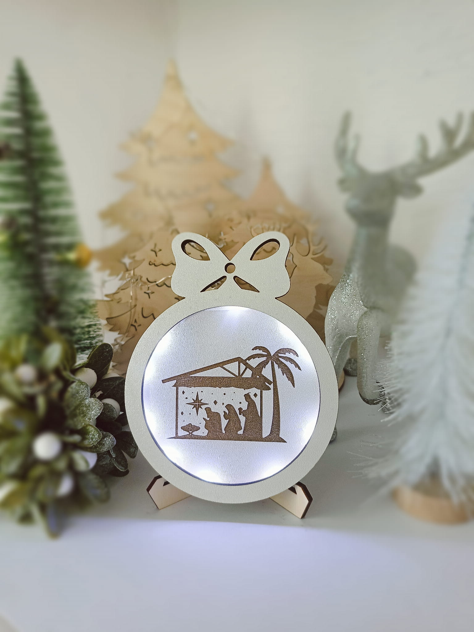 Drewniana grawerowana bombka 3D podświetlana LED z motywem szopki betlejemskiej pokłon Mędrców