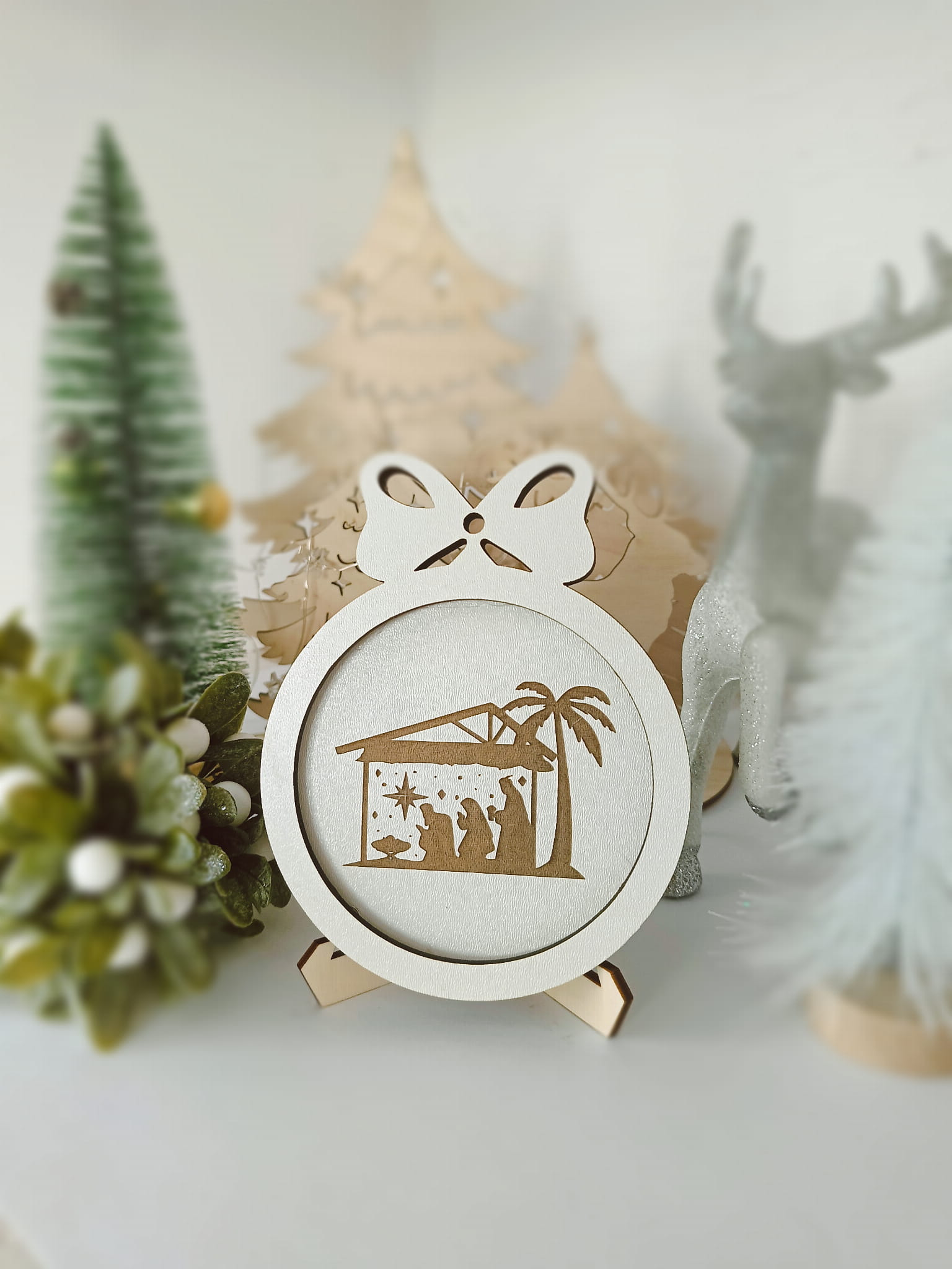 Ta wyjątkowa drewniana bombka 3D z grawerem nawiązującym do narodzenia Jezusa w szopce to idealna ozdoba na Boże Narodzenie. Dzięki delikatnemu podświetleniu LED, cała scena zyskuje ciepły blask, który doskonale komponuje się z każdym świątecznym wnętrzem. Bombka dostępna jest w dwóch kolorach: klasyczna biel oraz naturalny odcień drewna, co pozwala na dopasowanie do różnych stylów dekoracji.