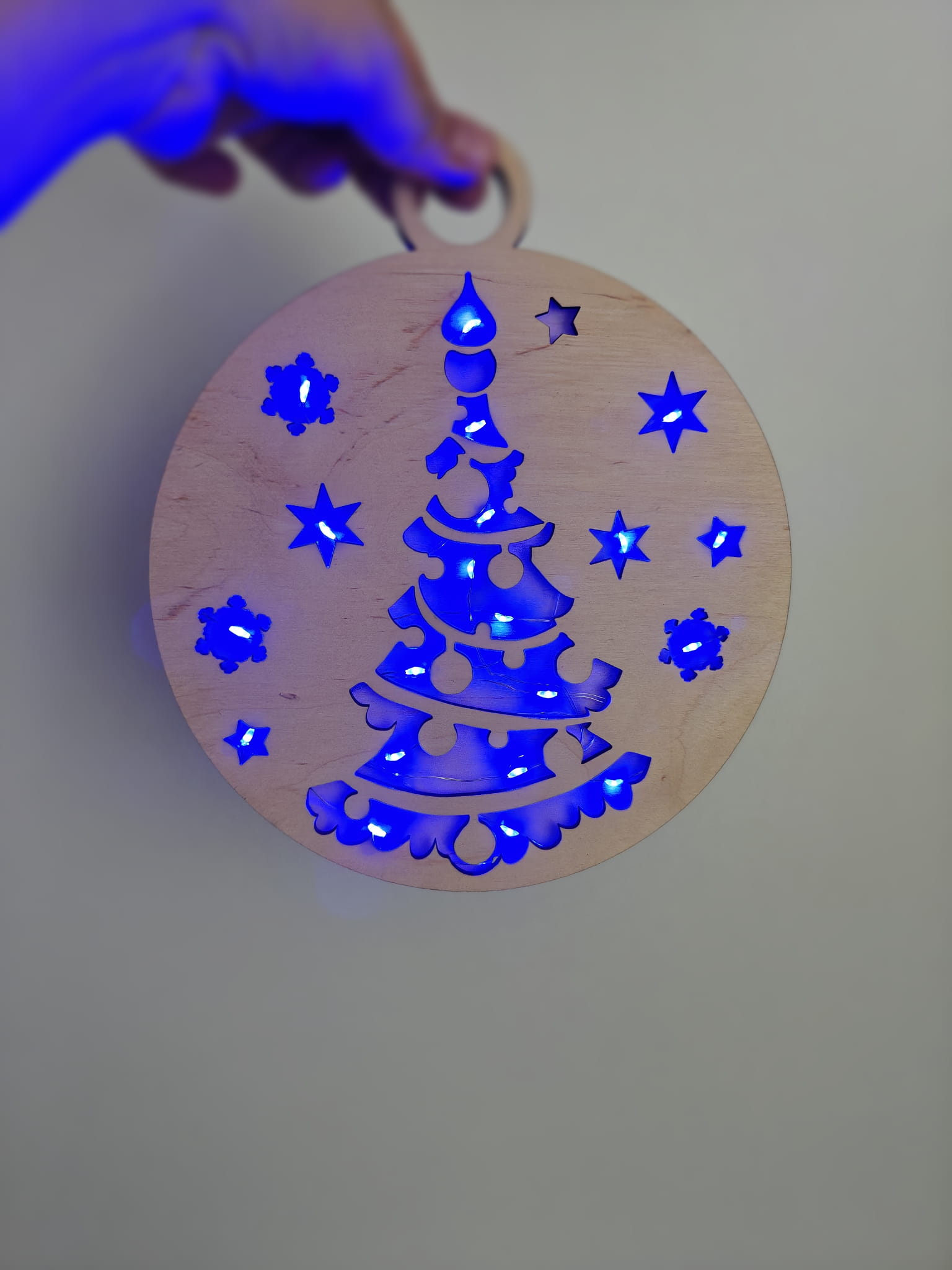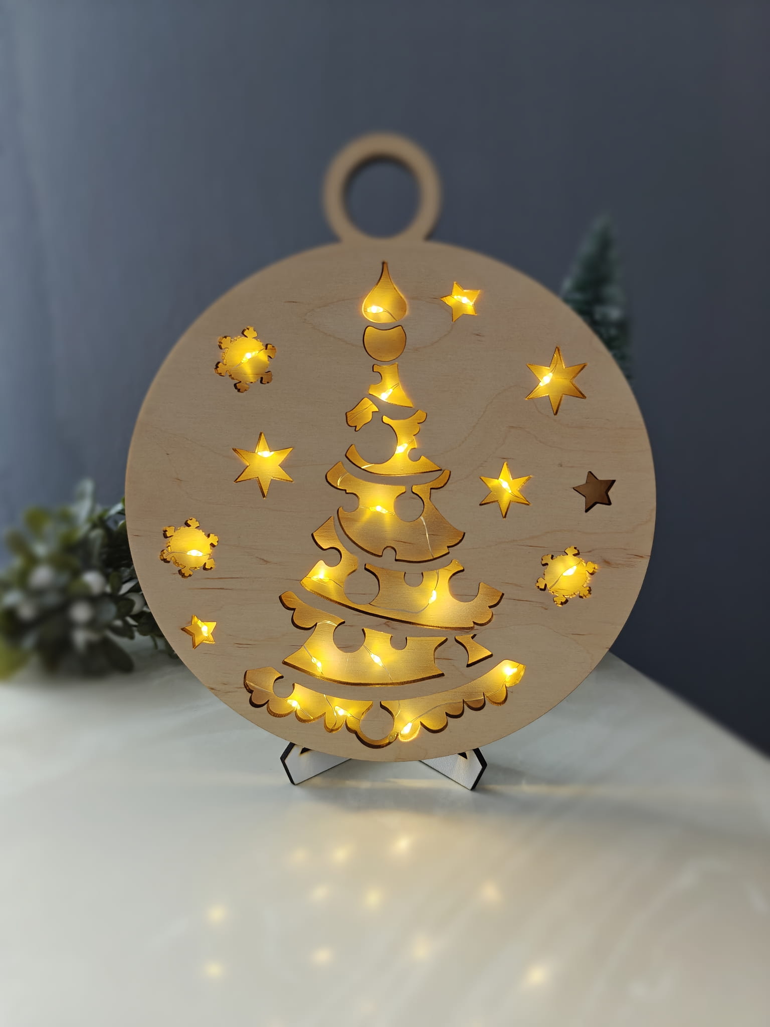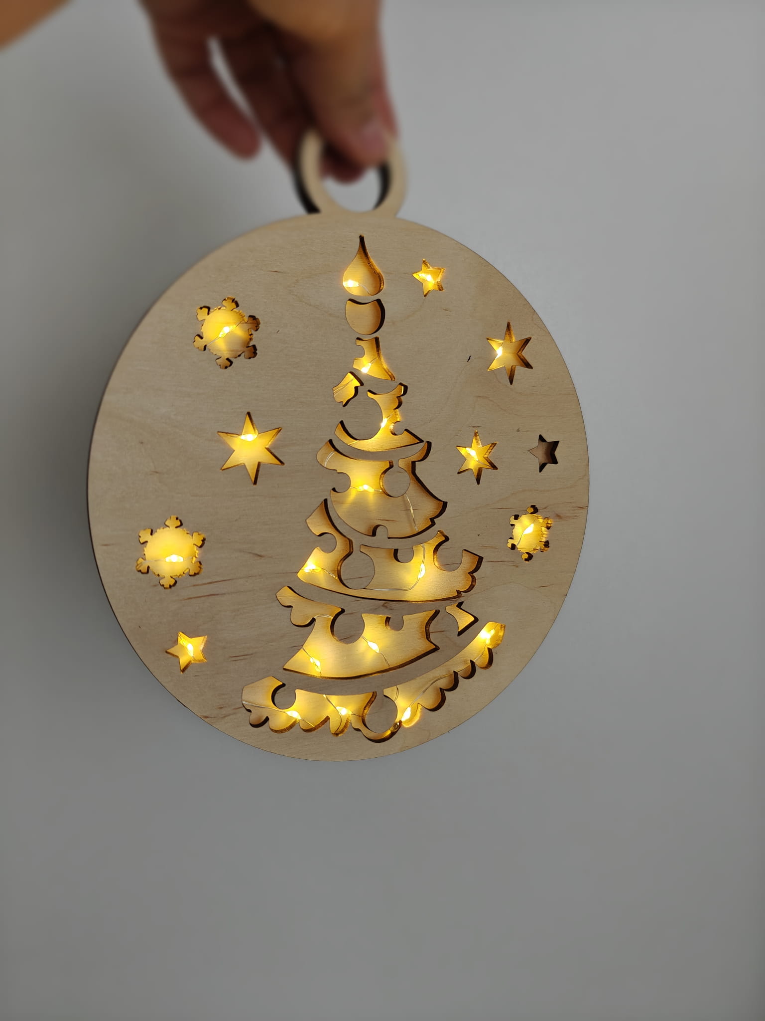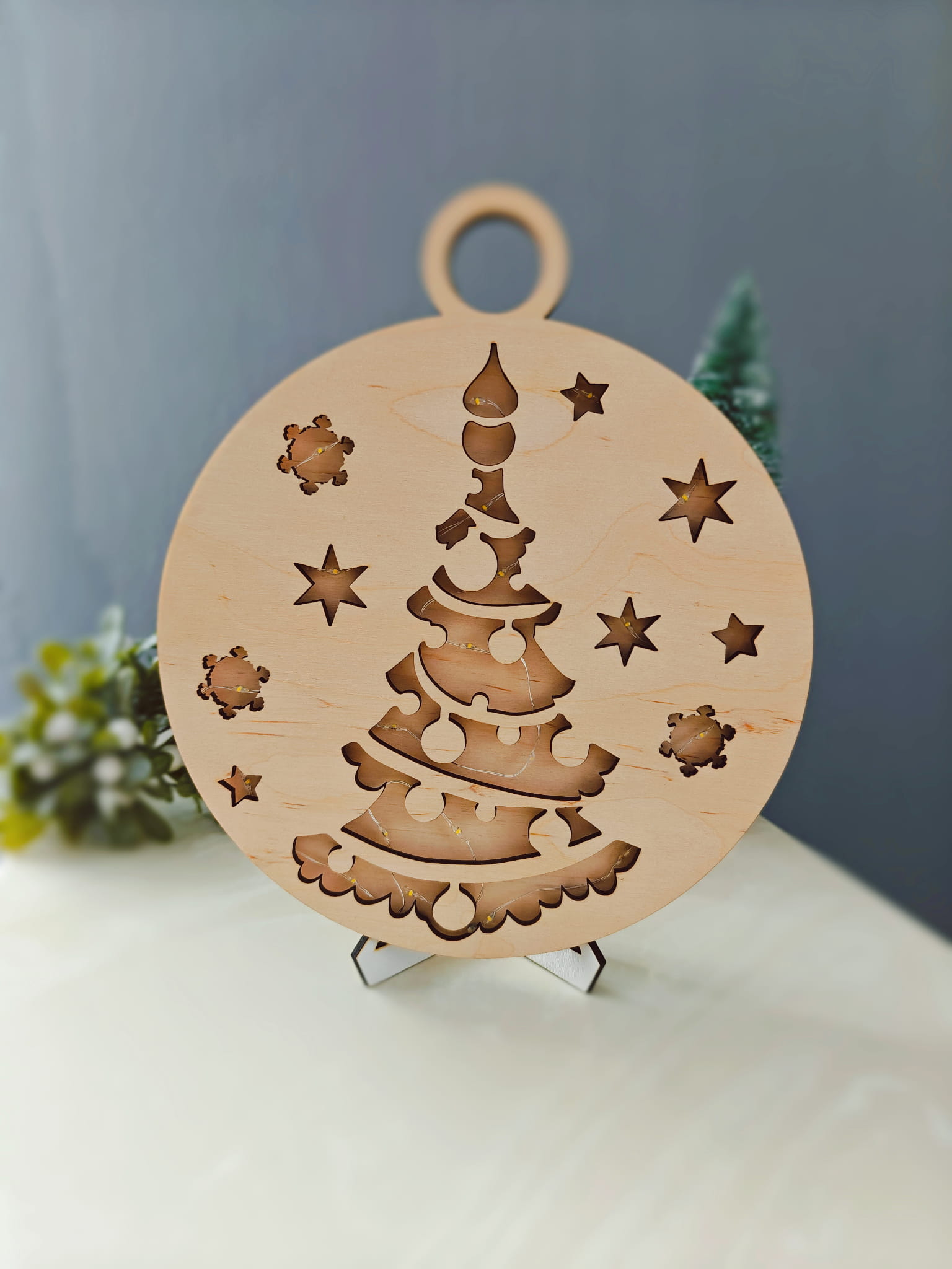 Drewniana podświetlana ażurowa bombka do zawieszenia świąteczna Boże Narodzenie