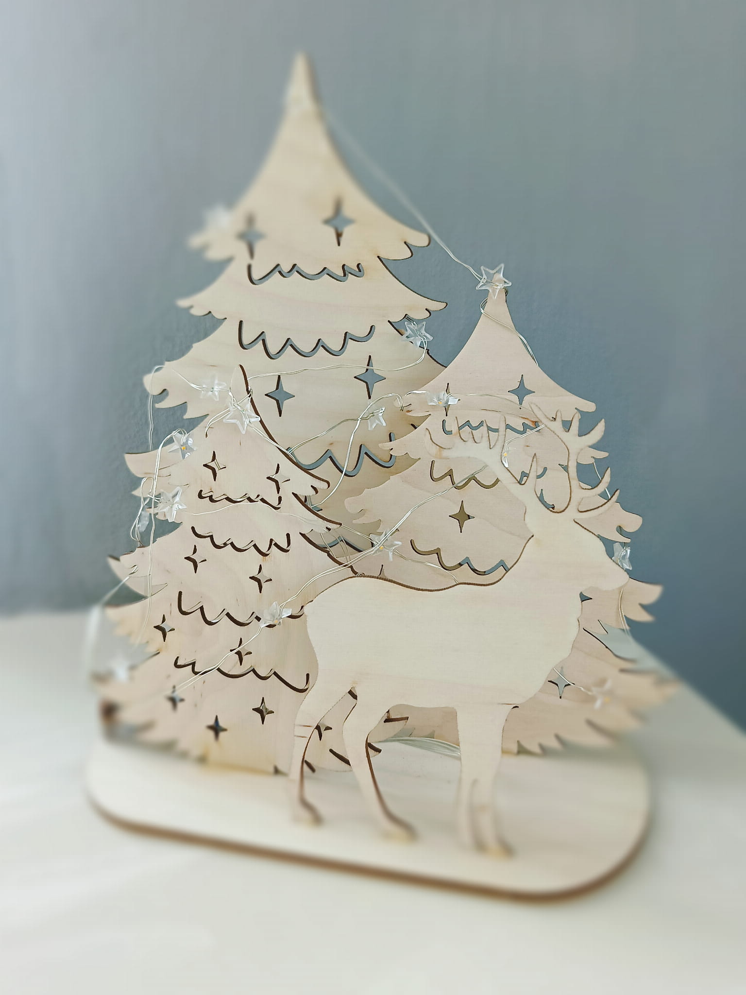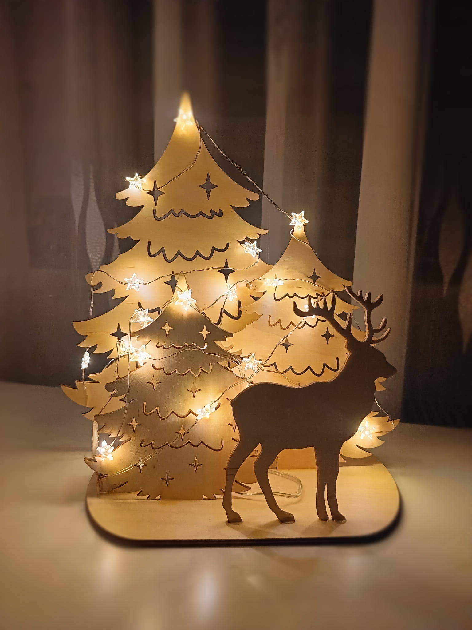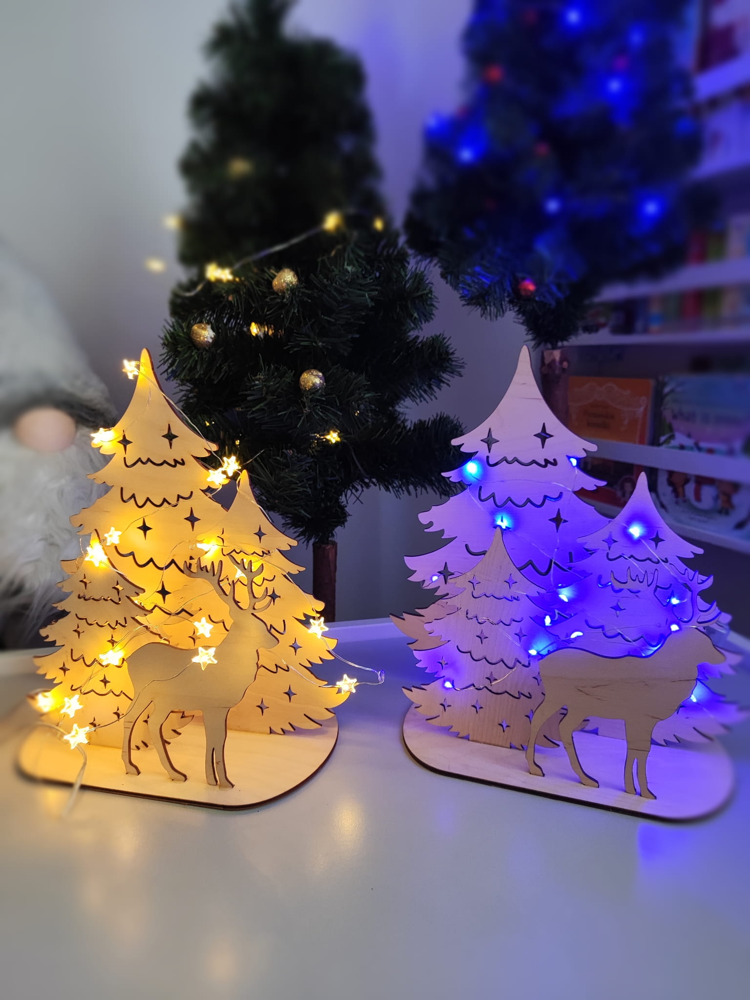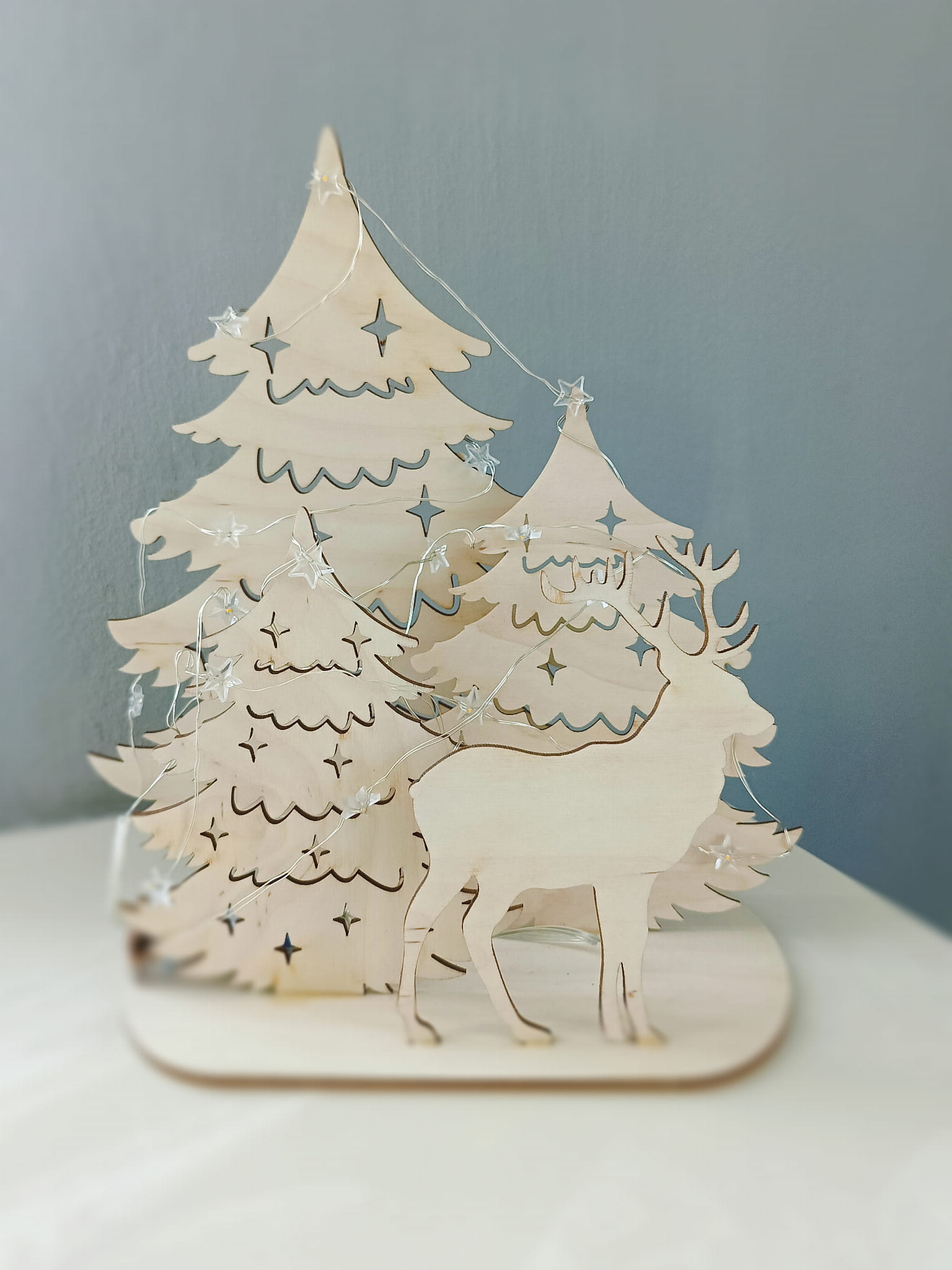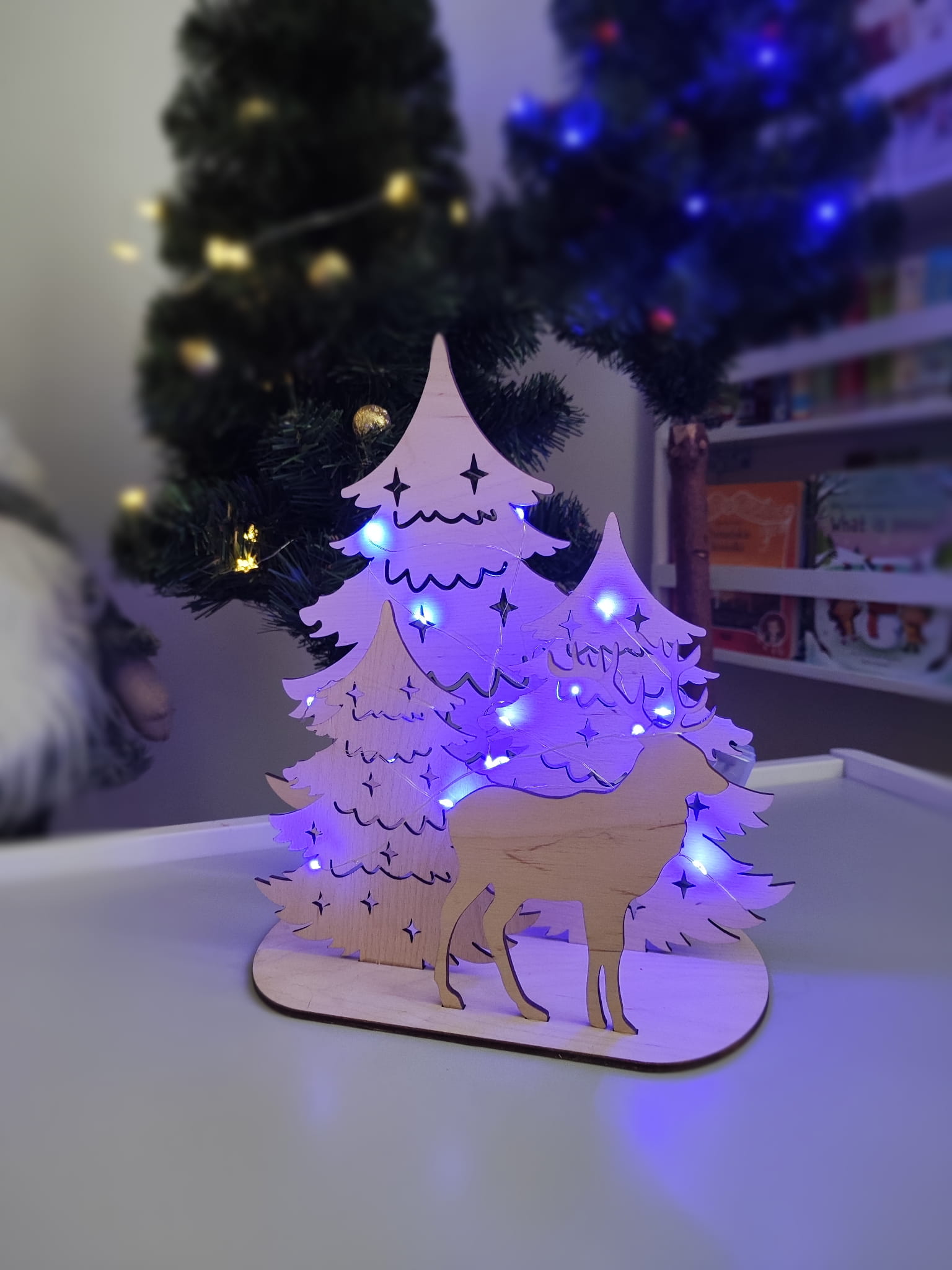 Drewniana podświetlana świąteczna dekoracja stojąca - choinki i renifer scenka zimowa