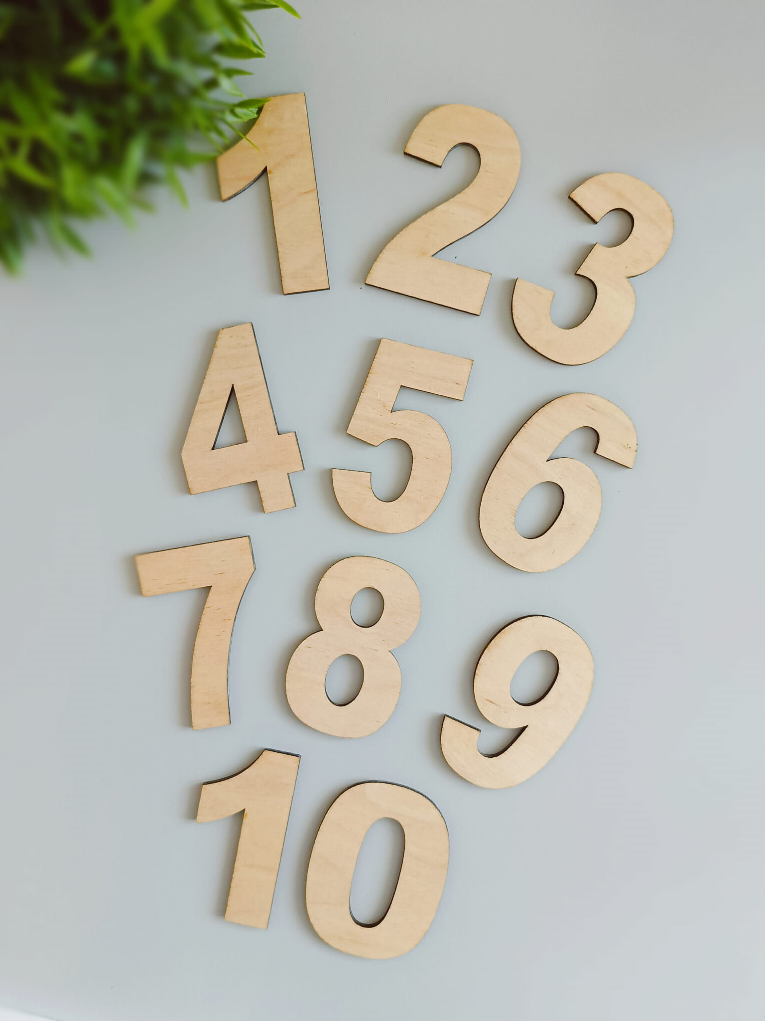 Zestaw 10 drewnianych cyferek, dzięki któremu nauka matematyki i poznawania cyfr odbywa się poprzez zabawę.