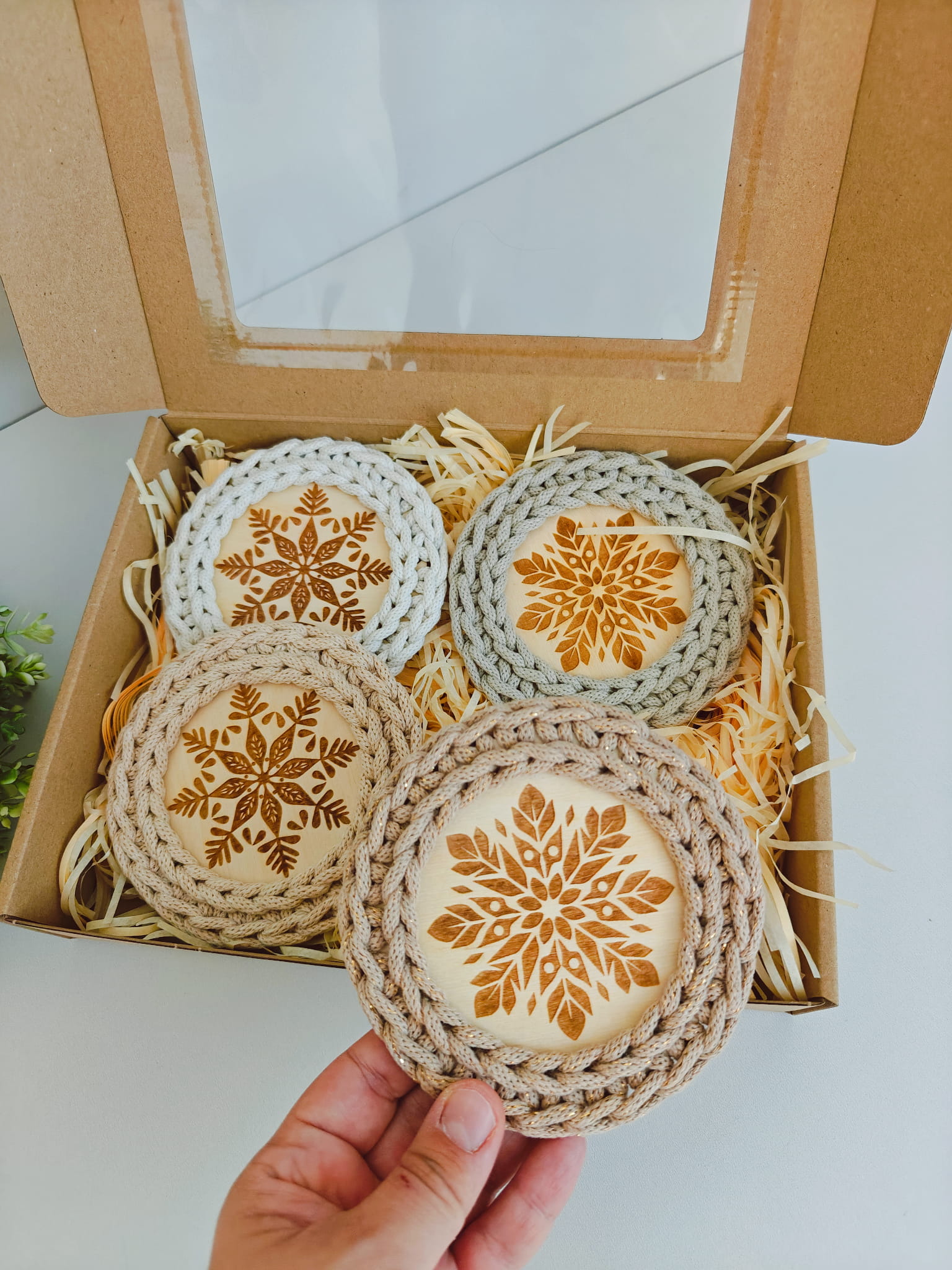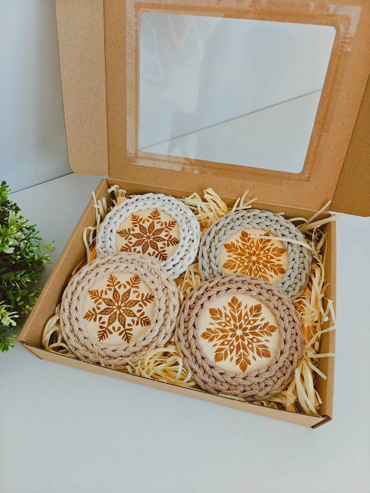 W zestawie znajdują się 4 drewniane podkładki wykonane ze sklejki 3mm i ozdobione grawerem śnieżynki. Każda z nich została starannie obszyta bawełnianym sznurkiem, dzięki czemu pięknie wpisuje się w klimat bożonarodzeniowych aranżacji.