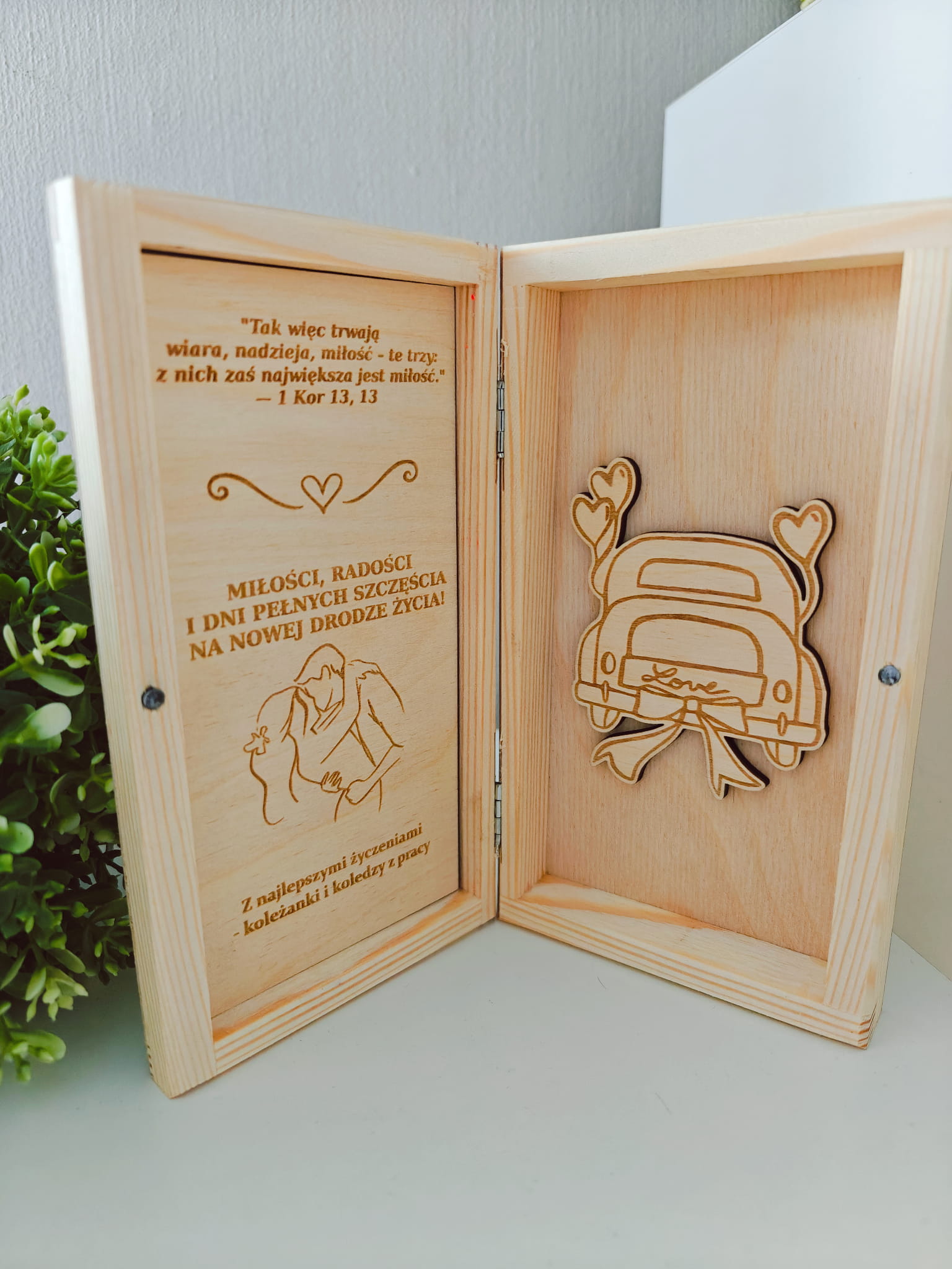 Wykonane z naturalnego drewna, pudełko ozdobione jest precyzyjnym grawerem z motywem serca, obrączek oraz imionami nowożeńców i datą ślubu. Wewnątrz znajduje się wzruszający cytat biblijny oraz życzenia, które można dostosować do okazji. Po jednej stronie umieszczona jest symboliczna grafika nawiązująca do okazji, po drugiej – dekoracyjna aplikacja 3D z motywem auta ślubnego z napisem „Love” i miejscem na banknoty.