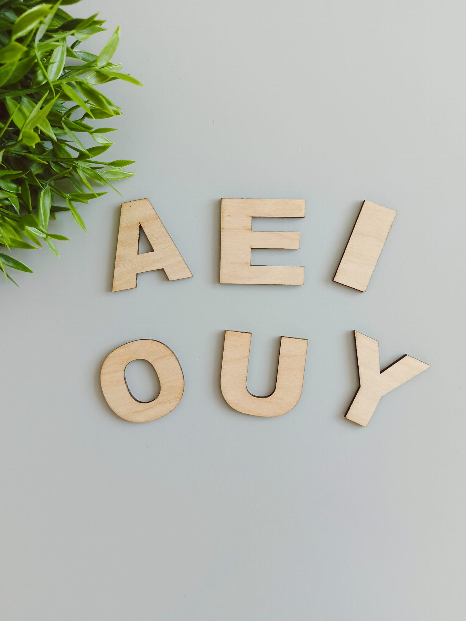 Zestaw 6 drewnianych samogłosek: A, E, I, O, U, Y
