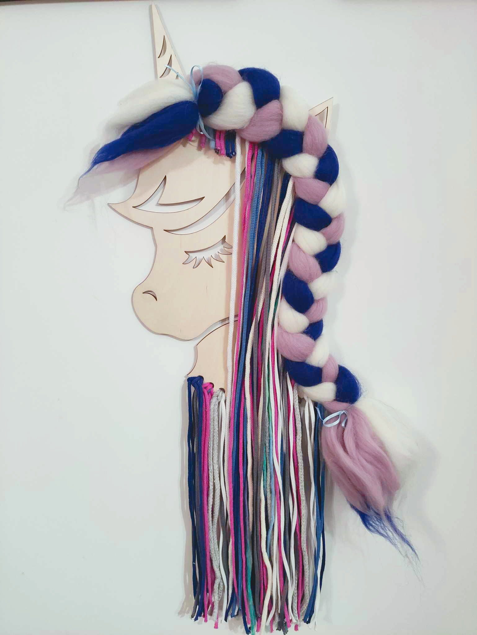 Baza jednorożca- sklejka. Warkocz- wełna czesankowa. Sznurki- poliester i bawełna
