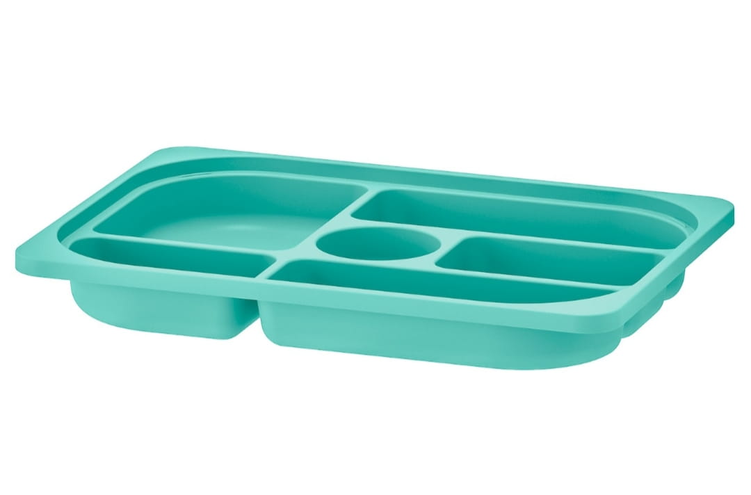 Może służyć do przechowywania różnych skarbów, elementów do zabaw tematycznych oraz kreatywnych i sensorycznych. Tacę z przegródkami można wykorzystać jako pojemnik do przygotowania zabawy z kolorowymi ziarenkami.