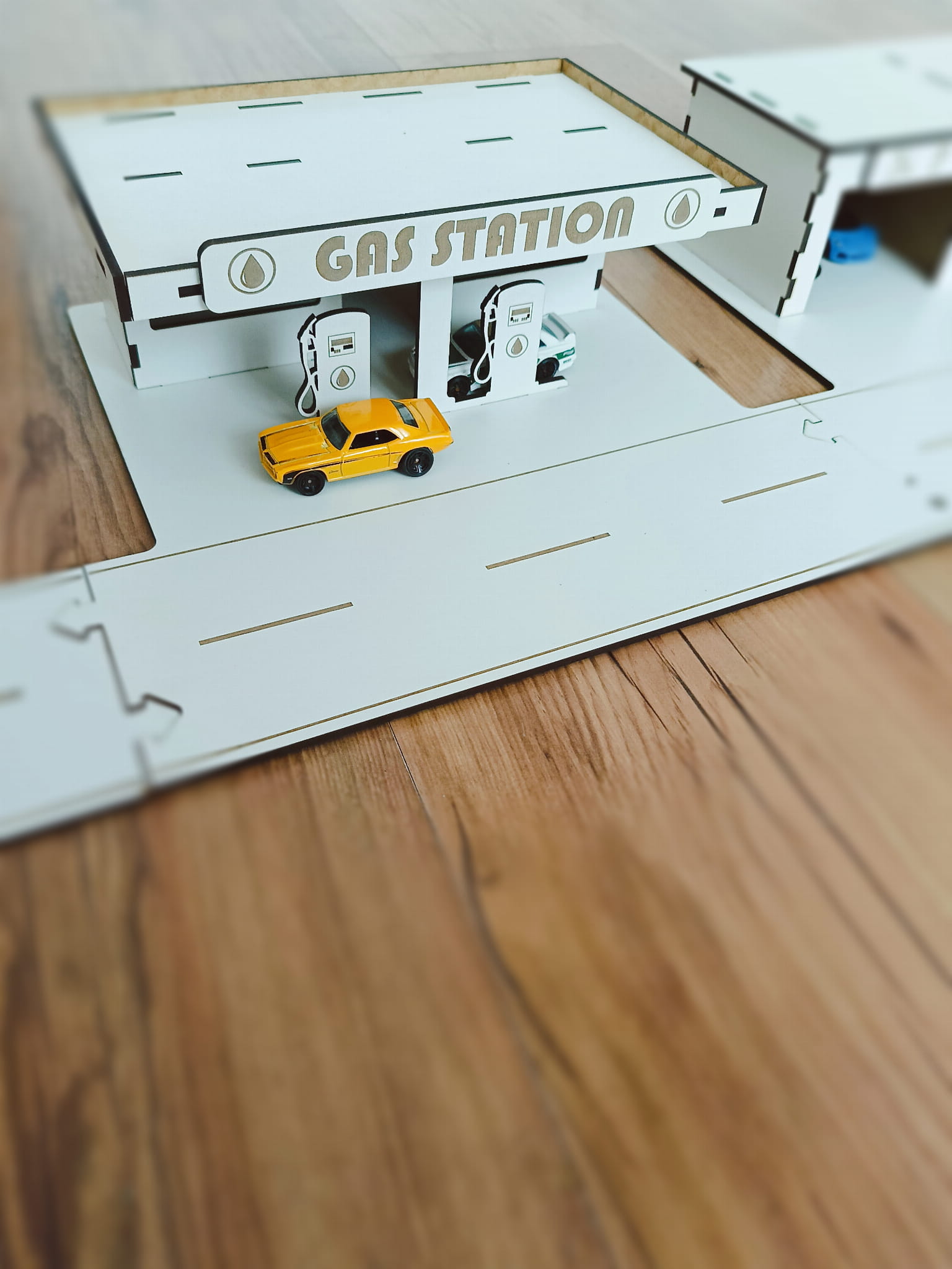Elementy do budowy miasta: most, sklep, parking, warsztat, stacja paliw