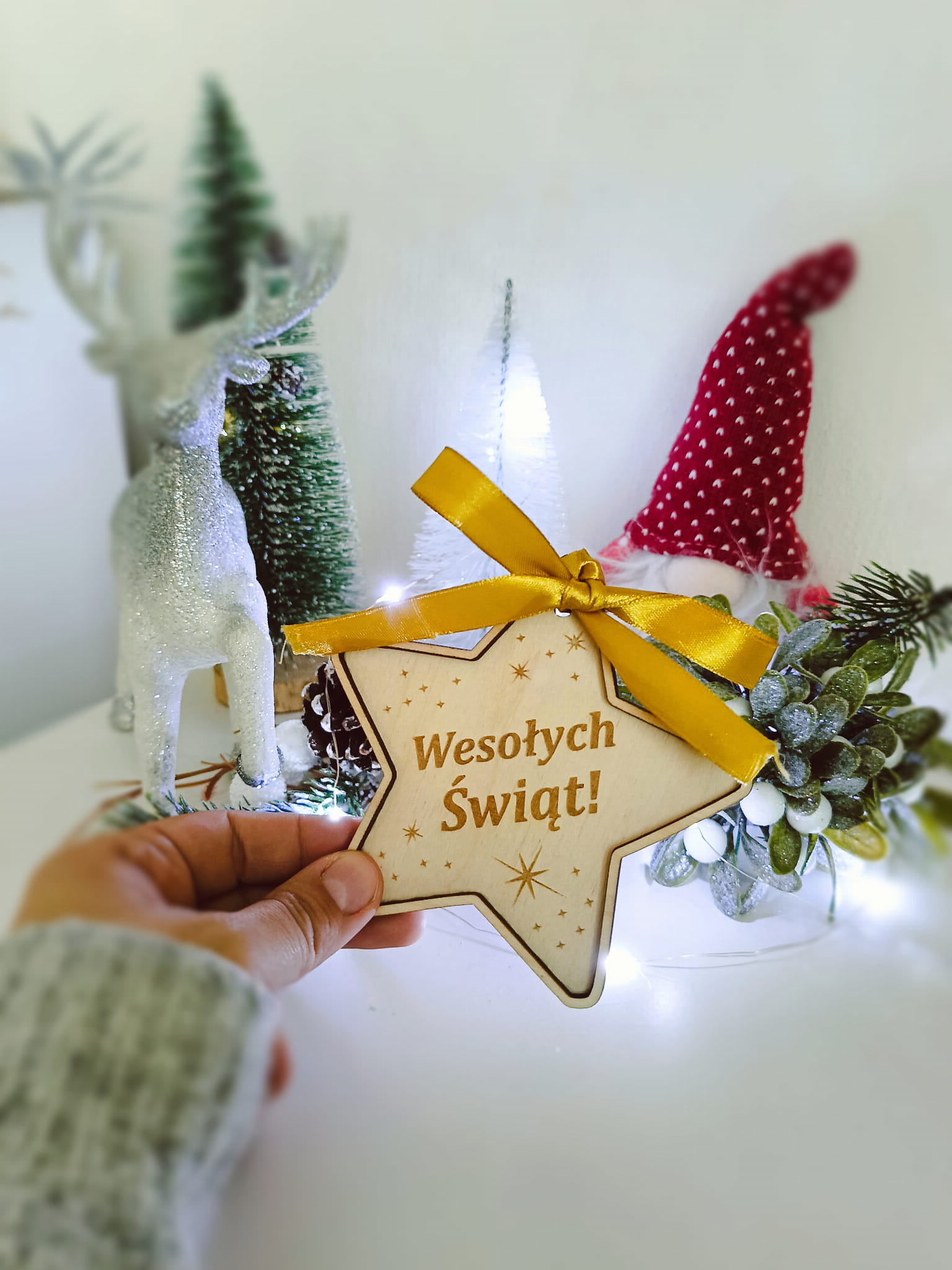 Stwórz wyjątkowy klimat na swojej choince dzięki eleganckiej, drewnianej bombce w kształcie gwiazdki. Ręcznie wykonana z wysokiej jakości sklejki, ozdobiona grawerowanym dowolnym napisem. Bombka przyciąga uwagę subtelnymi detalami oraz klasycznym świątecznym wyglądem, który doskonale komponuje się z innymi dekoracjami.