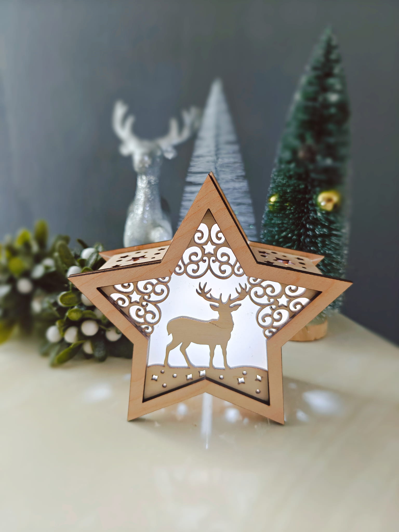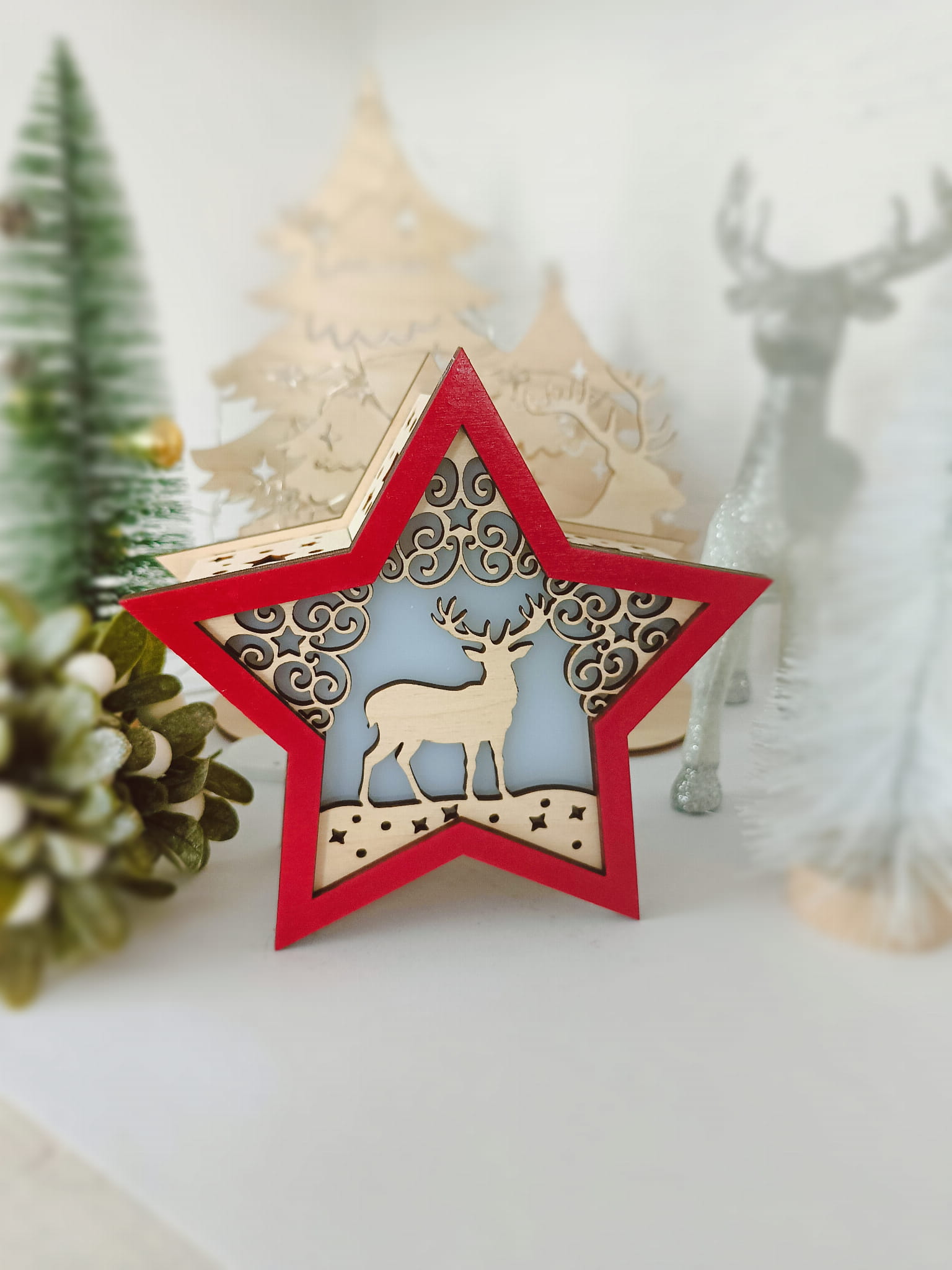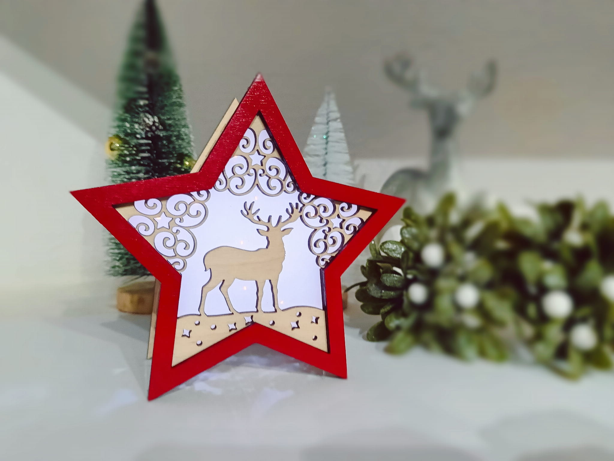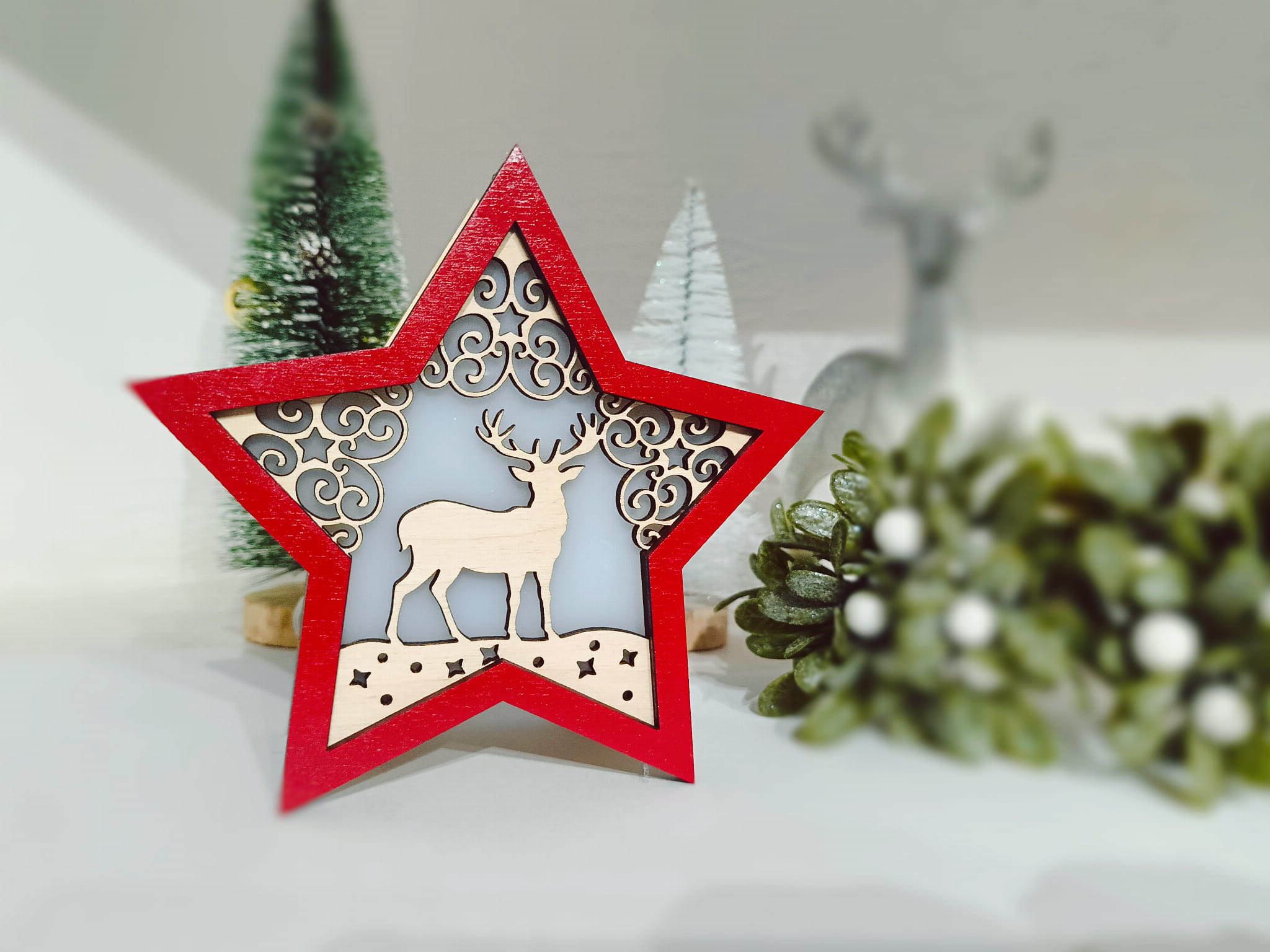 Jelonek - Podświetlana gwiazda 3D święcąca stojąca ozdoba świąteczna drewniana na Boże Narodzenie