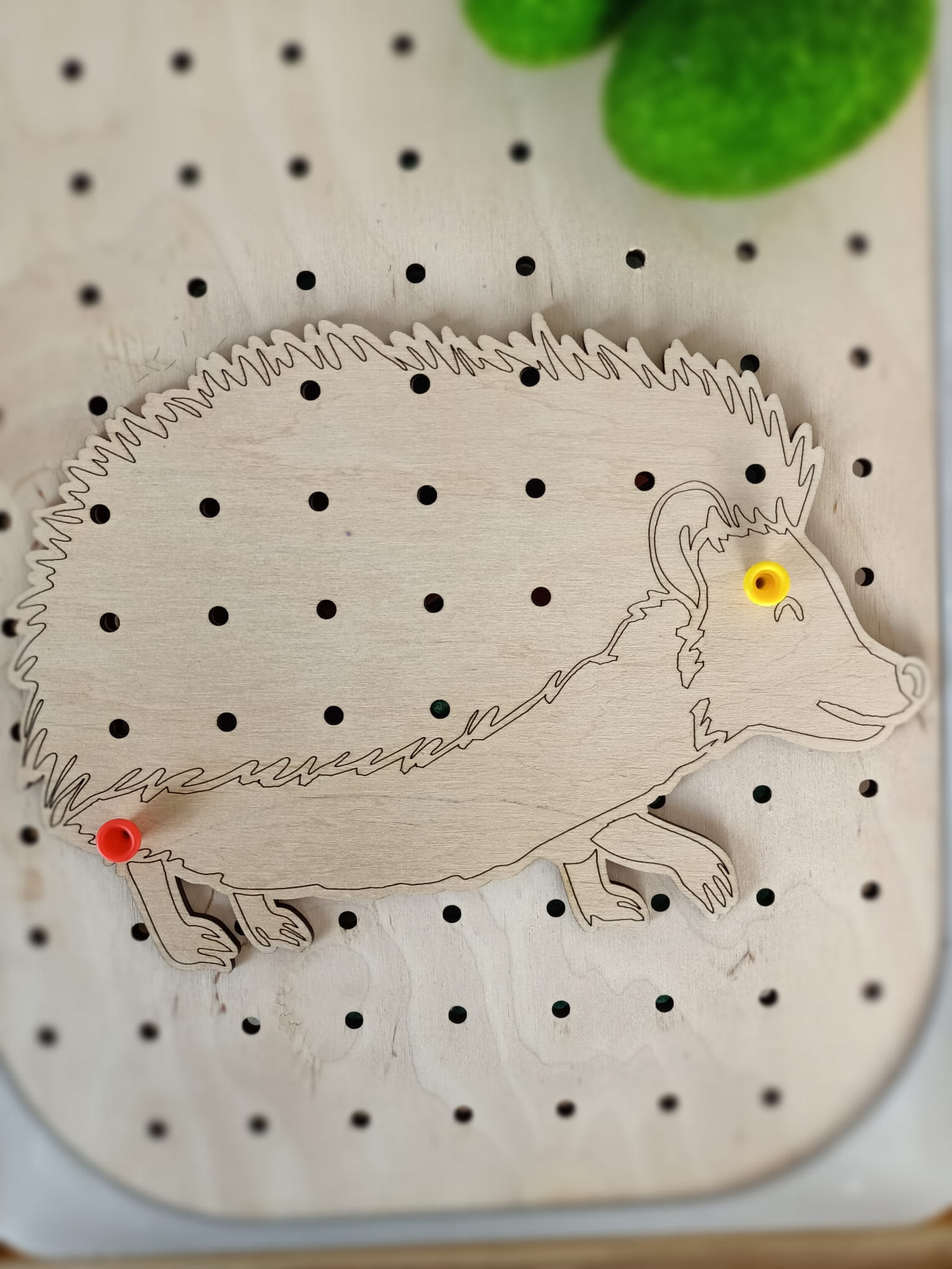 Szablon można wykorzystać z tablicą maxi z wieloma otworami , aby dodatkowo urozmaicić zabawę z tablicą oraz tworzyć kreatywne wzory. Wystarczy położyć szablon na tablicy i w dwóch miejscach zabezpieczyć gwoździkiem, tak aby szablon się nie przesuwał, a następnie wykorzystać np. druciki kreatywne, kolorowe piórka, gałązki, makaron itp. do ozdabiania szablonów.
