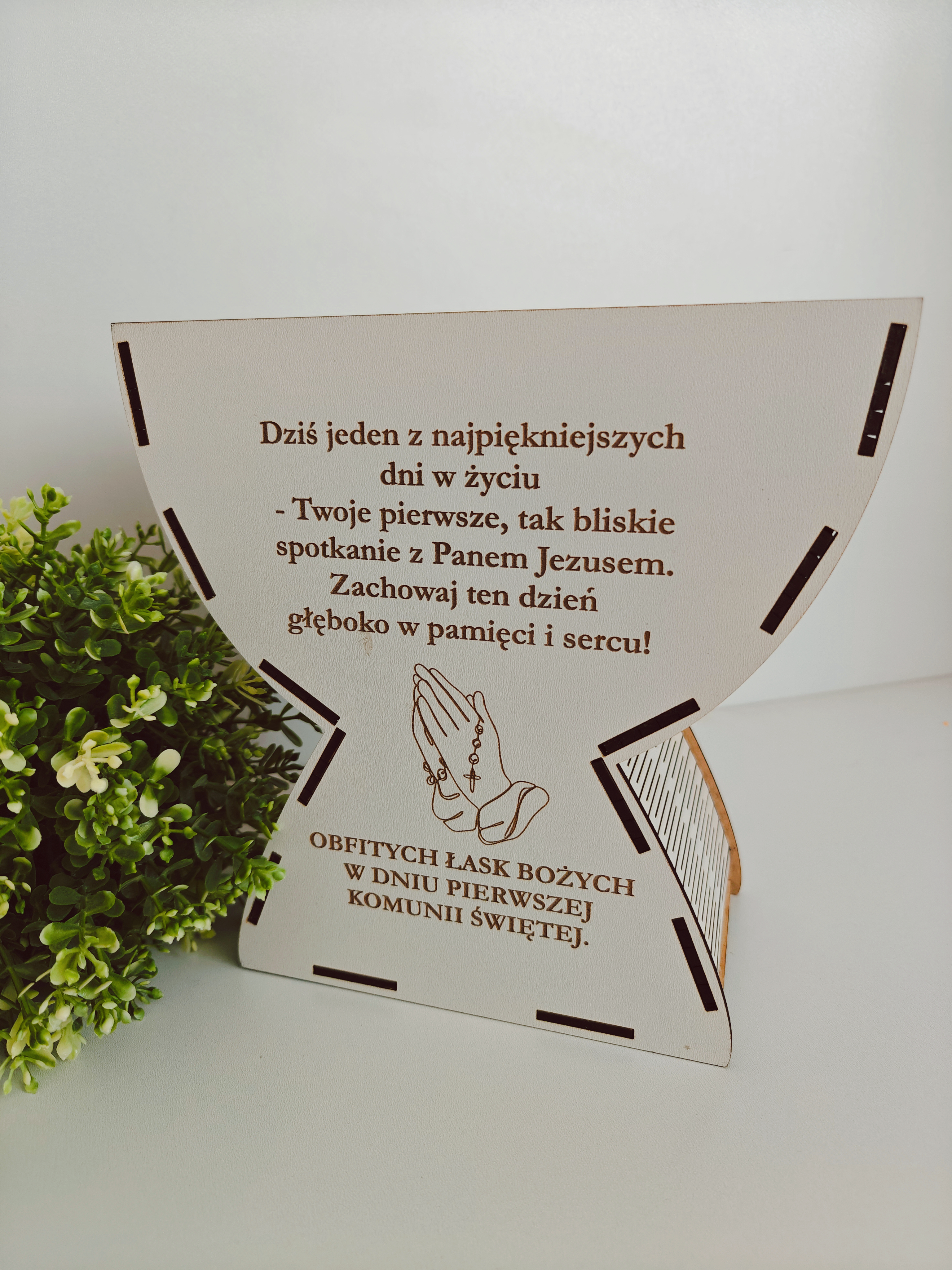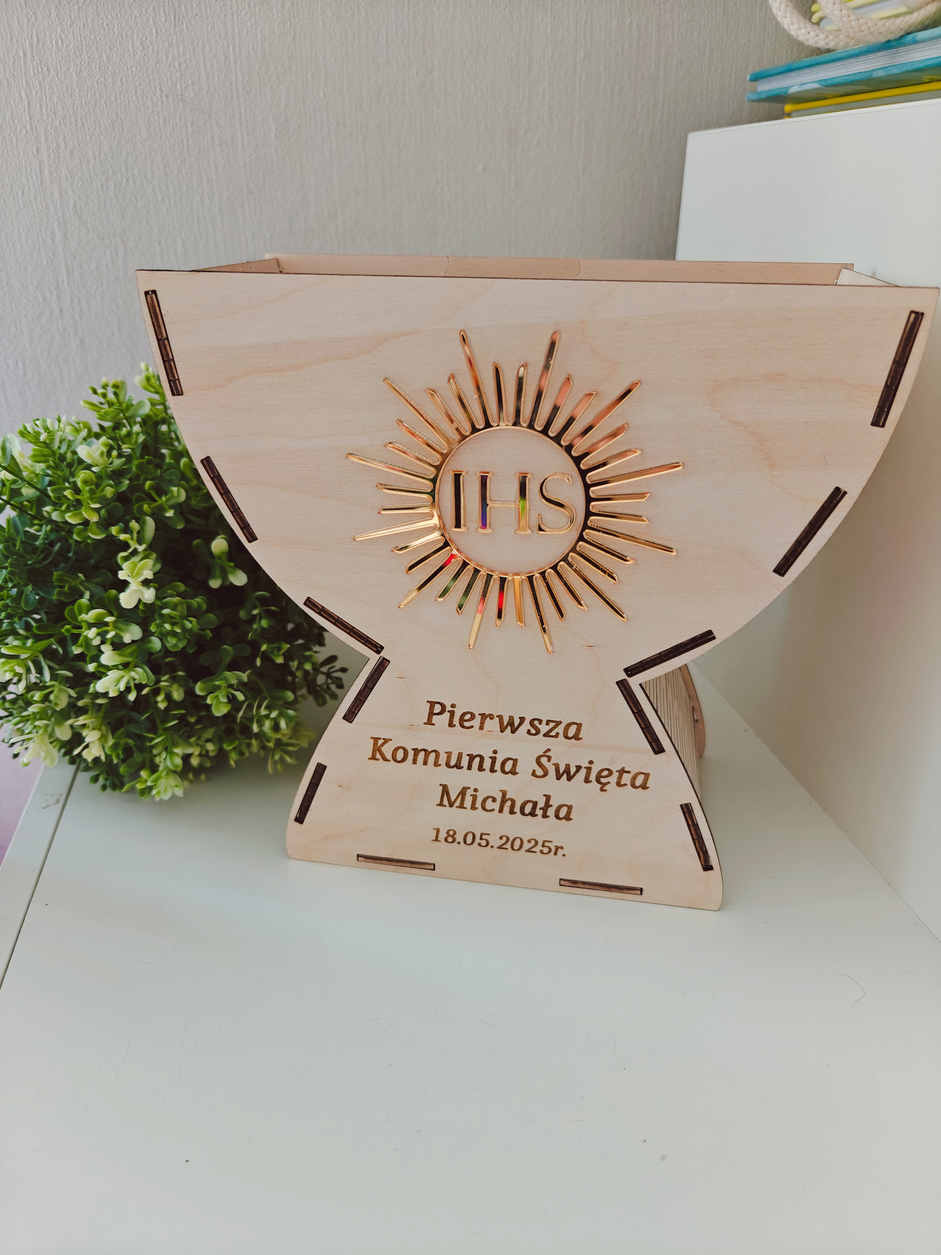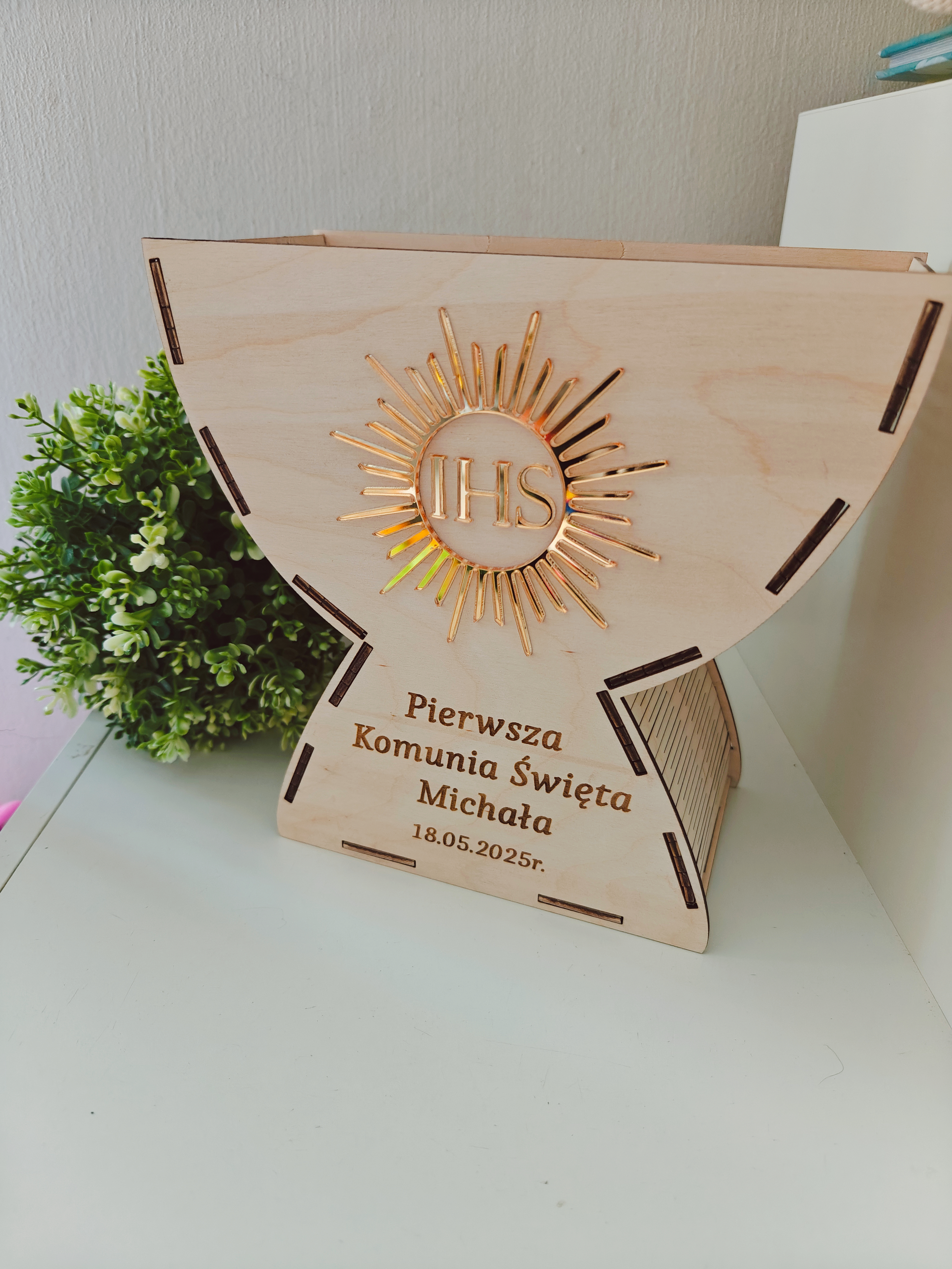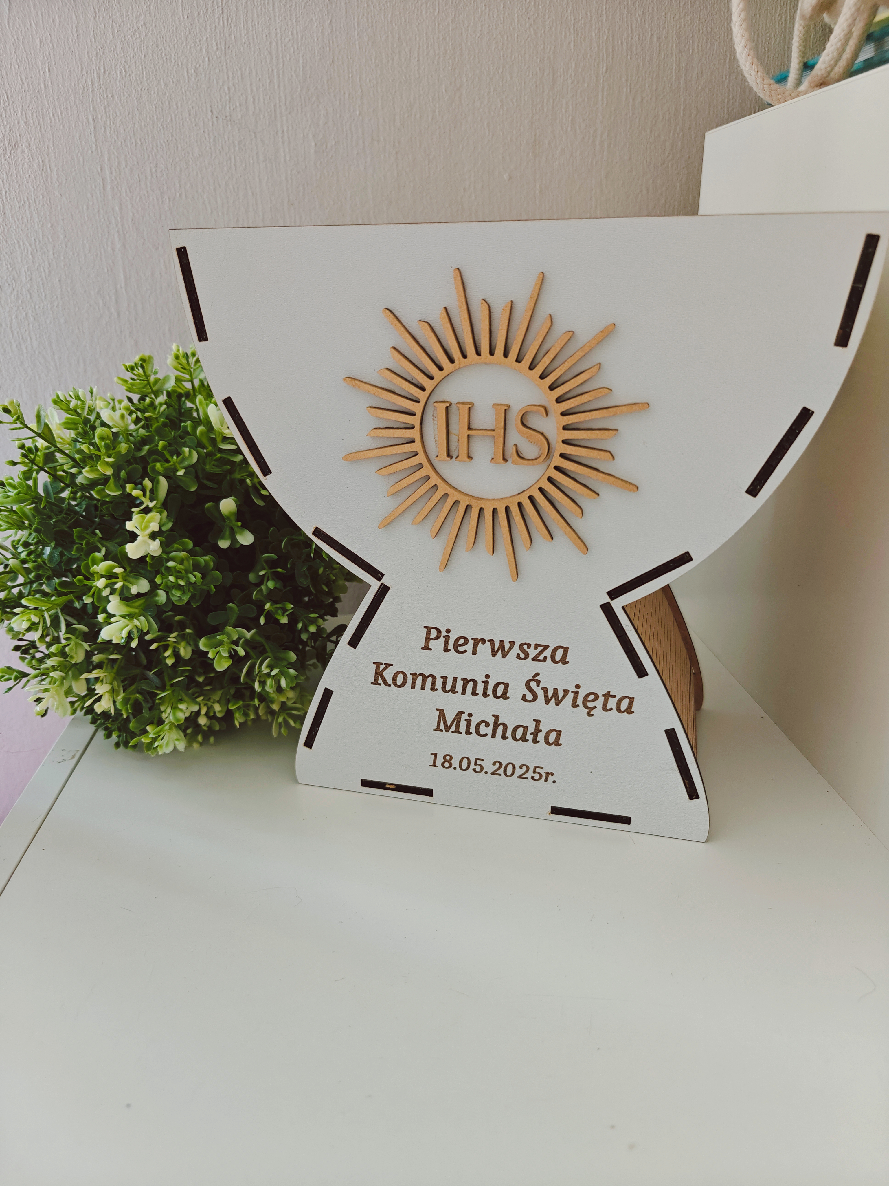Drewniana, personalizowana pamiątka w kształcie kielicha z symbolem IHS to elegancki i ponadczasowy upominek, który zachowa wspomnienia tego ważnego dnia na długie lata.