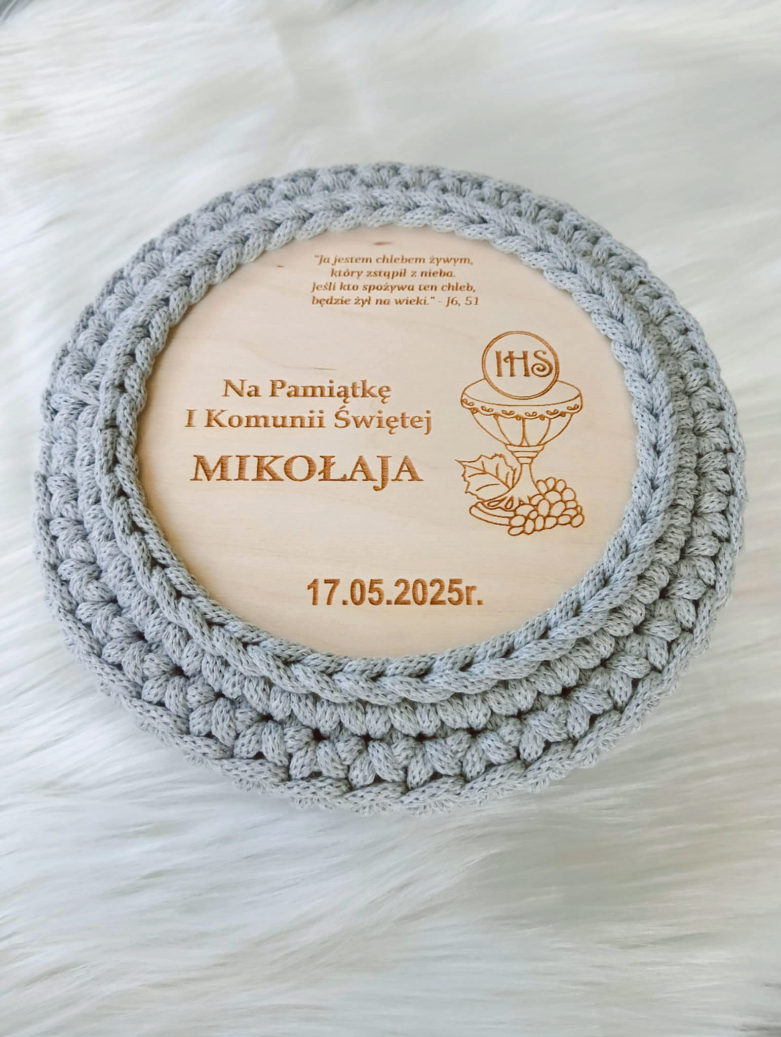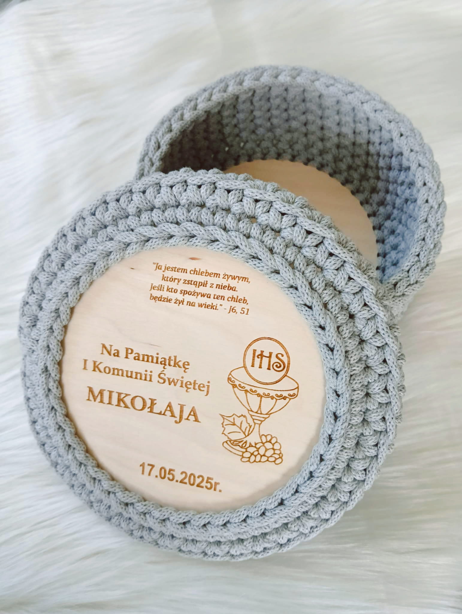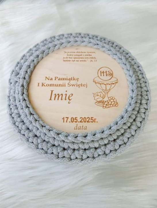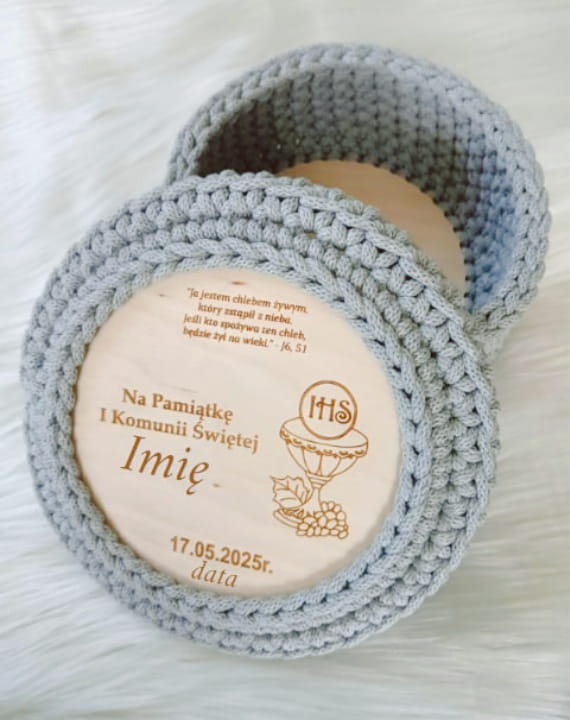 Pamiątkowy koszyczek pleciony ze sznurka to nie tylko stylowy organizer na dziecięce skarby – to wyjątkowa, ręcznie wykonana pamiątka I Komunii Świętej.