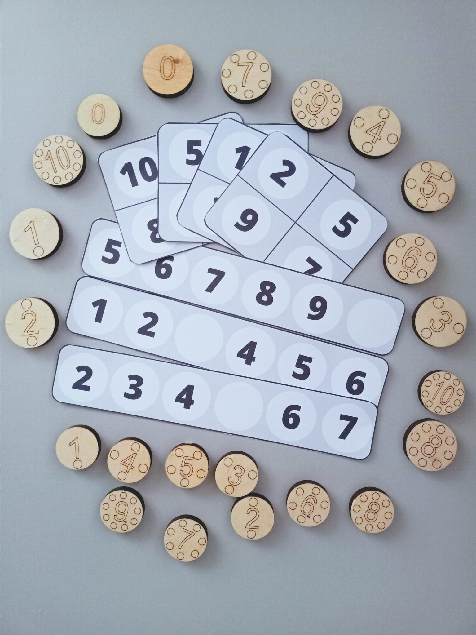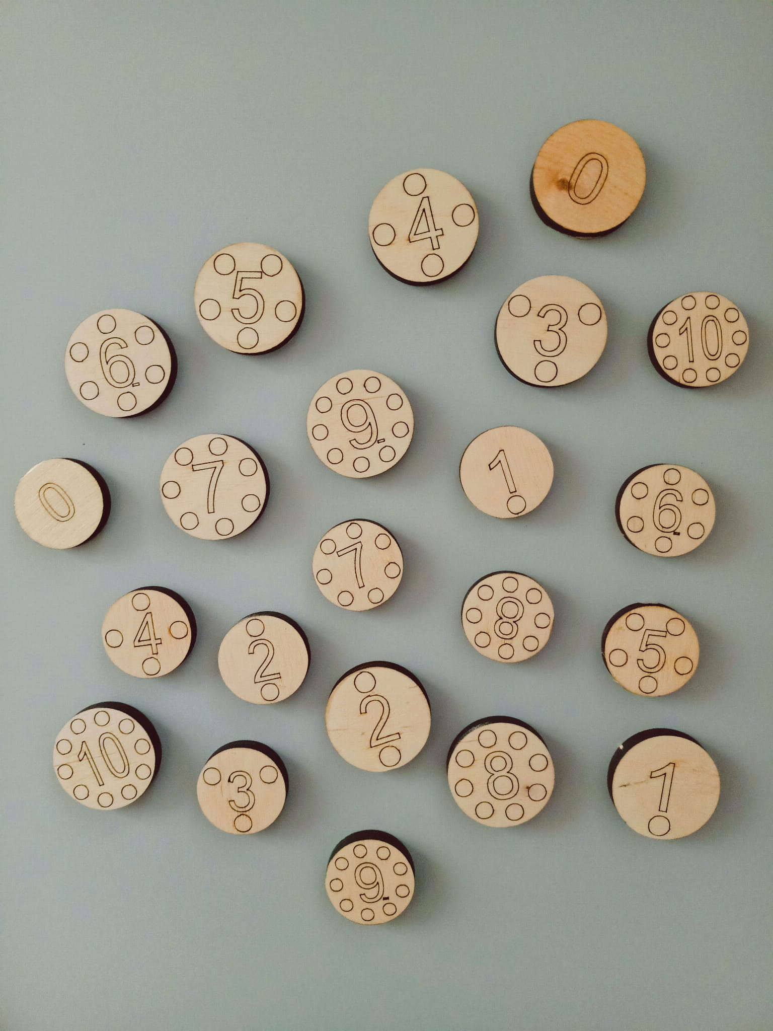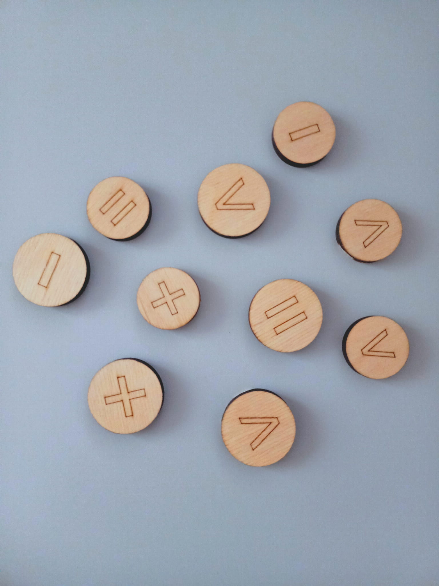 Zestaw zawiera dwa rozmiary kolorowych żetonów. Na rewersach żetonów zostały umieszone cyfry od 1 do 9 wraz z oznaczeniem punktowym reprezentującym ilość zgodną z oznaczeniem liczbowym. Dodatkowo w zestawie znajduje się żeton z cyfrą 0 oraz 10, a także żetony ze znakami: plus, minus, znakiem równości, znakami mniejszości i większości.