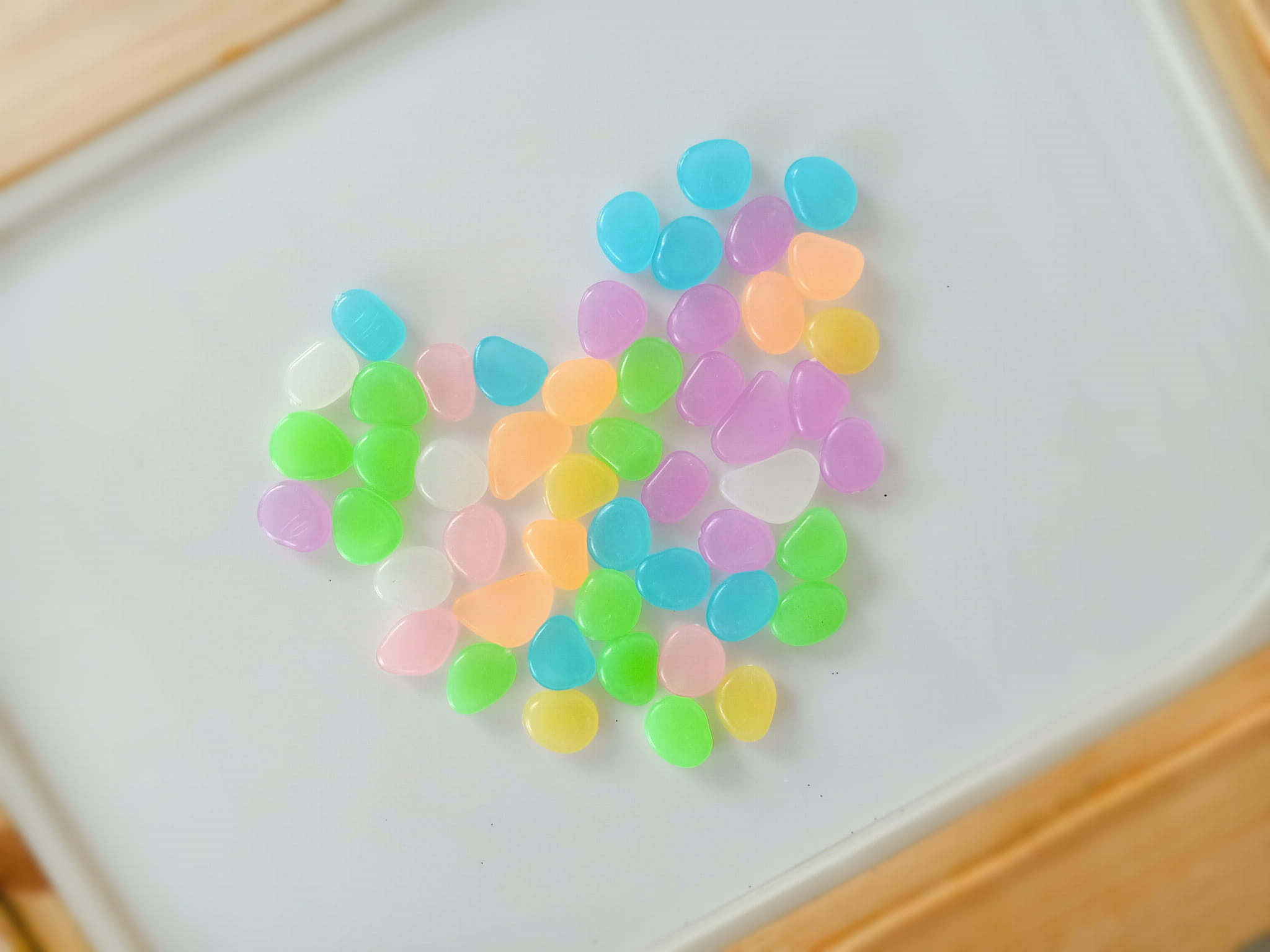 Kolorowe fluorescencyjne kamyki to świetny dodatek do podświetlane tablicy plexi, ale można je również wykorzystywać samodzielnie do nauki kolorów oraz liczenia, jak również do tworzenia sekwencji.