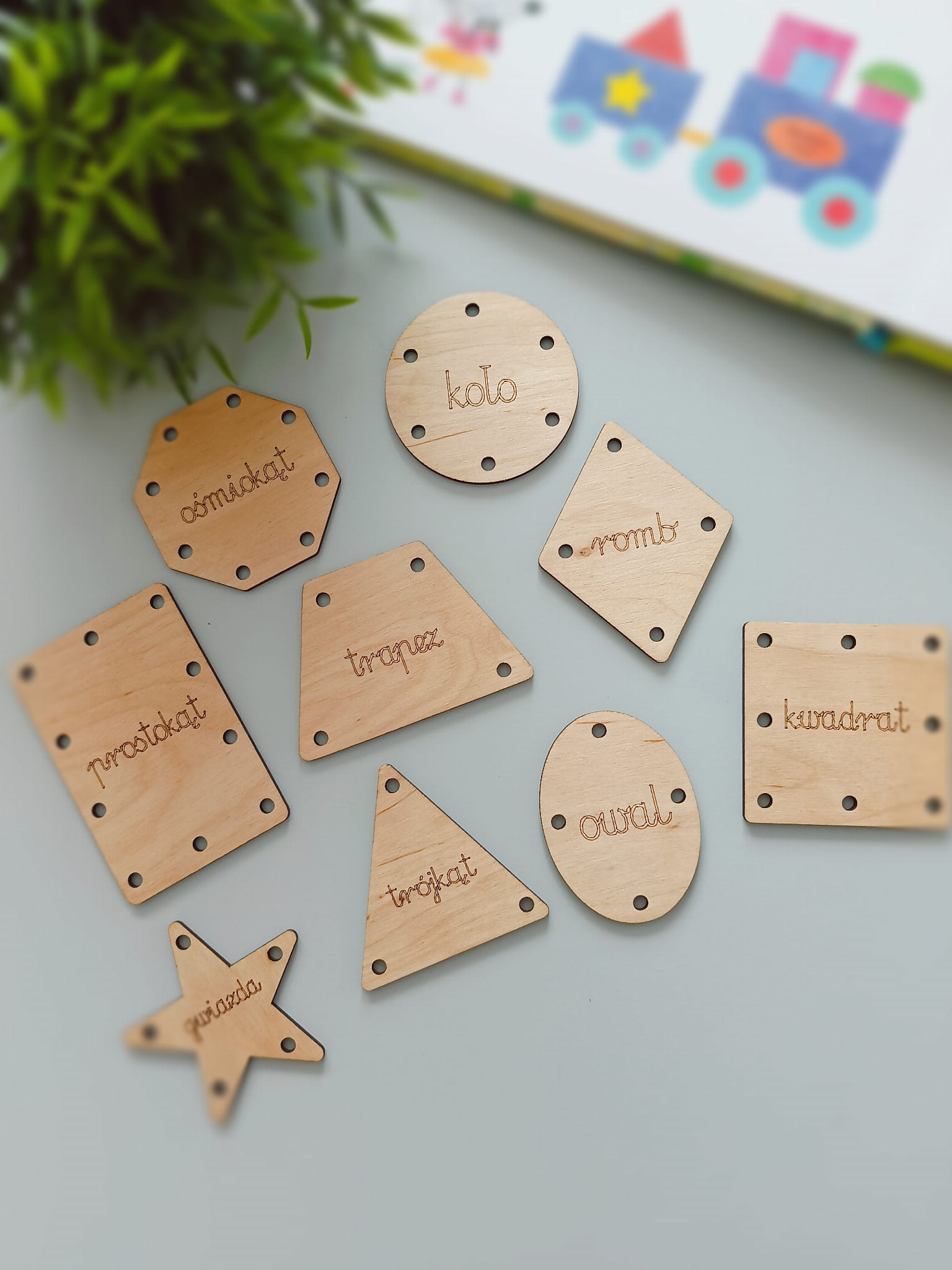 Zestaw 9 drewnianych kształtów z otworami do przeplatania za pomocą np. sznurowadeł lub drucików kreatywnych. W otwory można również władać inne skarby natury, np. liście, kwiaty itd.