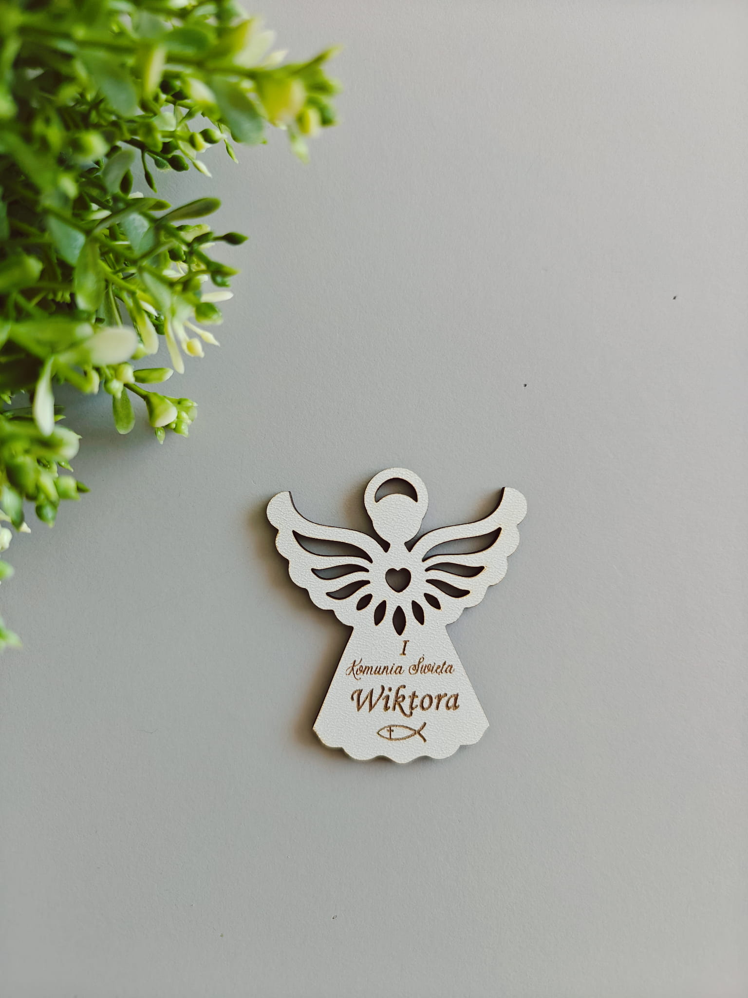 Piękne i eleganckie podziękowanie dla gości z okazji Pierwszej Komunii Świętej w formie magnesu w kształcie aniołka.