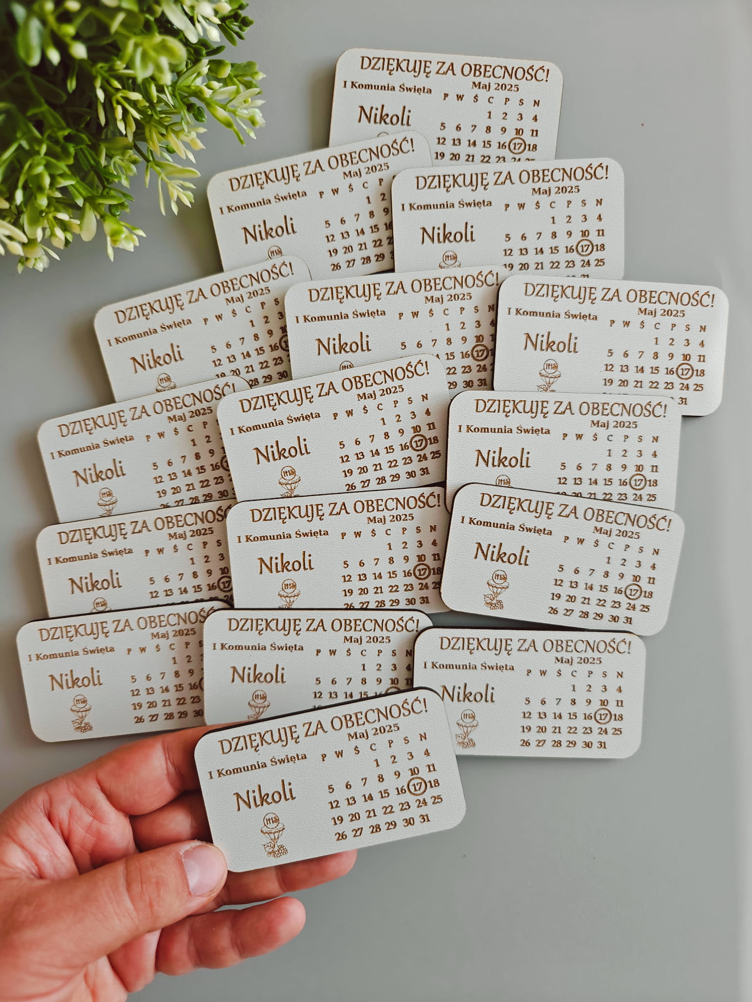 Piękne i eleganckie podziękowanie dla gości z okazji Pierwszej Komunii Świętej w formie magnesu w formie kartki z kalendarza.