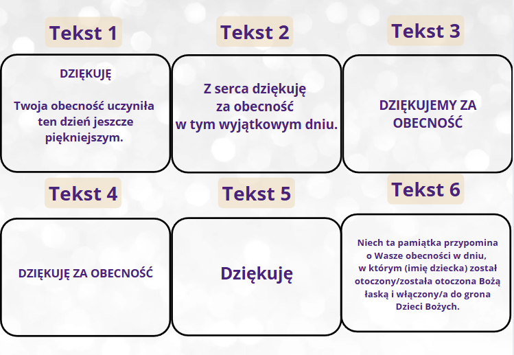Magnesy dostępne w dwóch wariantach kolorystycznych: naturalnym oraz białym. Subtelne zdobienia, motywy dziecięce oraz chrzcielne, a także starannie wygrawerowany tekst tworzą elegancki i ciepły upominek, idealny jako drobne podziękowanie dla gości z okazji Chrztu Świętego.