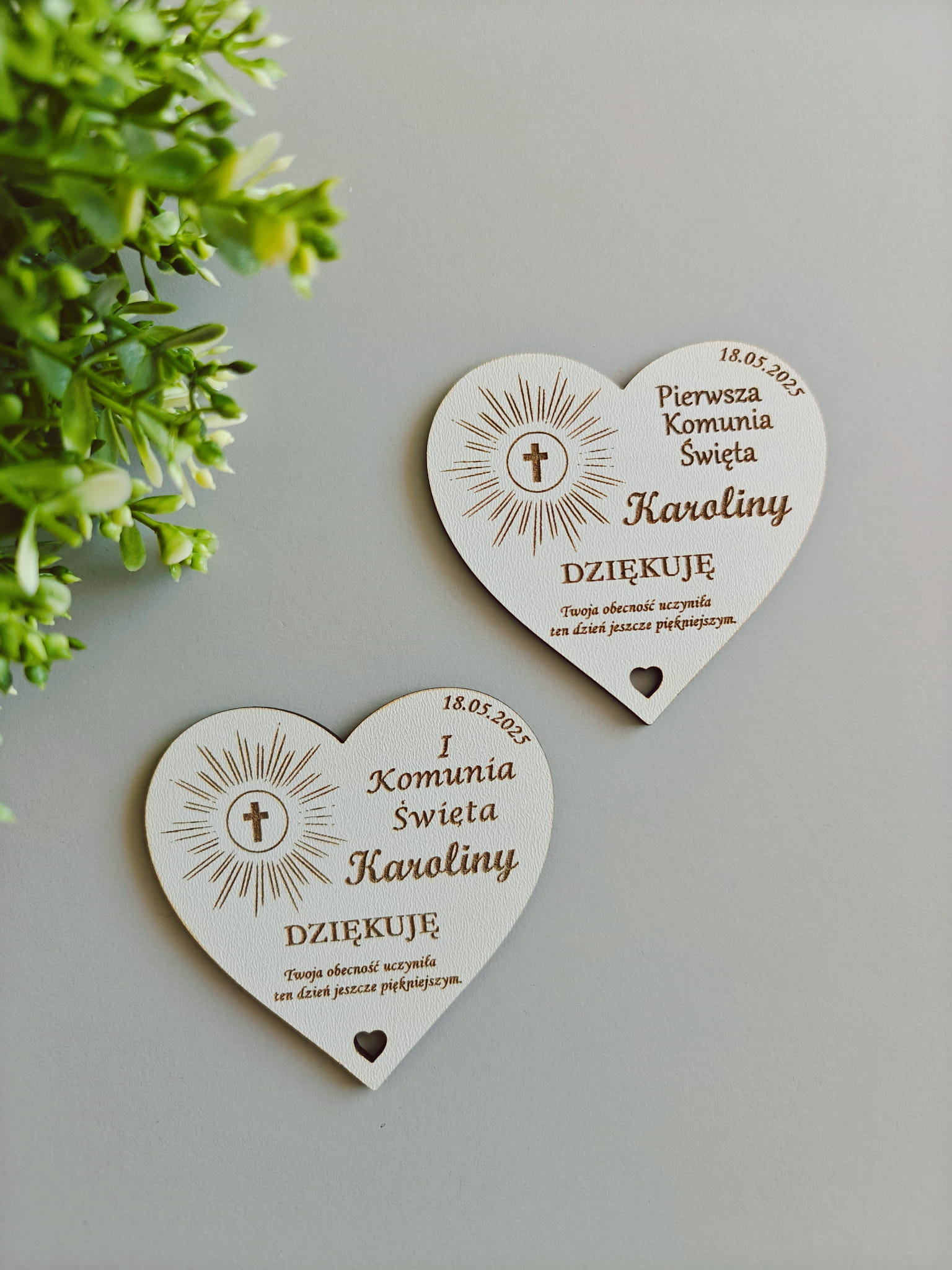 Piękne i eleganckie podziękowanie dla gości z okazji Pierwszej Komunii Świętej w formie magnesu w kształcie serca.