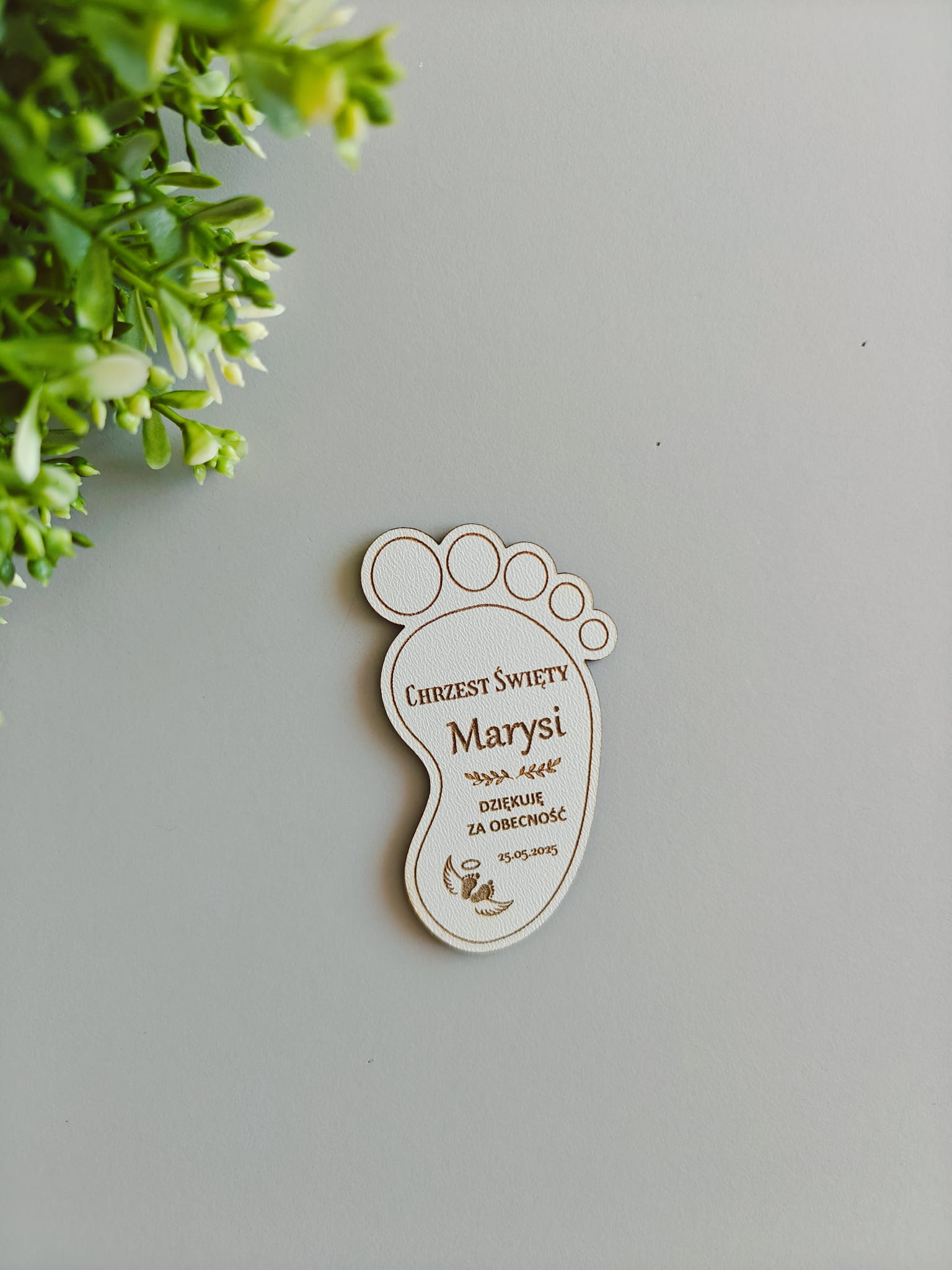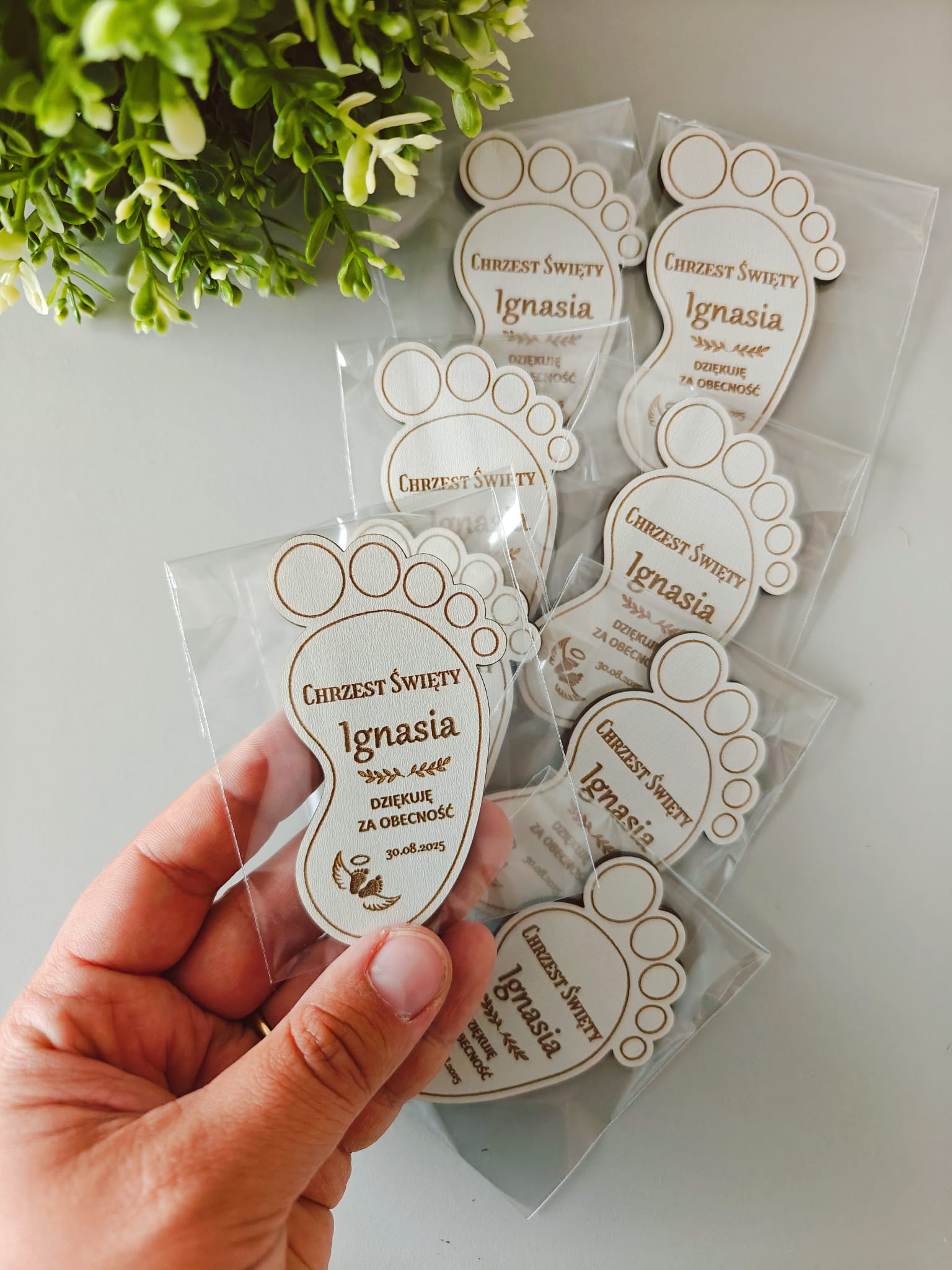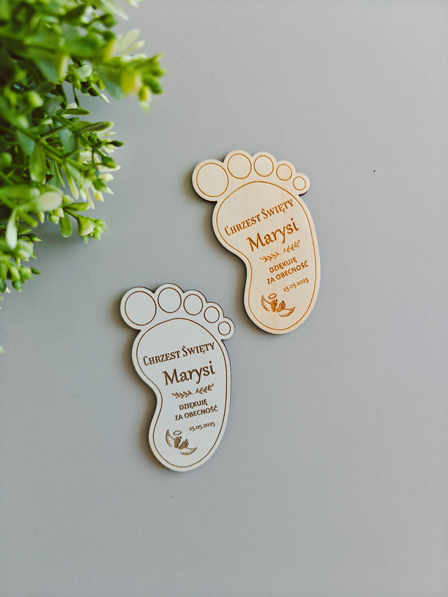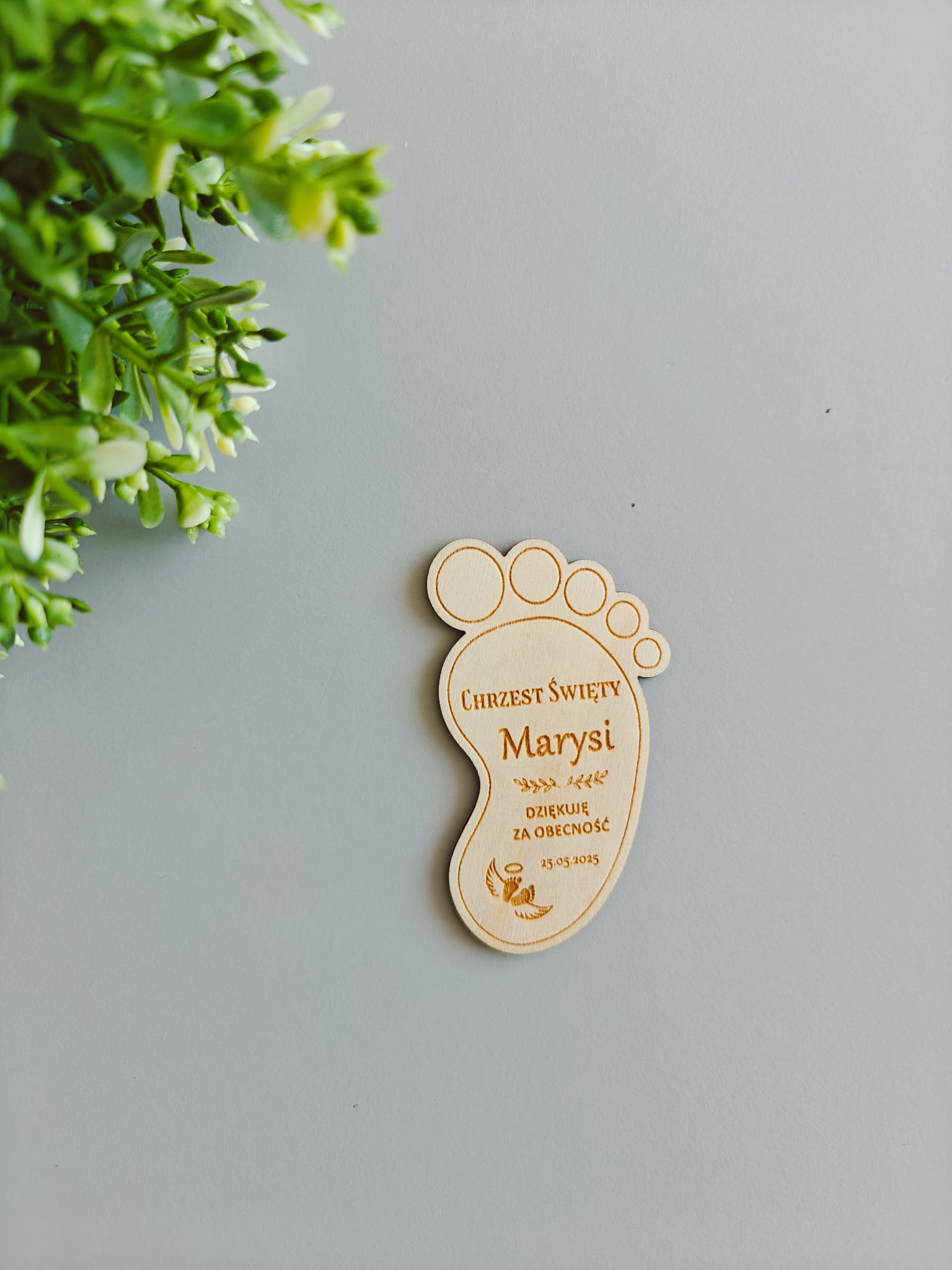 Magnes drewniany Stópka Personalizowane Podziękowanie dla gości Chrzest Święty