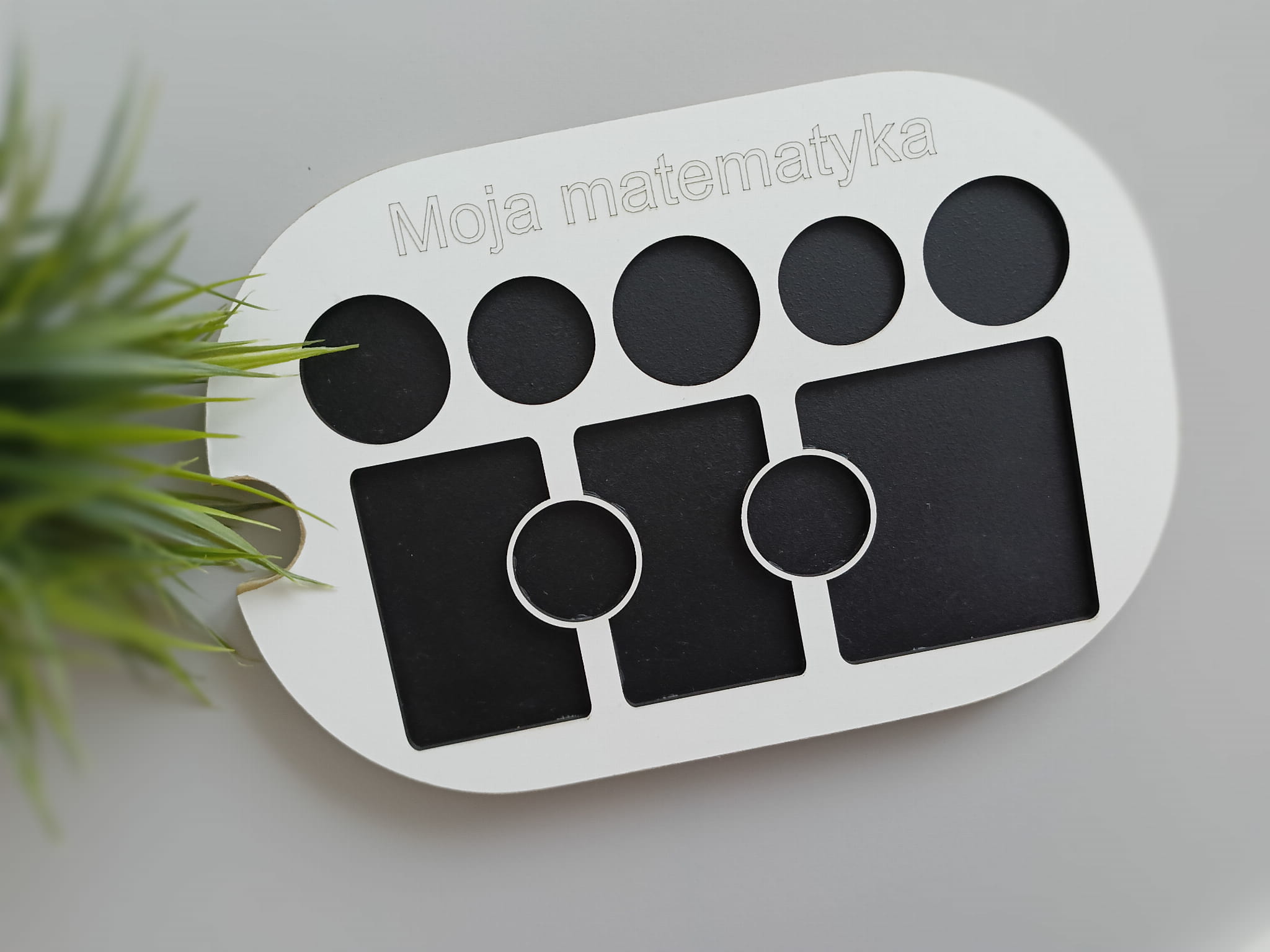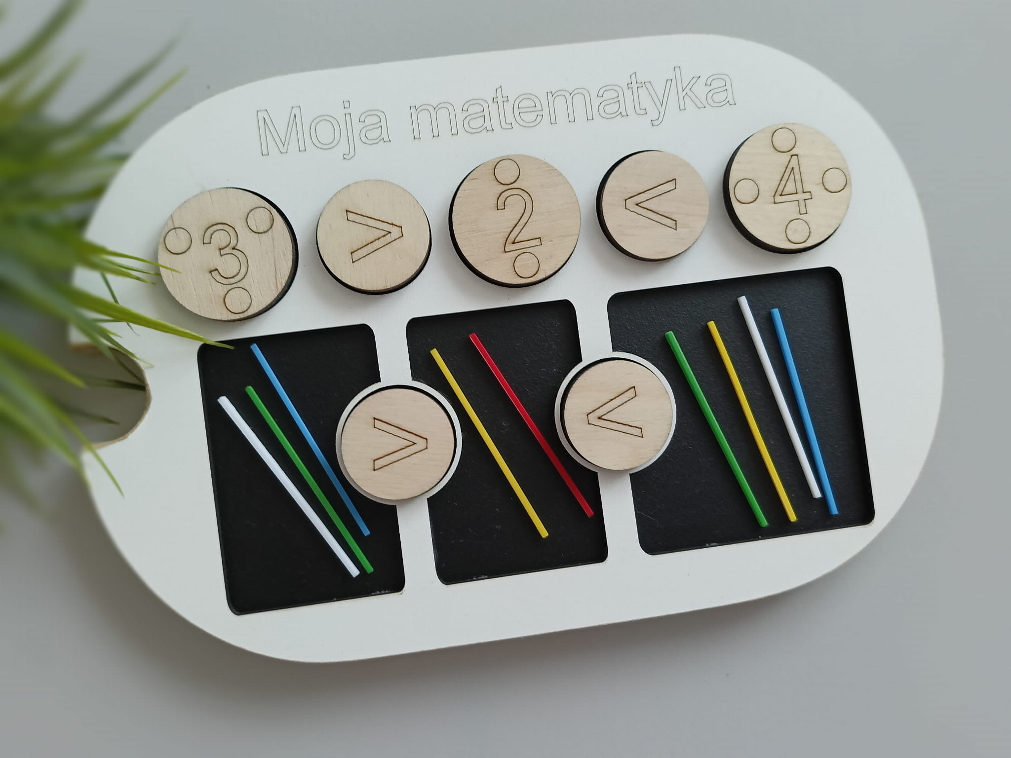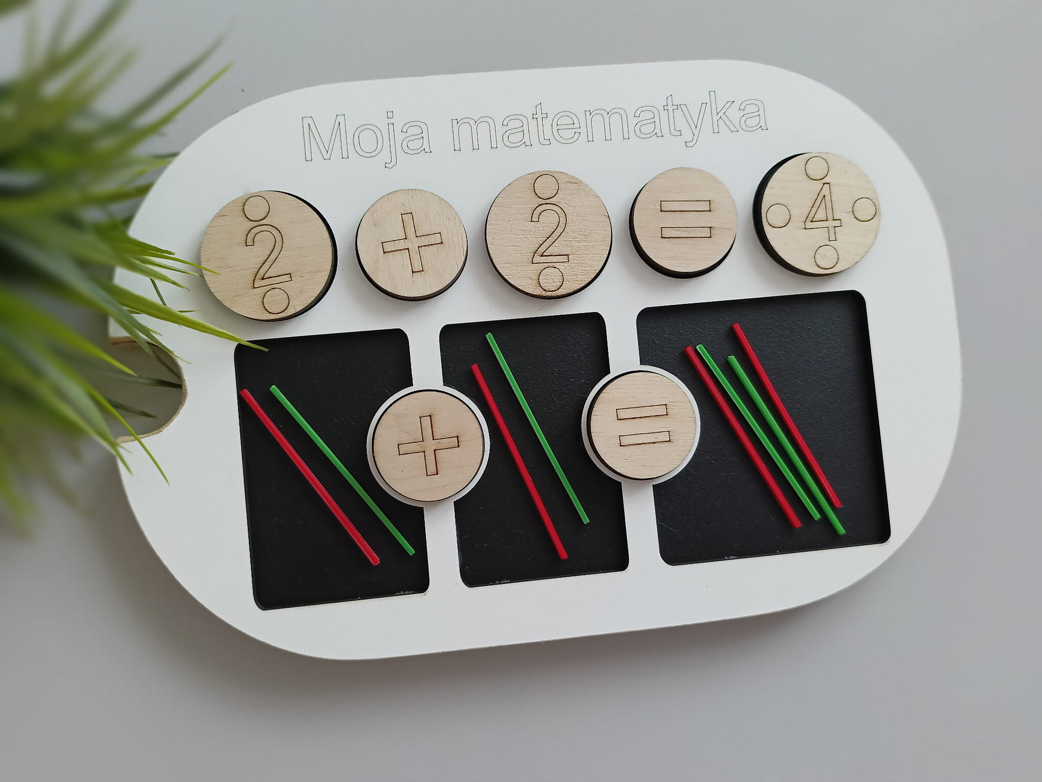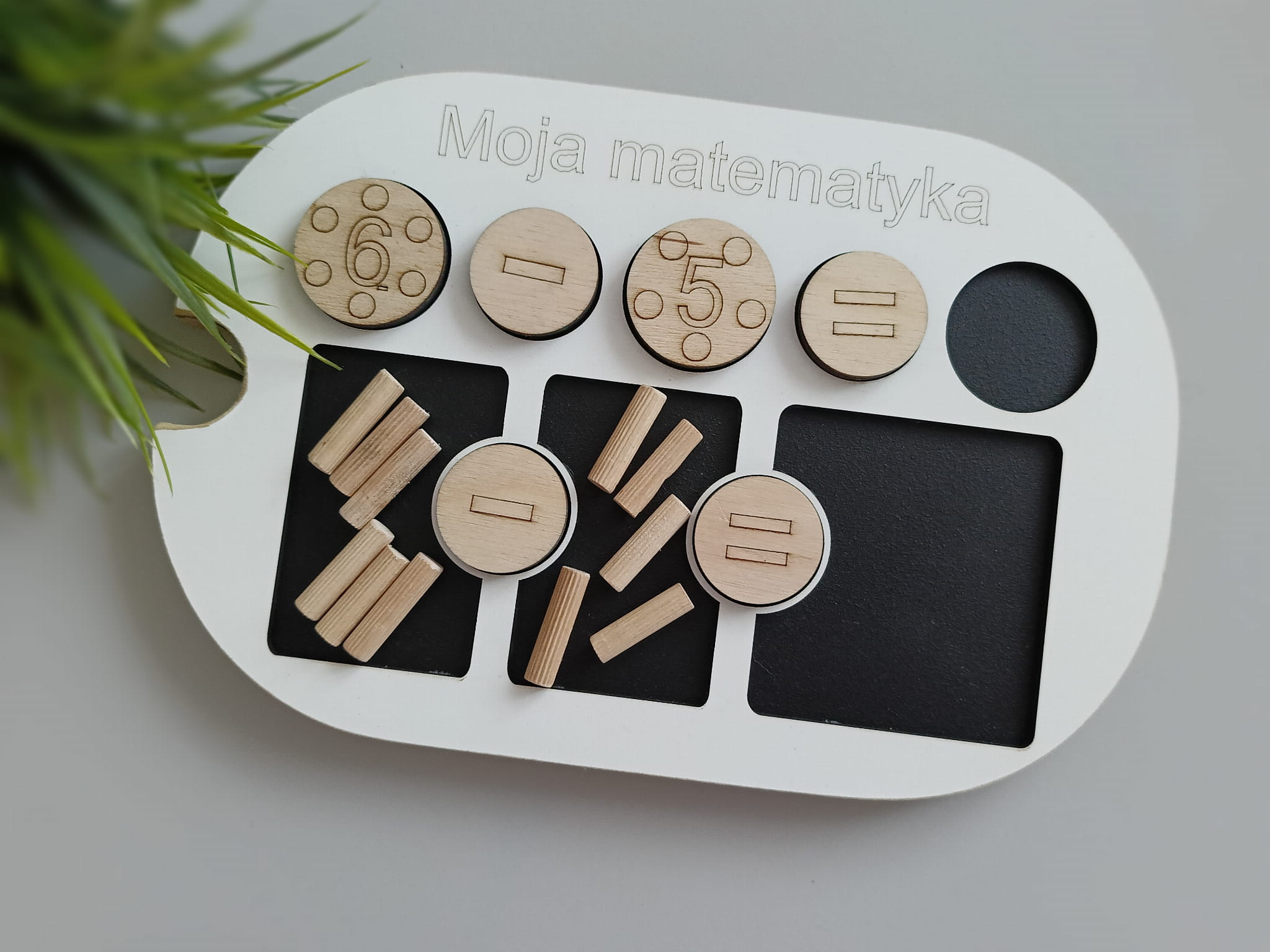 Nasza matematyczna tablica idealnie sprawdzi się do nauki liczenia w zakresie 10 (lub więcej). Tablica pomalowana jest farbą tablicową, dzięki czemu możecie na niej zapisywać działania matematyczne, a poniżej znajduje się miejsce na układanie przedmiotów np. liczmanów, kołeczków, czy skarbów znalezionych na spacerze - do liczenia na konkretach.