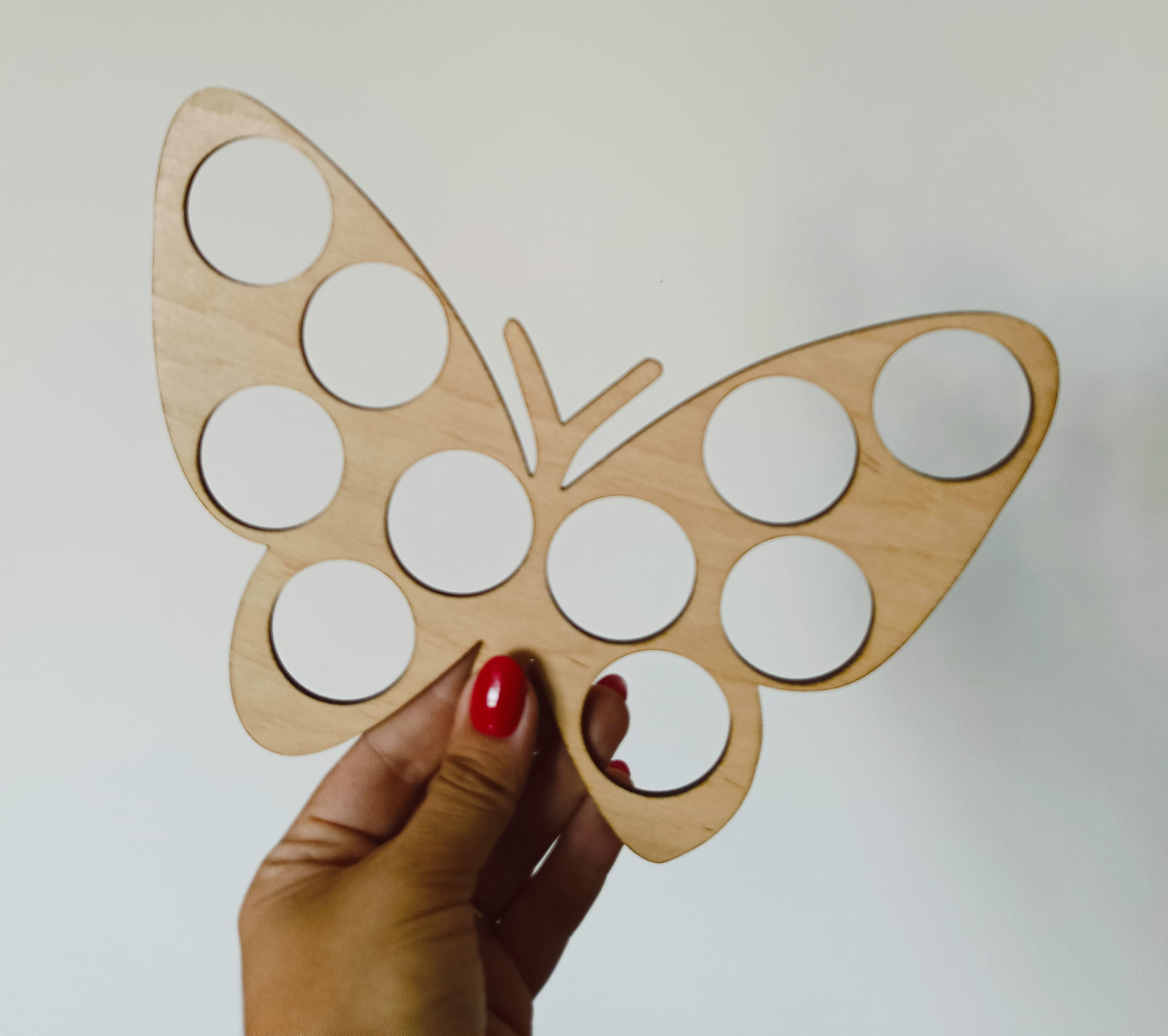 2. Wariant 2: motyl + 10 drewnianych dwustronnych żetonów o średnicy 35mm (z jednej strony kolor, z drugiej strony cyfra wraz z oznaczeniem graficznym)
