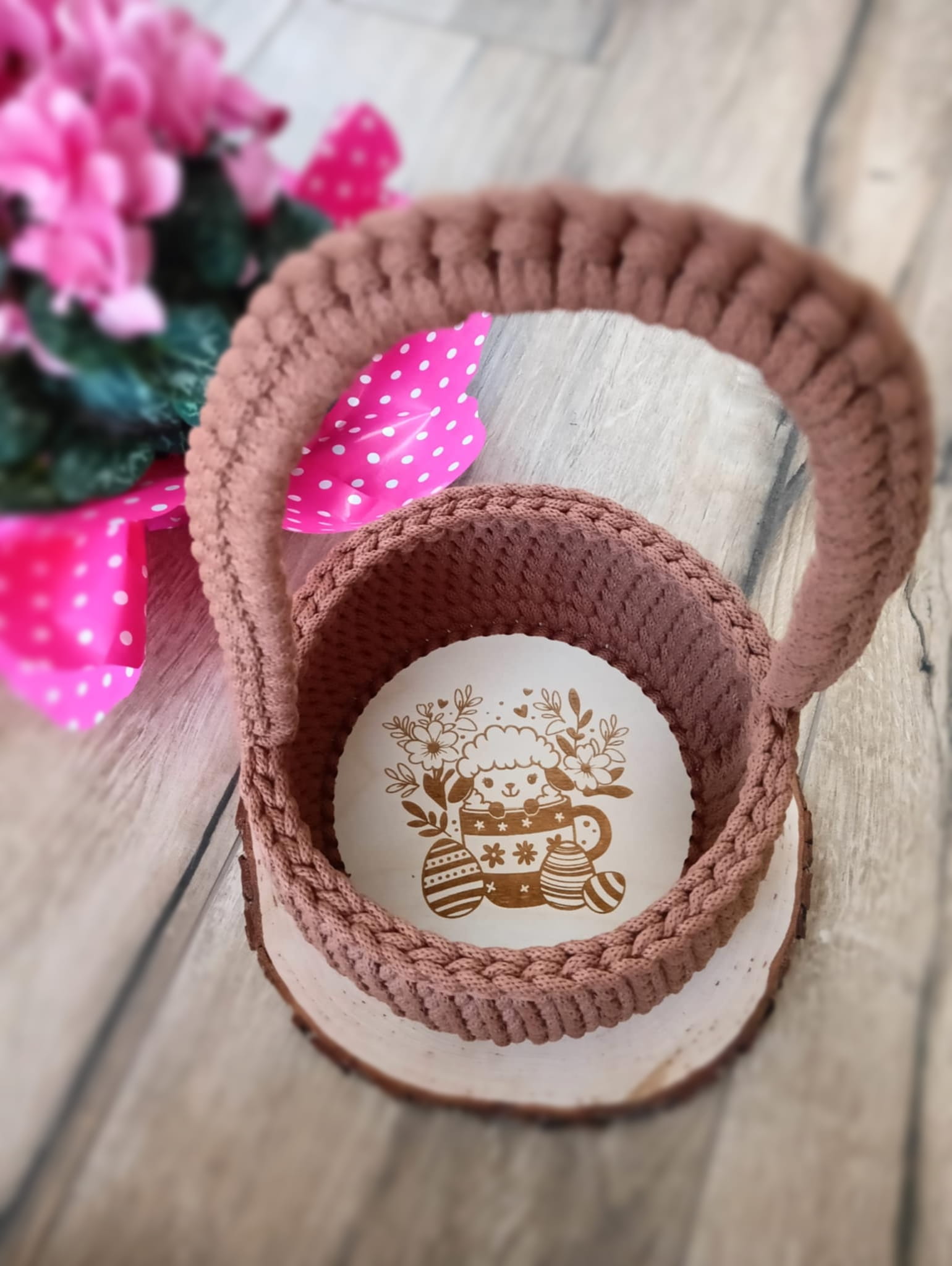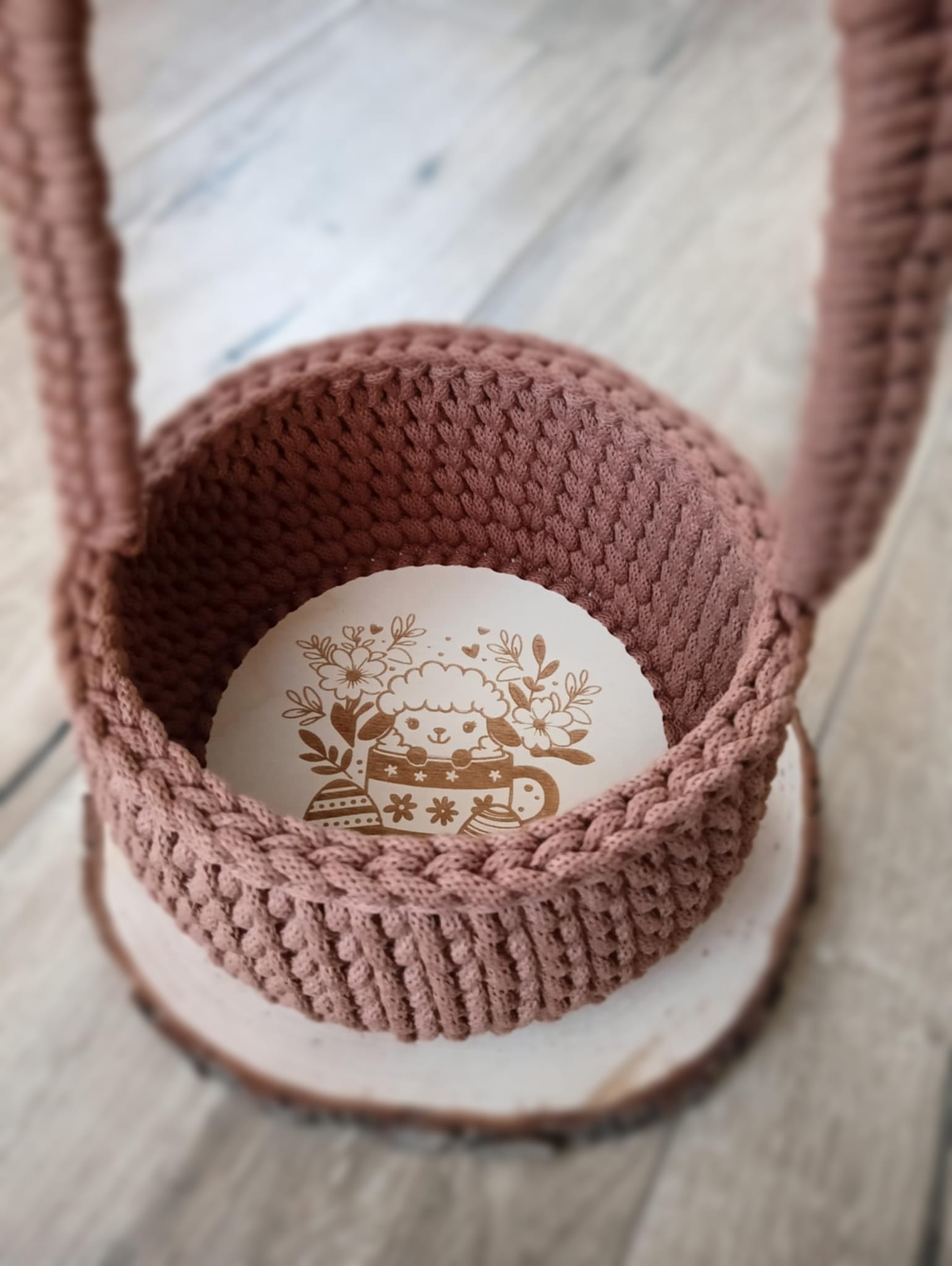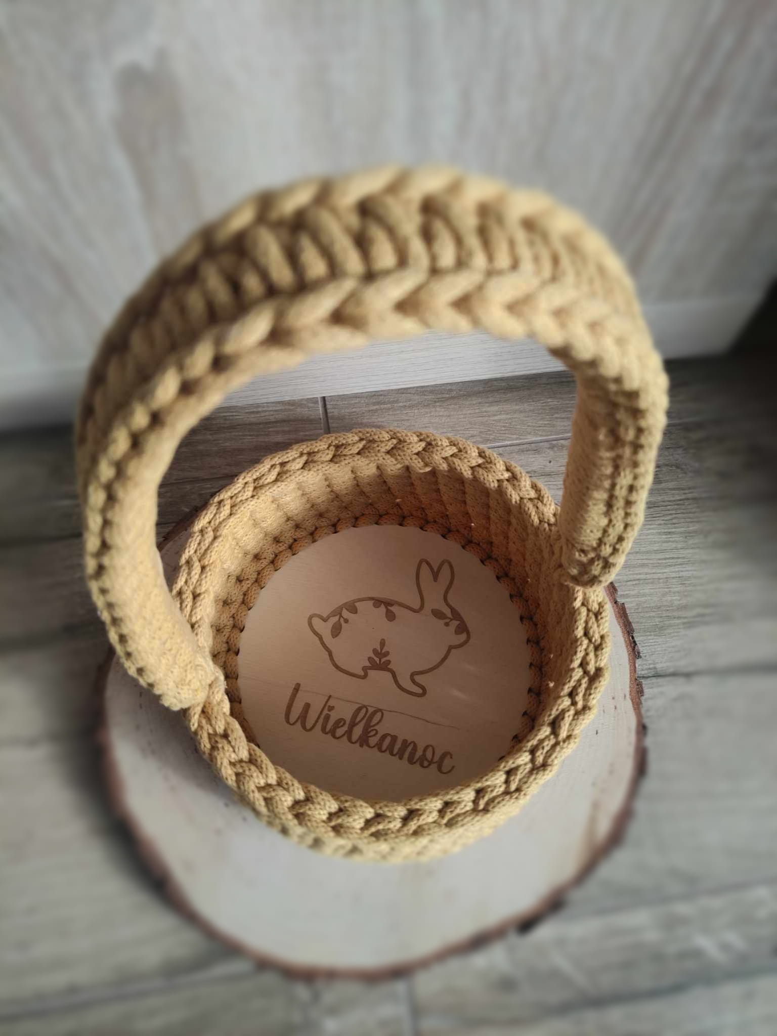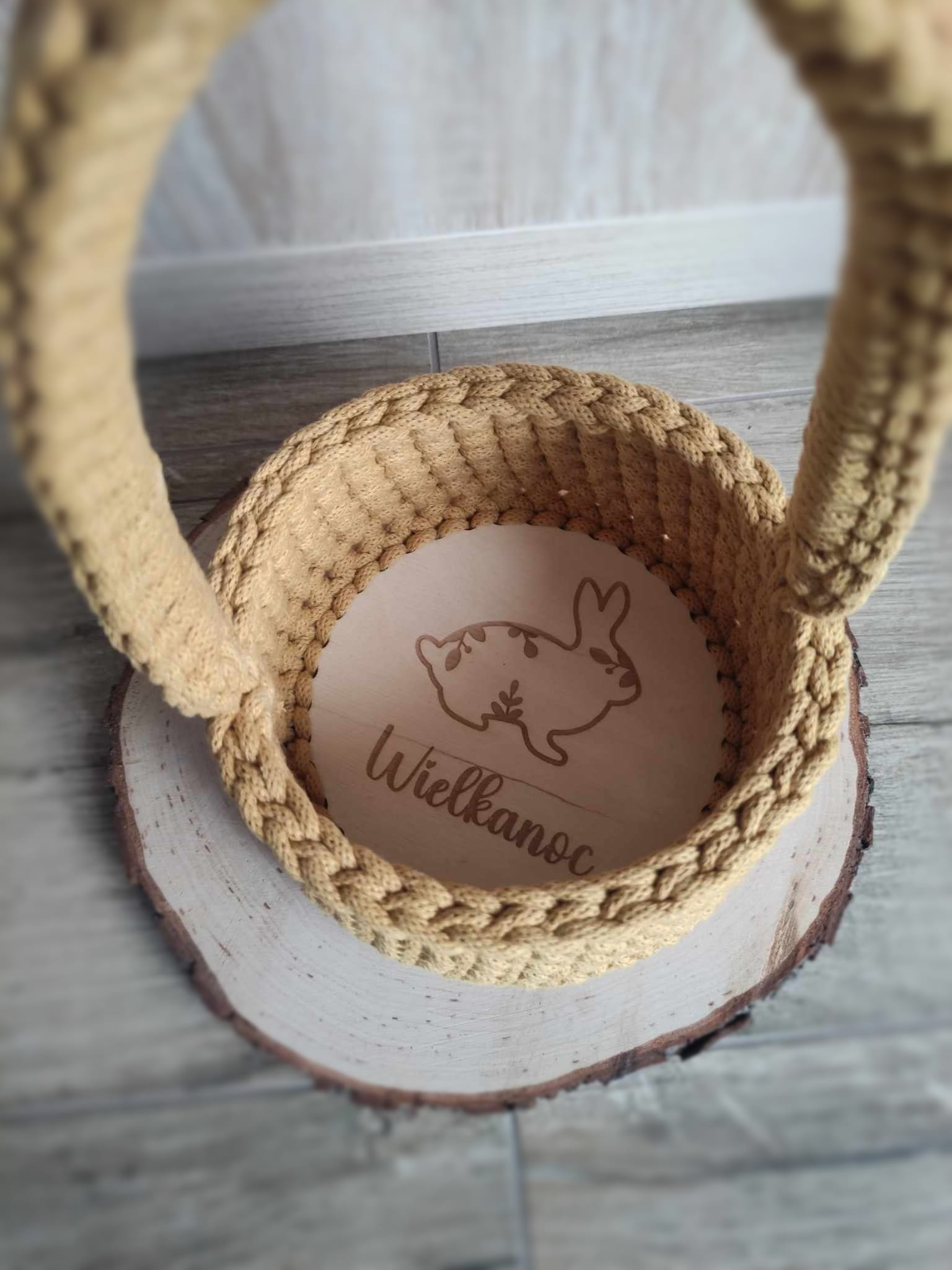 Pleciony ze sznurka koszyczek wielkanocny ścieg tkany– ręcznie wykonany z grawerem