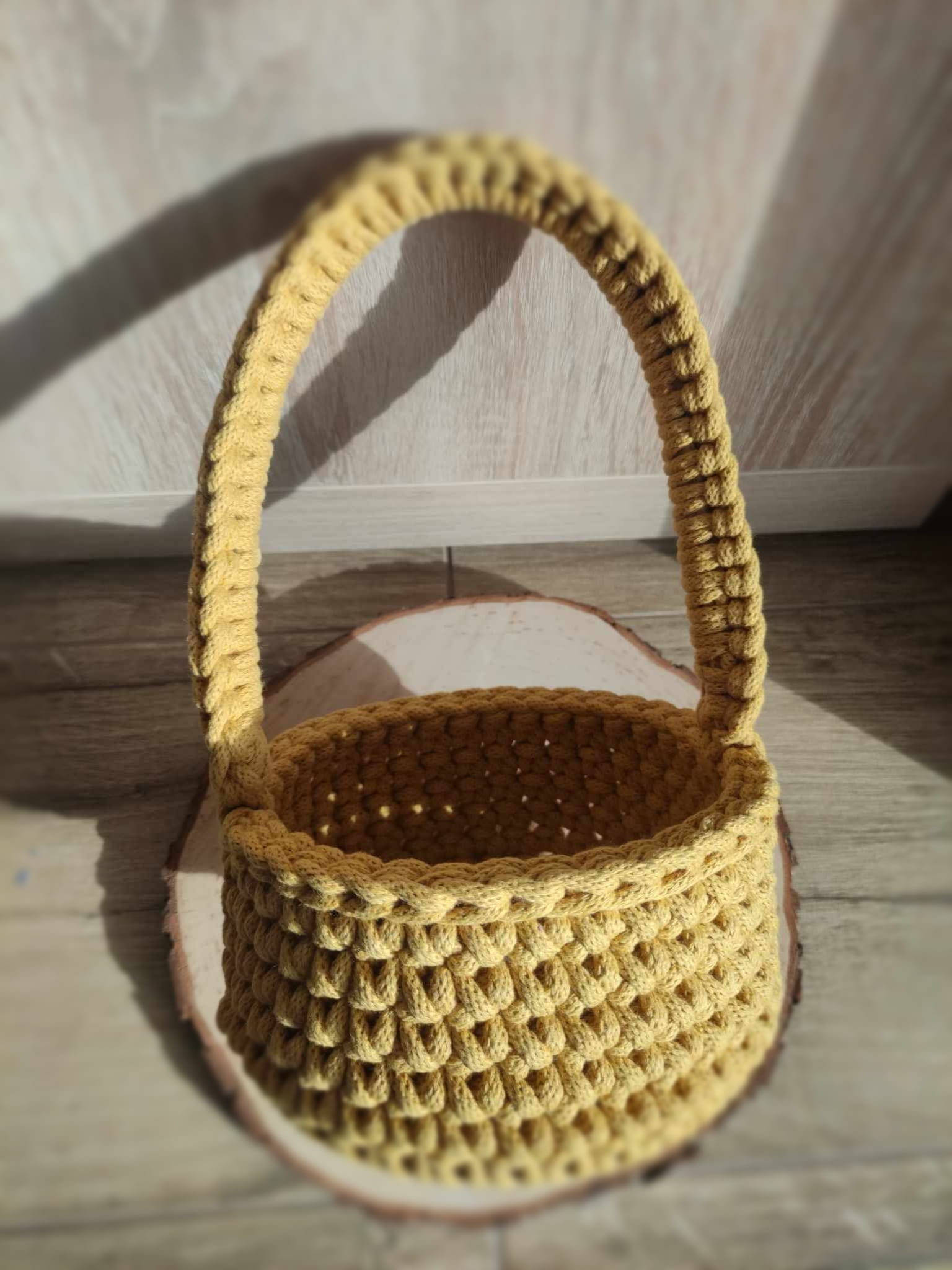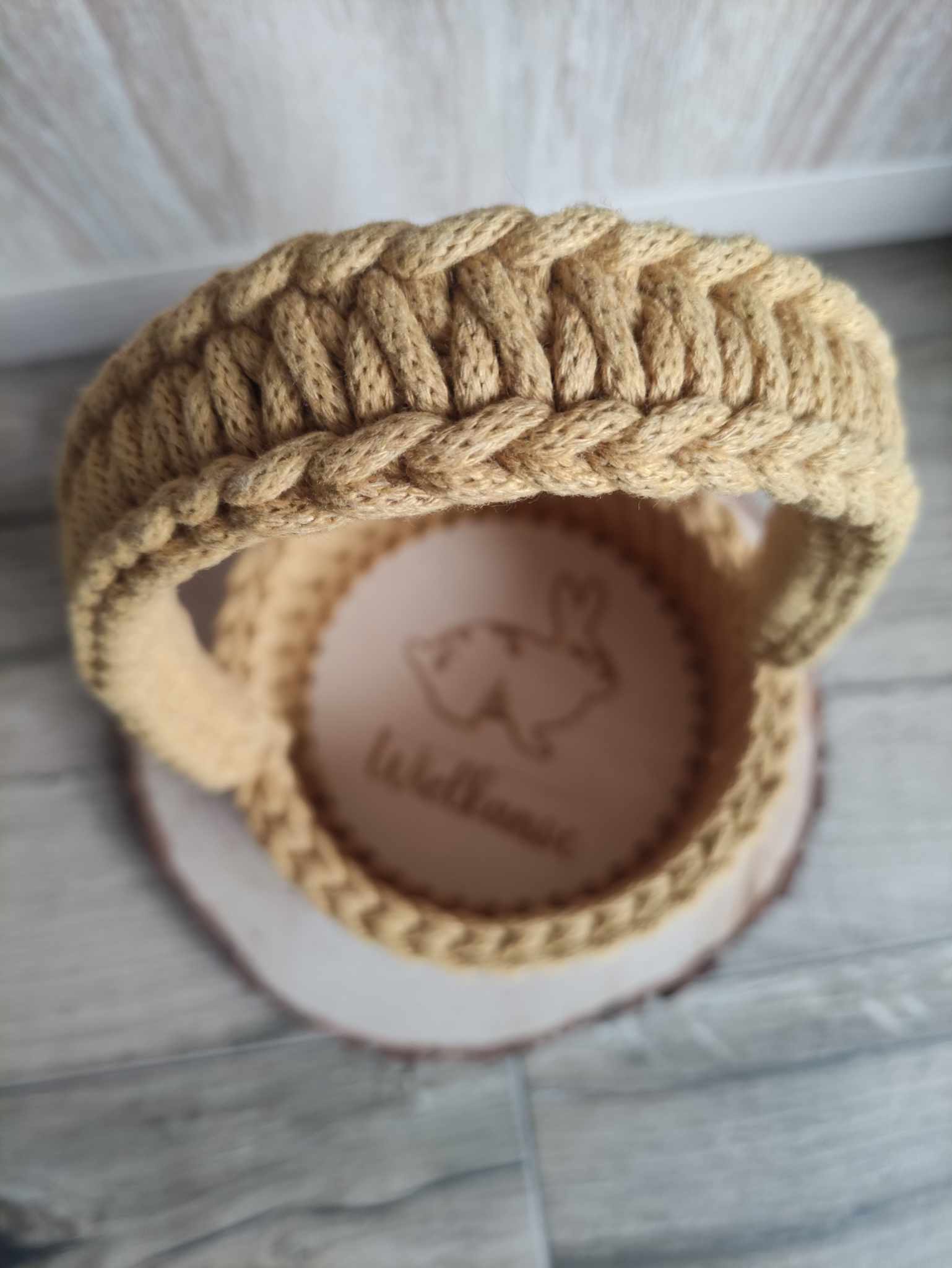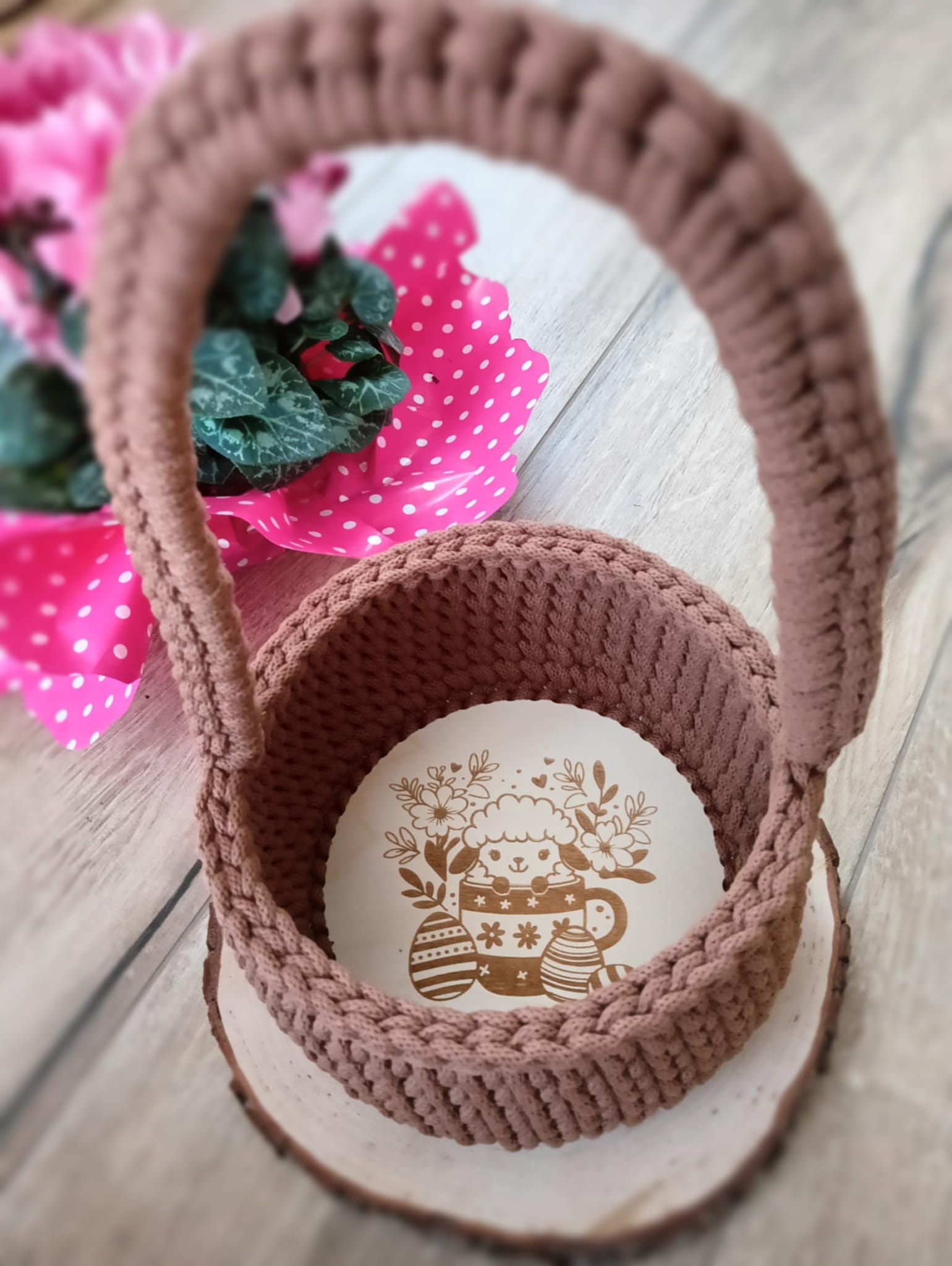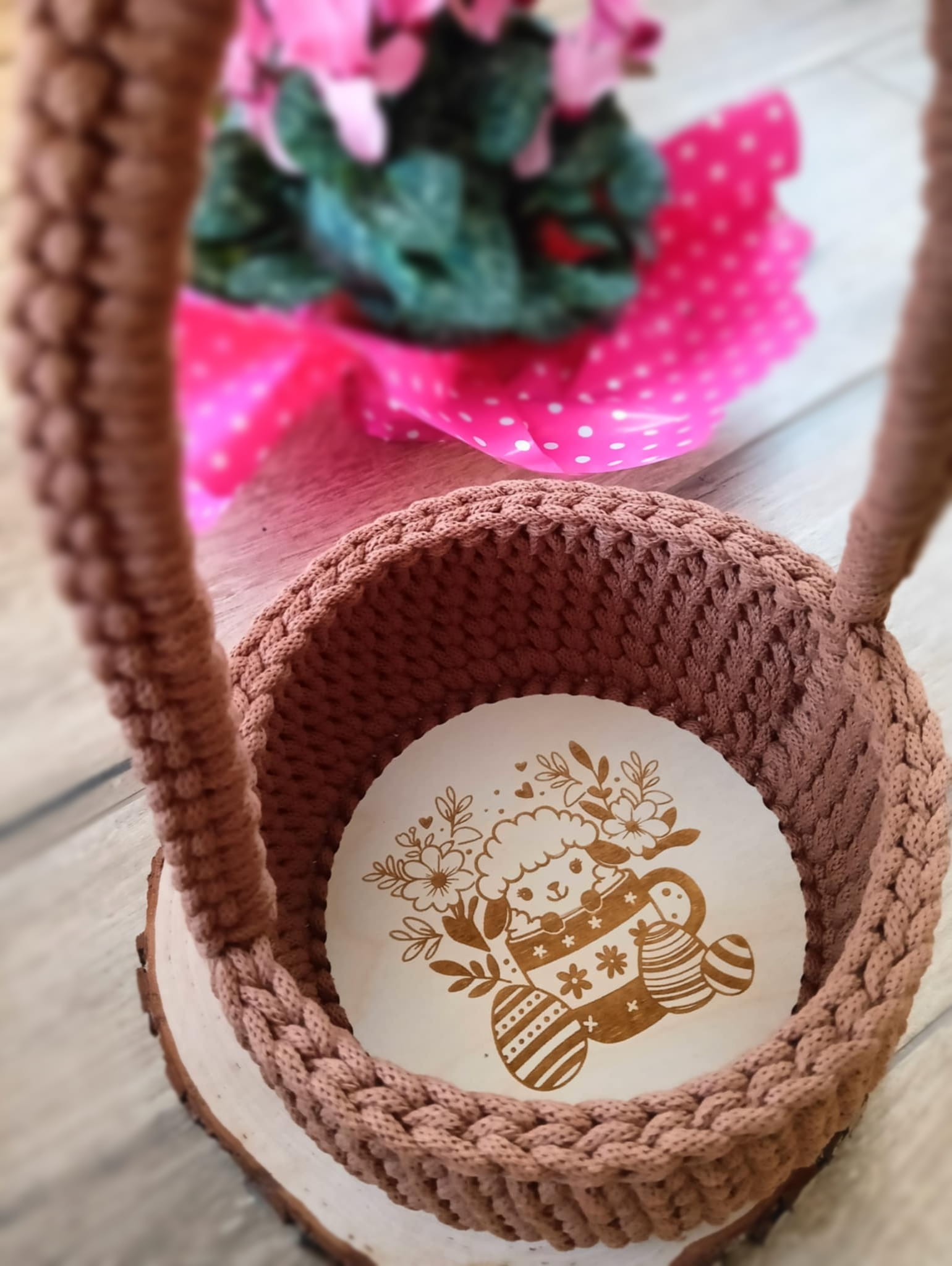 Pleciony ze sznurka koszyczek wielkanocny ścieg tkany– ręcznie wykonany z grawerem