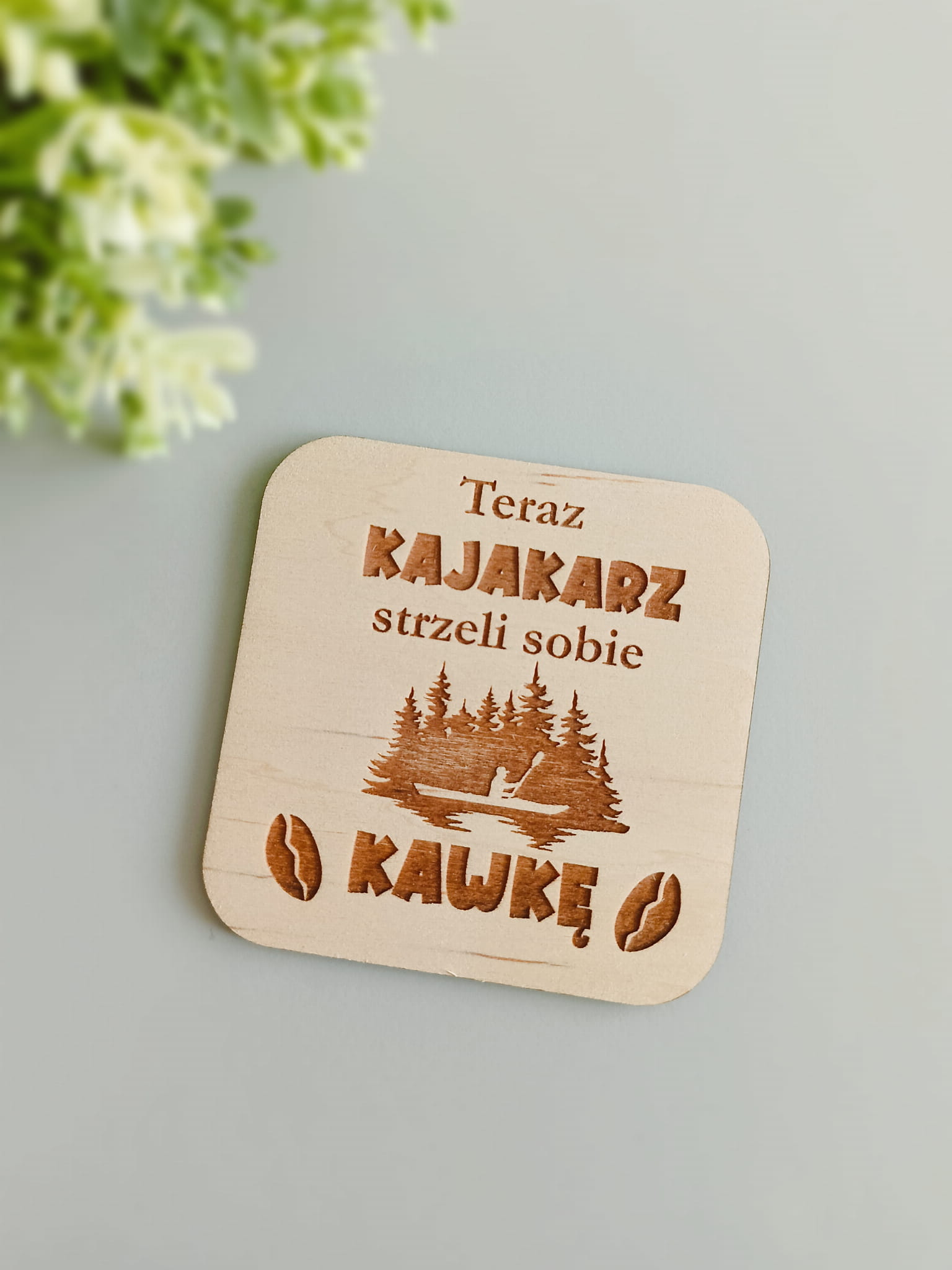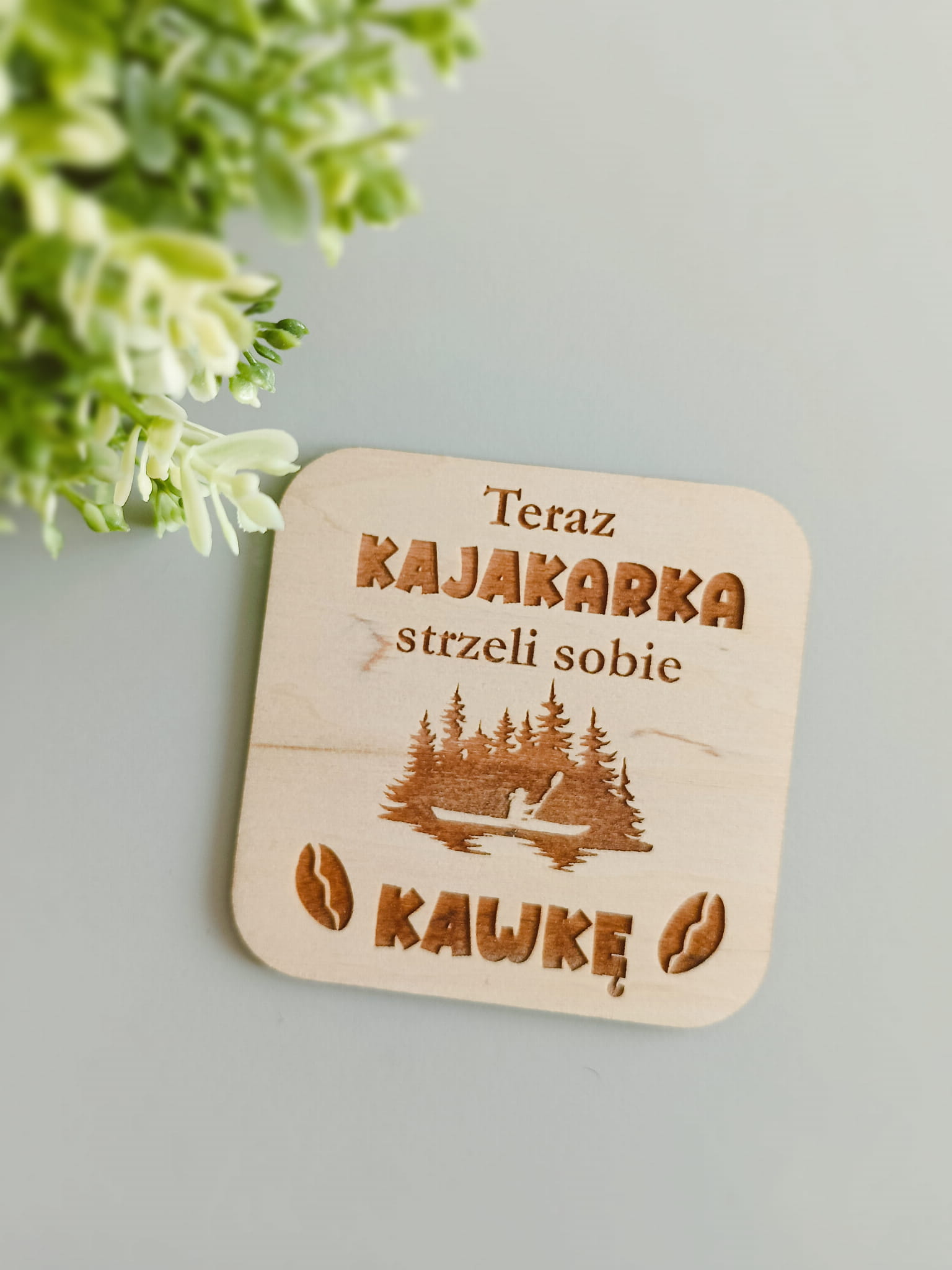 Drewniana podstawka z napisem i grafiką dla fanów i fanek kajaków.