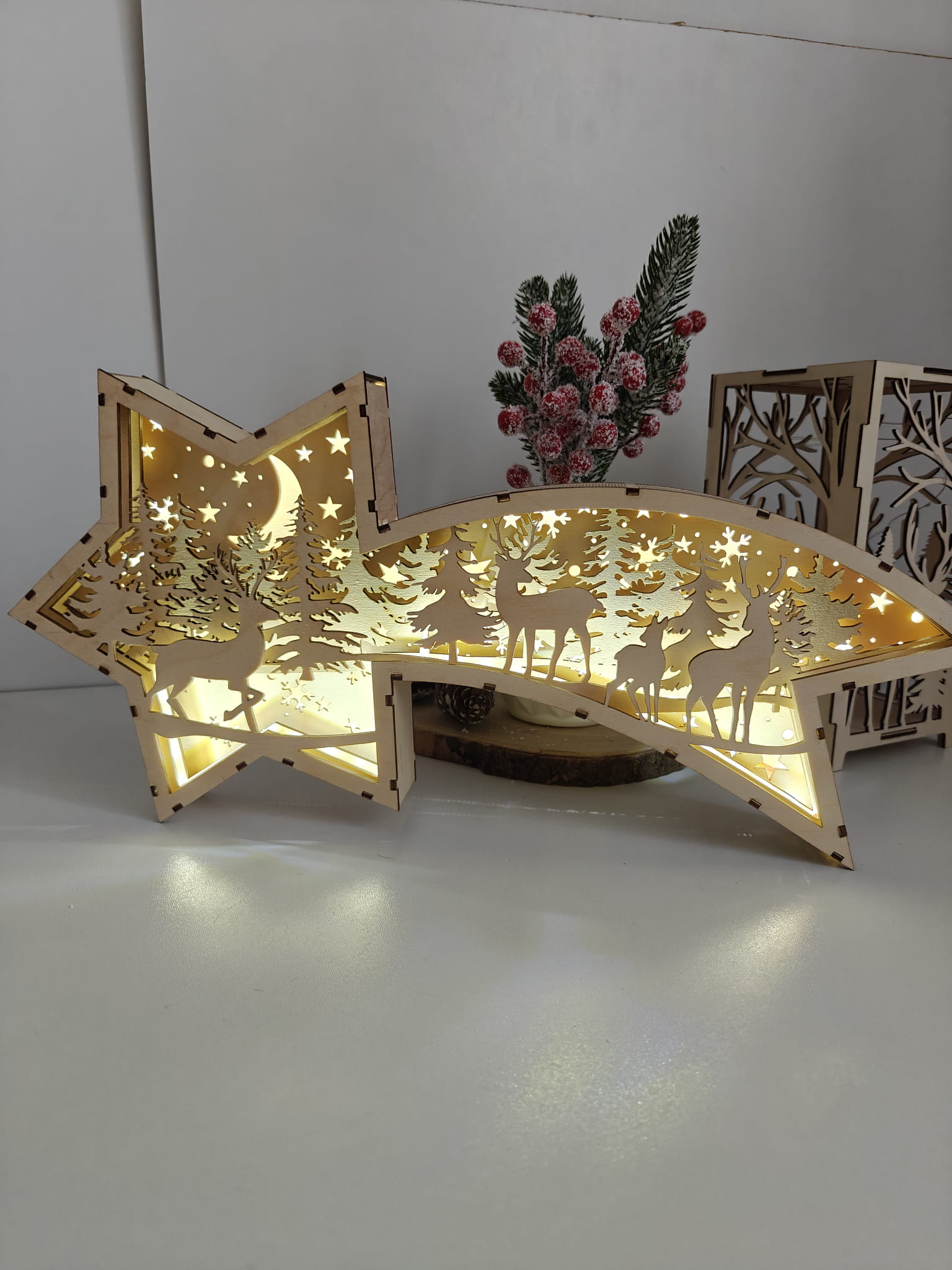Efektowna, podświetlana gwiazda LED wykonana ze sklejki to wyjątkowa dekoracja, która pięknie podkreśla świąteczny klimat wnętrza. Ażurowy wzór w połączeniu z zimny światłem LED tworzy nastrojową kompozycję, idealną do salonu, sypialni, pokoju dziecięcego lub na parapet.
