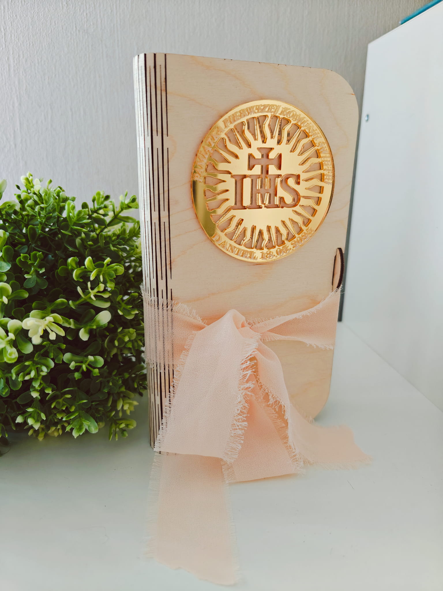 Wyjątkowe pudełko pamiątkowe na Pierwszą Komunię Świętą, wykonane ze sklejki, z grawerem oraz dekoracyjnymi złotymi aplikacjami 3D.