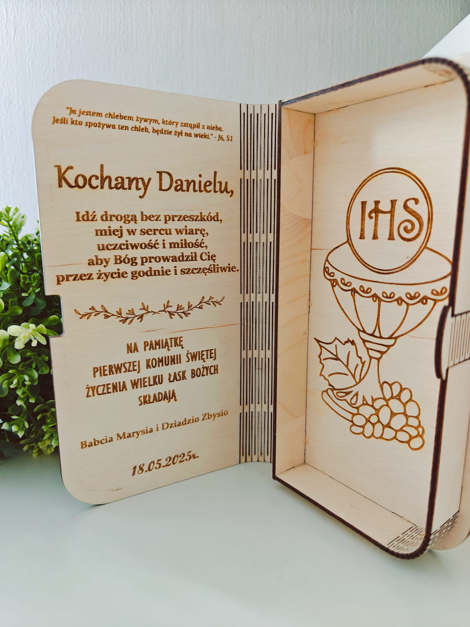 Zawiera symbol IHS – wyrazisty i estetyczny, co nadaje całości uroczysty charakter. W środku znajduje się miejsce na banknoty, dzięki czemu to nie tylko symboliczny upominek, ale również praktyczna forma podarunku. Możliwość pełnej personalizacji: imię dziecka, data uroczystości i dedykacja. Całość przewiązana elegancką wstążką. Idealna pamiątka dla chłopca lub dziewczynki.