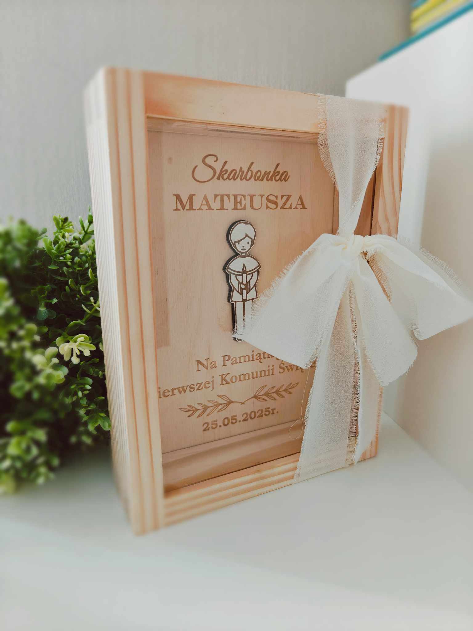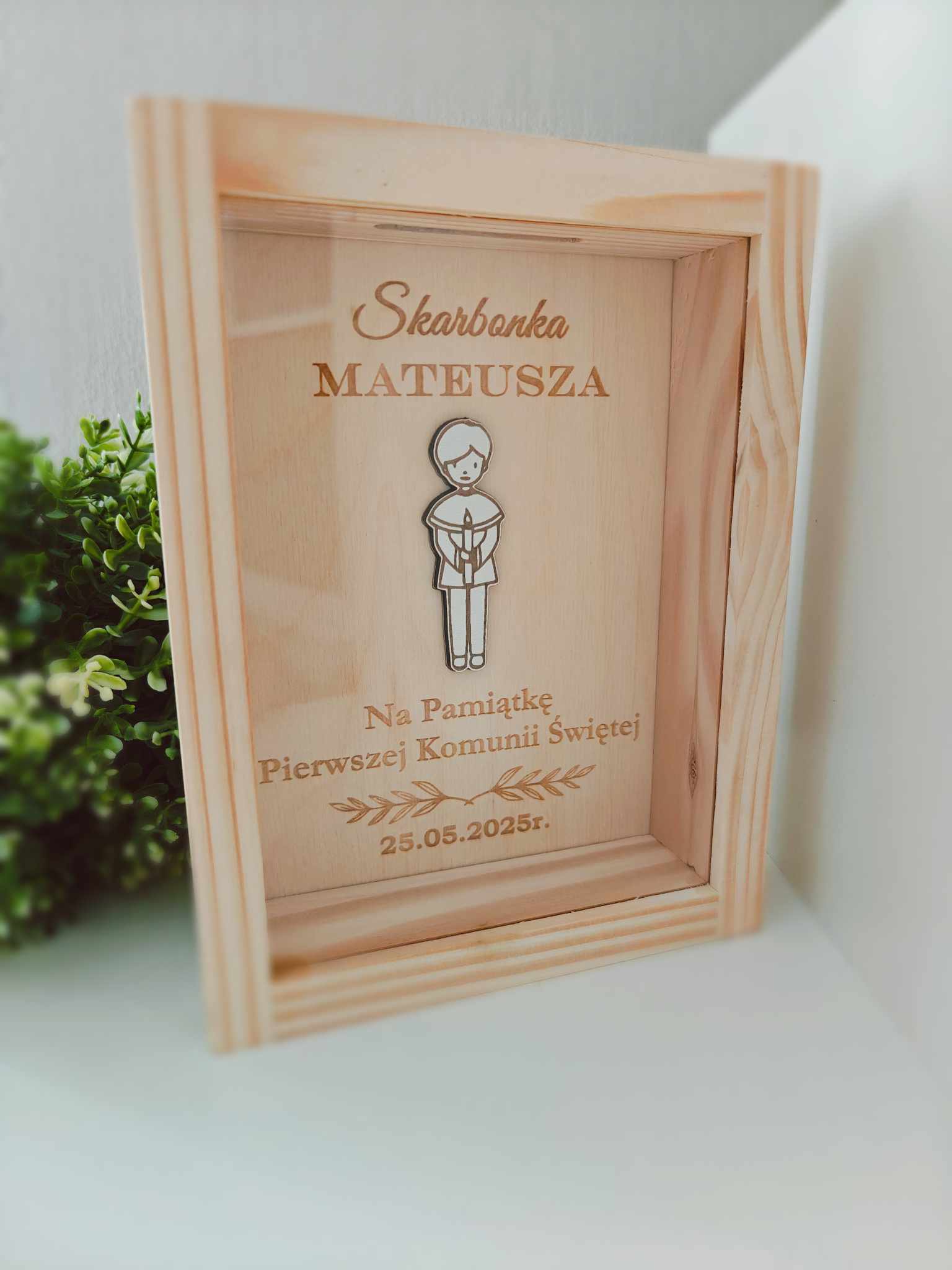 Skarbonka personalizowana drewniana Chłopiec- Pamiątka Pierwszej Komunii Świętej