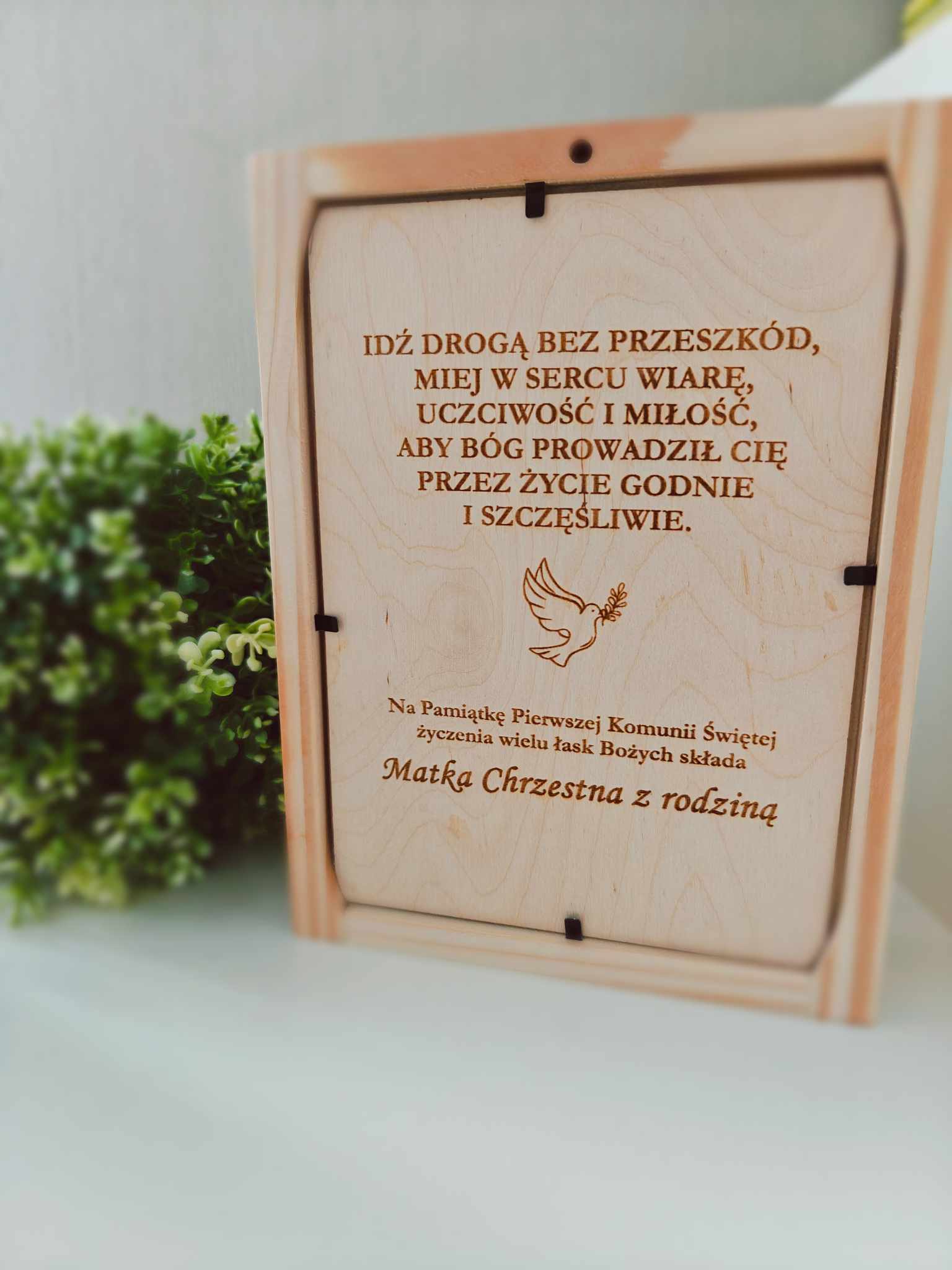 Wyjątkowa, drewniana skarbonka zaprojektowana z myślą o upamiętnieniu ważnego dnia – Pierwszej Komunii Świętej. To idealne połączenie symboliki sakramentu z funkcjonalnością. Skarbonka wykonana jest z naturalnego drewna, ozdobiona delikatną kokardą i posiada grawer z imieniem dziecka, datą uroczystości, .