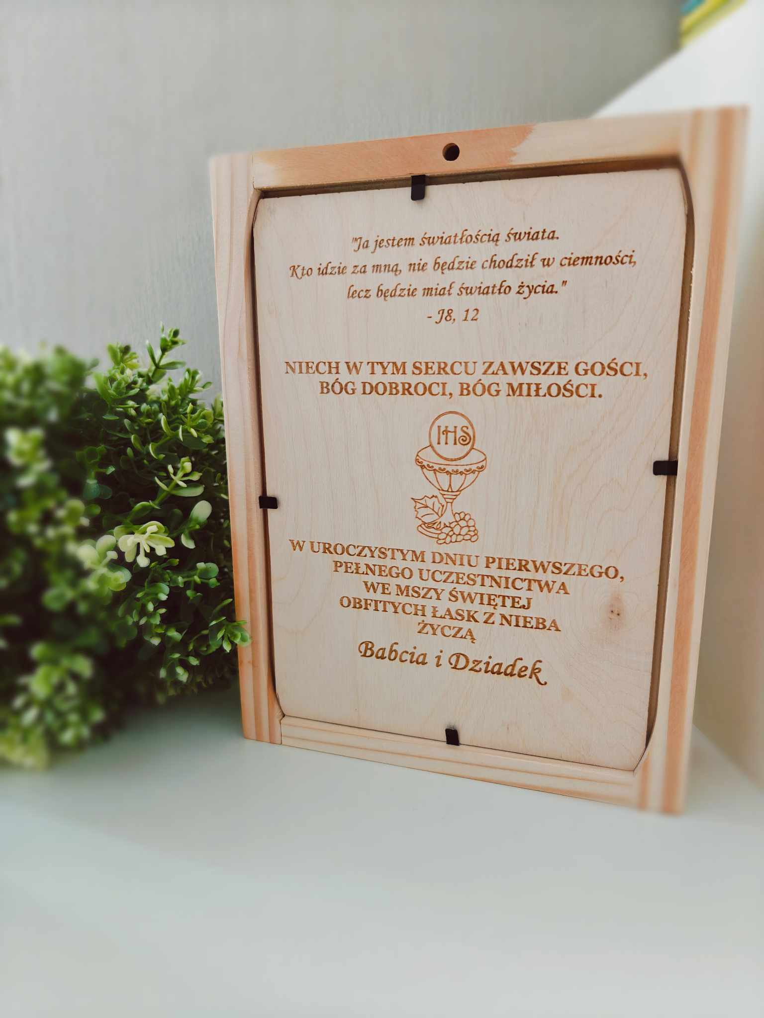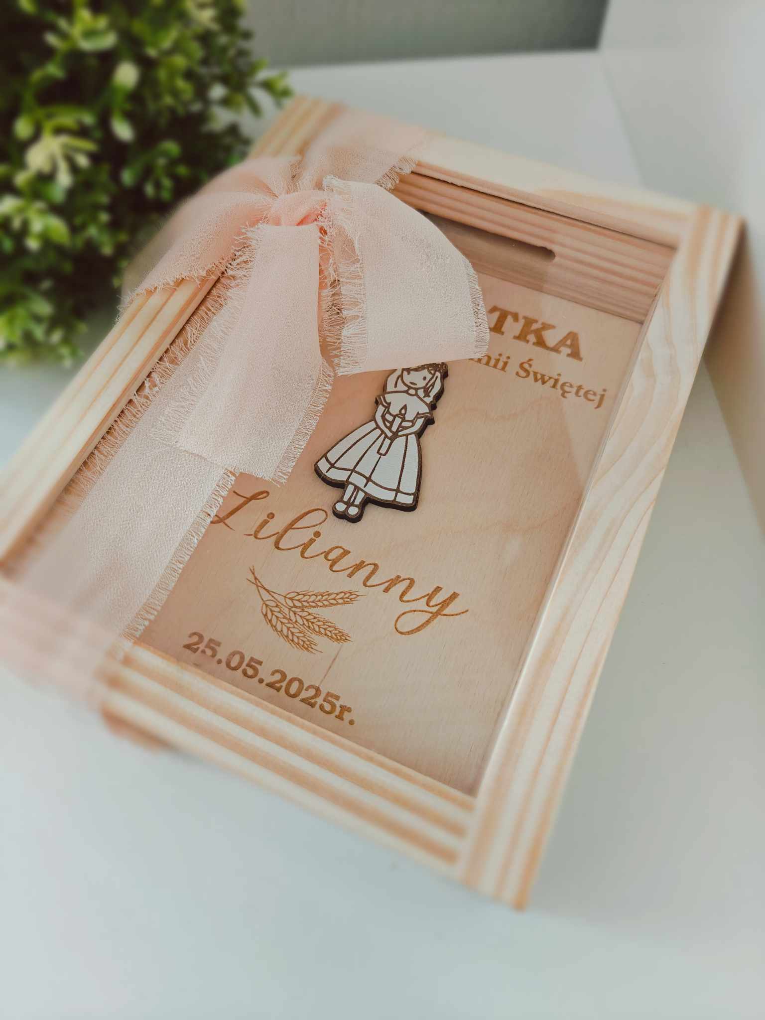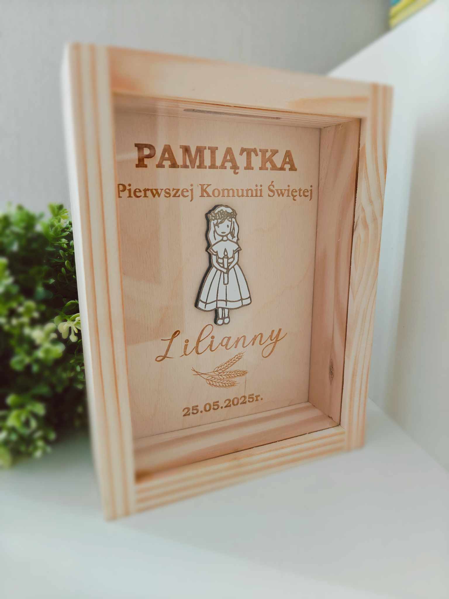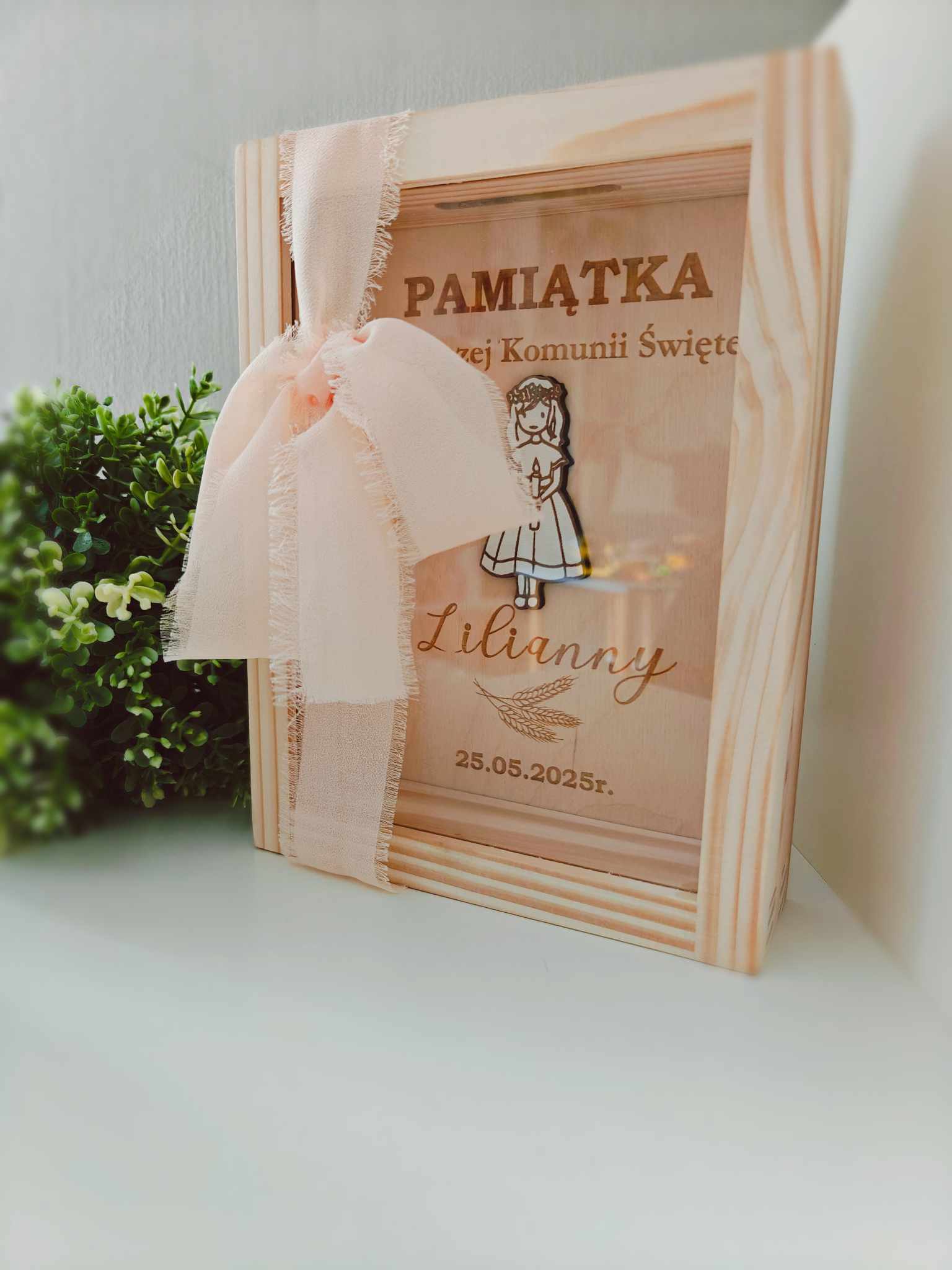Wyjątkowa, drewniana skarbonka zaprojektowana z myślą o upamiętnieniu ważnego dnia – Pierwszej Komunii Świętej. To idealne połączenie symboliki sakramentu z funkcjonalnością. Skarbonka wykonana jest z naturalnego drewna, ozdobiona delikatną kokardą i posiada grawer z imieniem dziecka, datą uroczystości, .