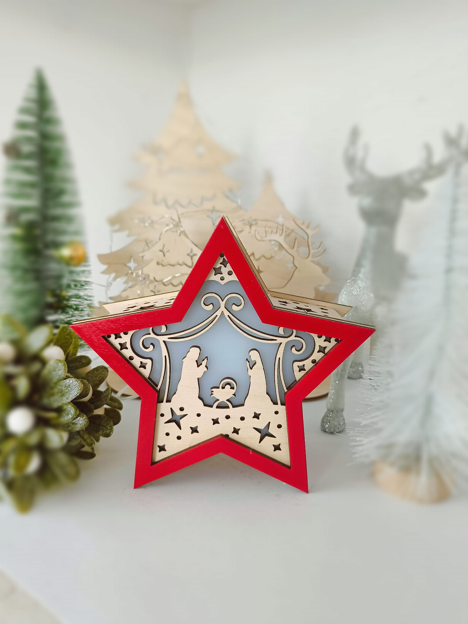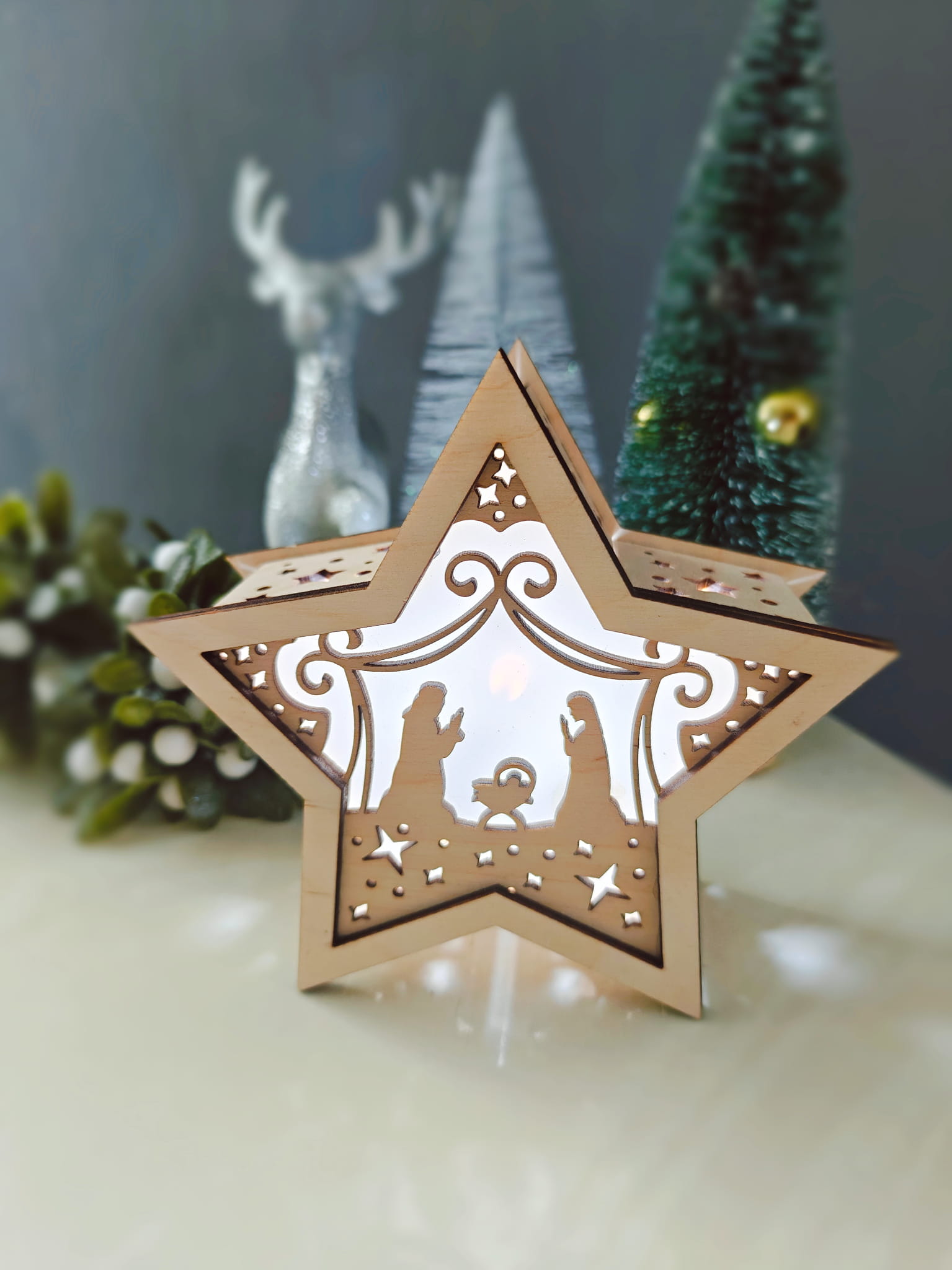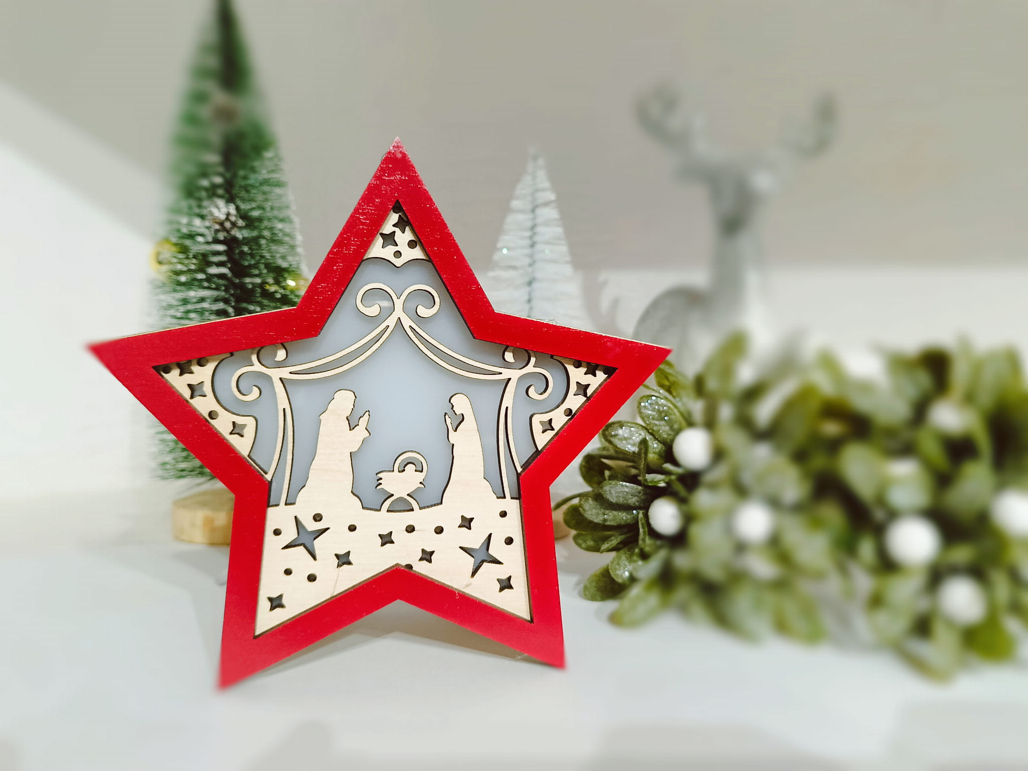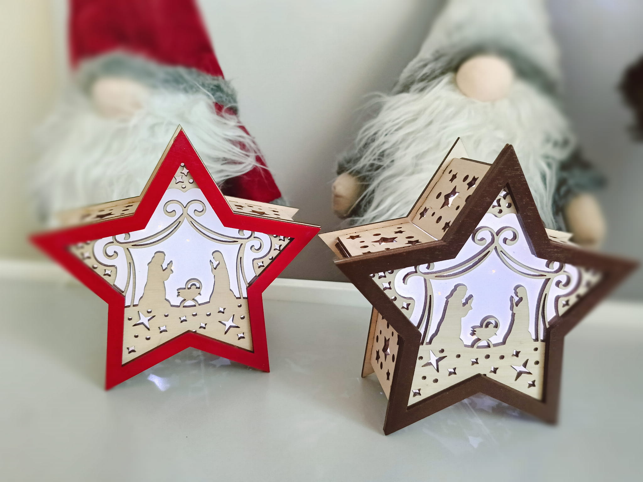 Stajenka- Podświetlana gwiazda 3D święcąca stojąca ozdoba świąteczna drewniana na Boże Narodzenie