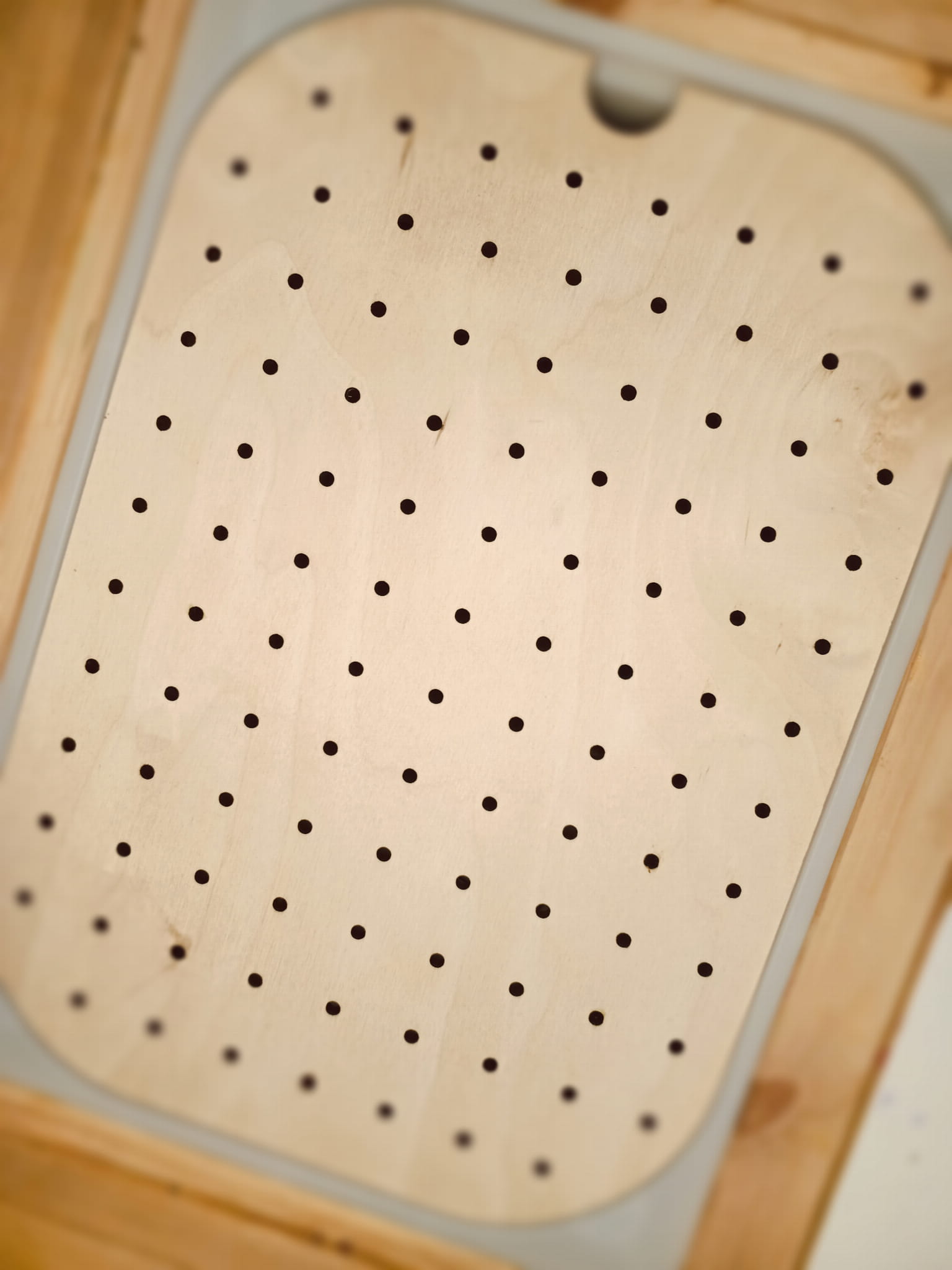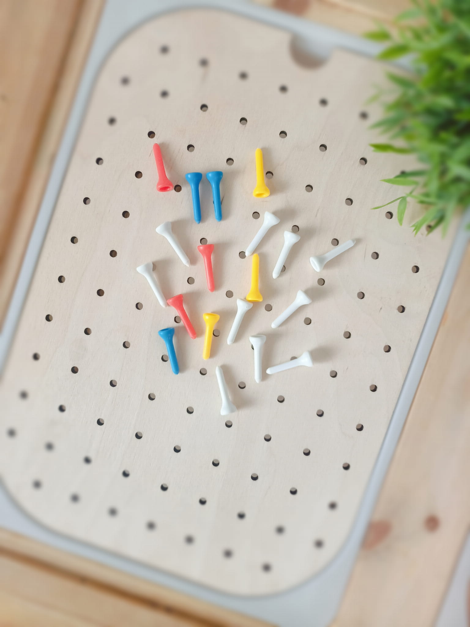 Tablica z wieloma otworami (peg board). Idealnie sprawdzi się do ćwiczenia motoryki małej, koordynacji oko- ręka oraz do rozwijania myślenia logicznego i kreatywności.