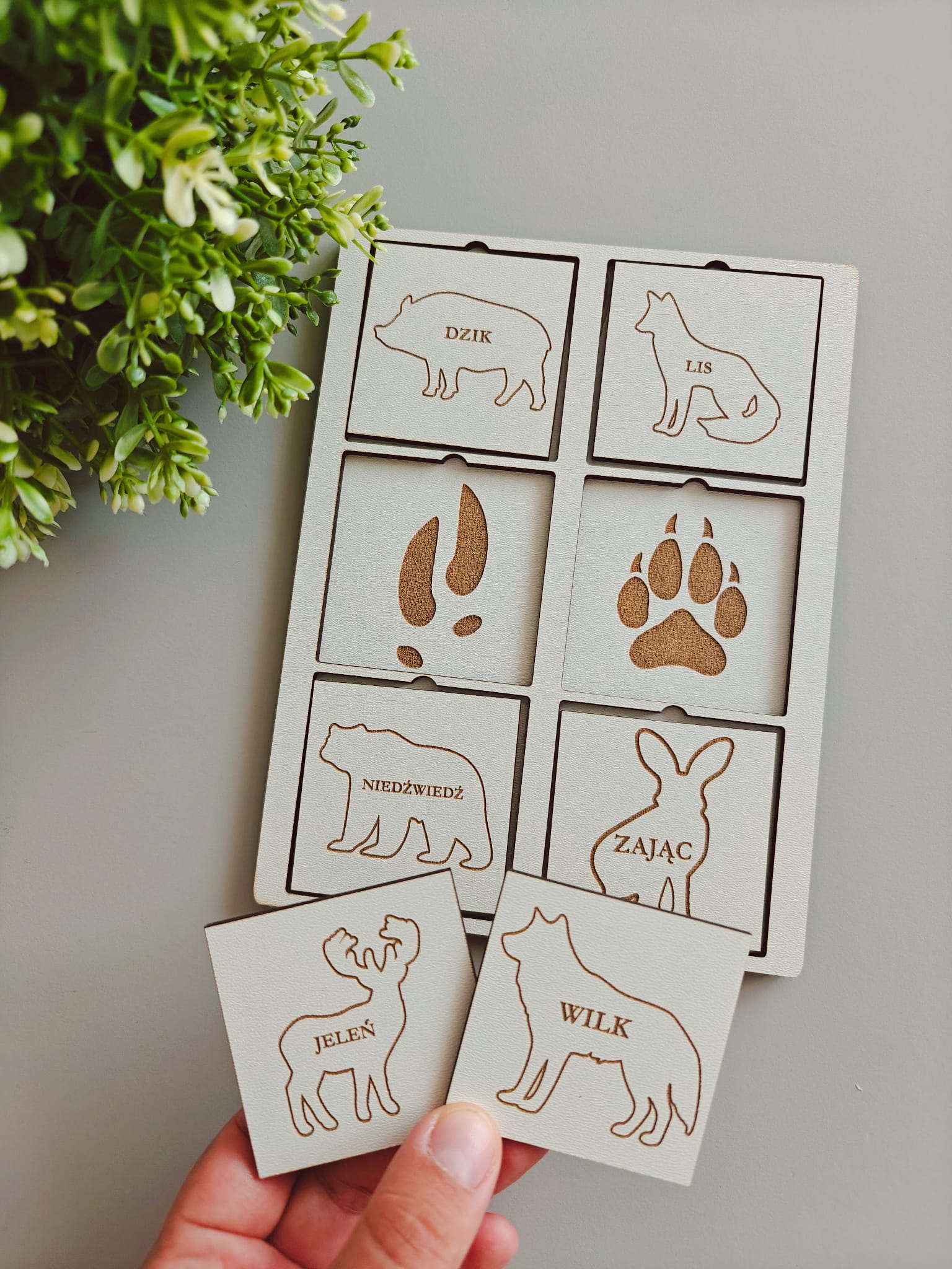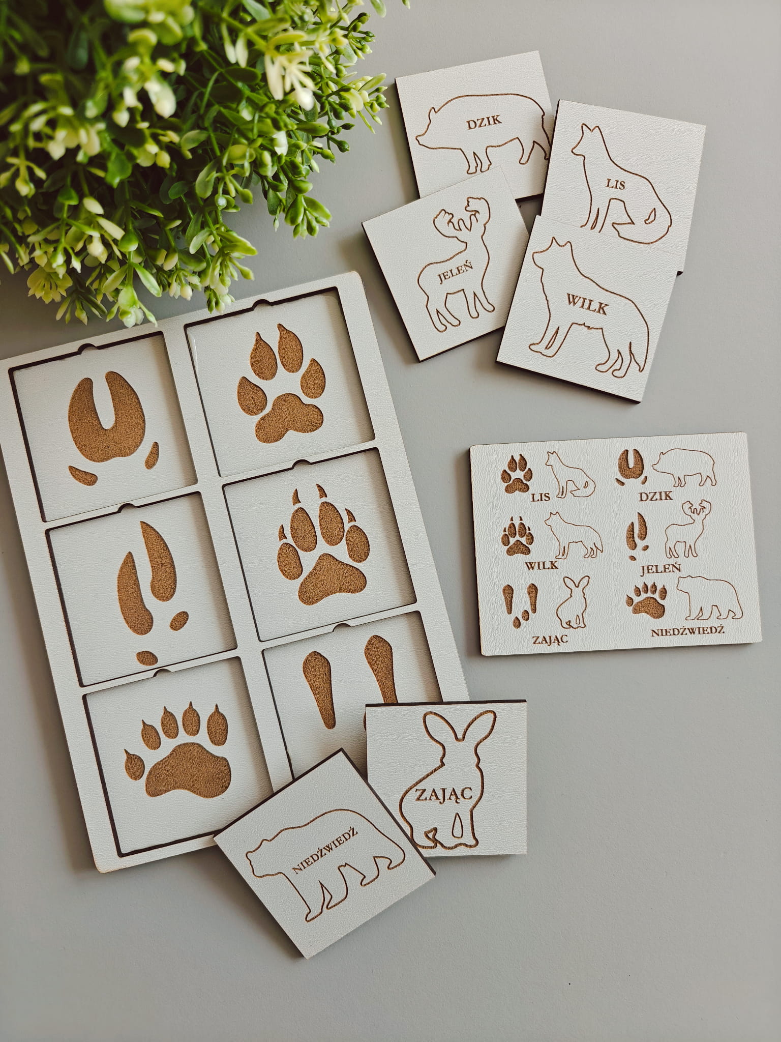 Wyjątkowa, drewniana układanka to doskonała pomoc dydaktyczna dla dzieci w wieku przedszkolnym i wczesnoszkolnym. Zadaniem dziecka jest dopasowanie tropów do odpowiednich zwierząt – dzięki temu uczy się rozpoznawać ślady, jakie zostawiają w lesie wilk, lis, jeleń, dzik, zając czy niedźwiedź.